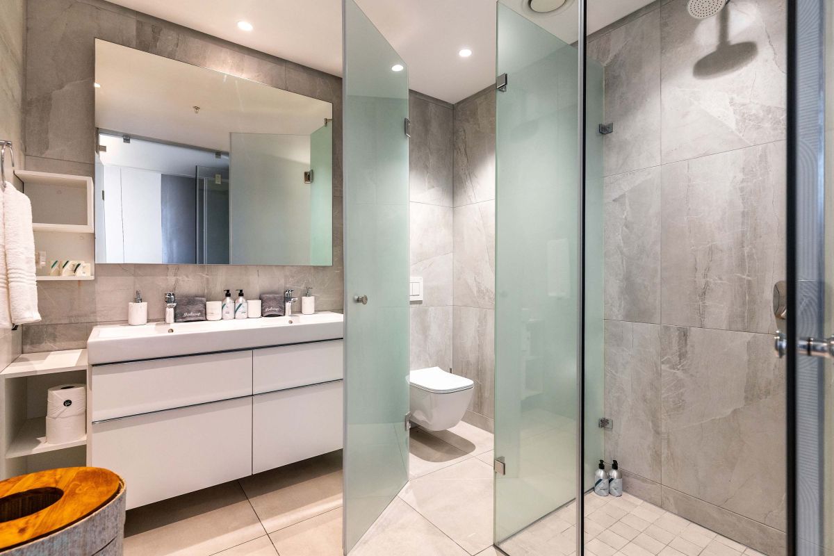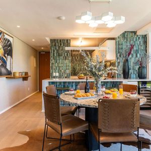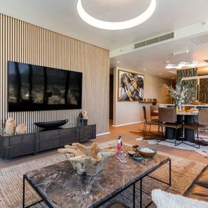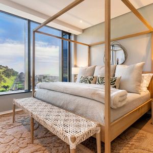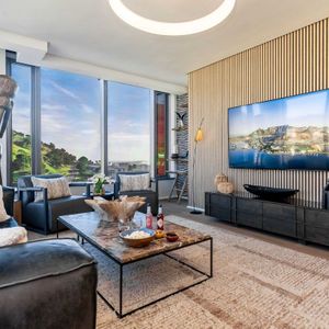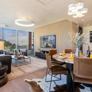 This newly refurbed, sun-drenched apartment features expansive floor-to-ceiling windows that reveal stunning views of both the ocean and the city’s skyline.