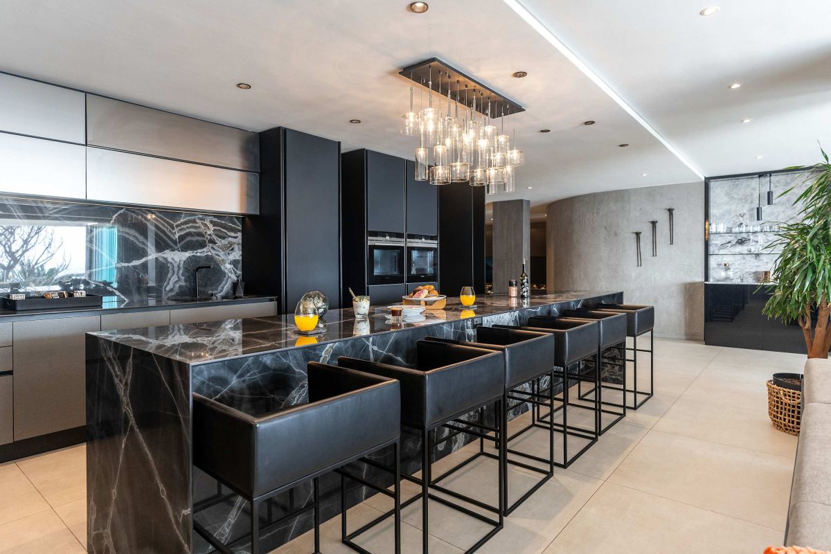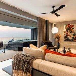 From the secure parking garage, a short stairway leads you into an open-plan living area where style meets functionality. The space features contemporary furnishings and striking artwork, while large glass doors fold away to reveal an expansive, shaded balcony. Outfitted with a jacuzzi, comfortable seating, and sun loungers, the balcony is the perfect spot to take in the stunning 180-degree views of the ocean.