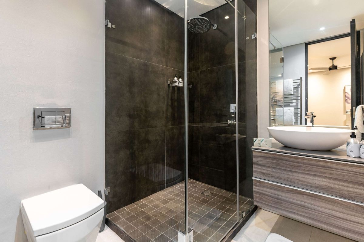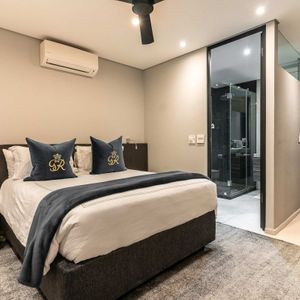 The third bedroom, also with a queen-sized bed, includes air-conditioning, a smart TV, built-in wardrobes, and a well-appointed en-suite bathroom with a spacious rain shower.