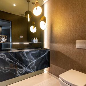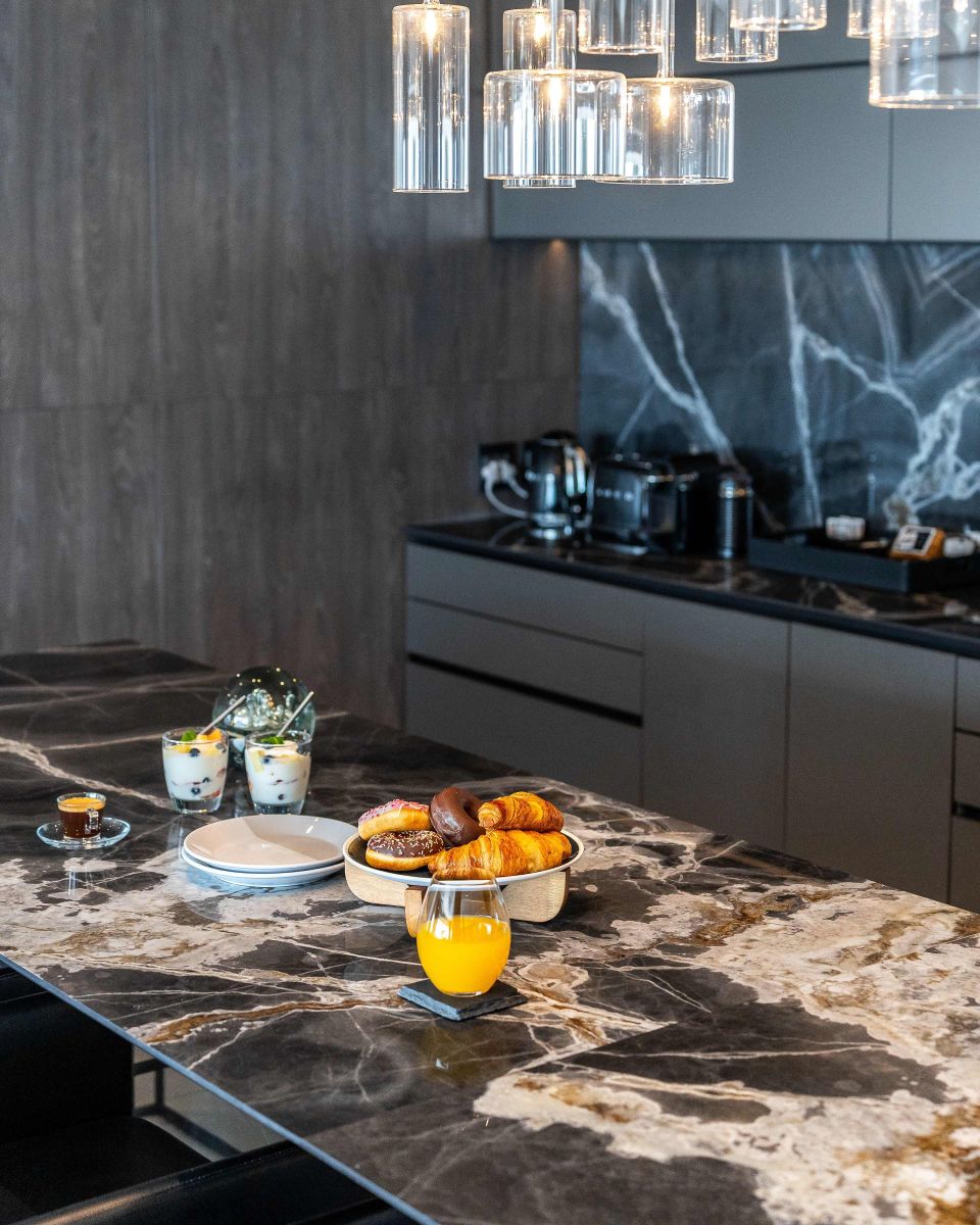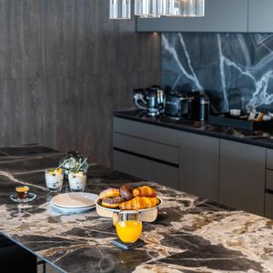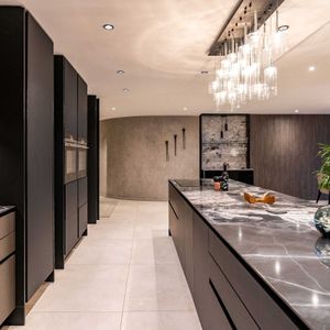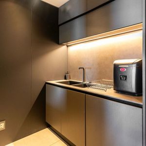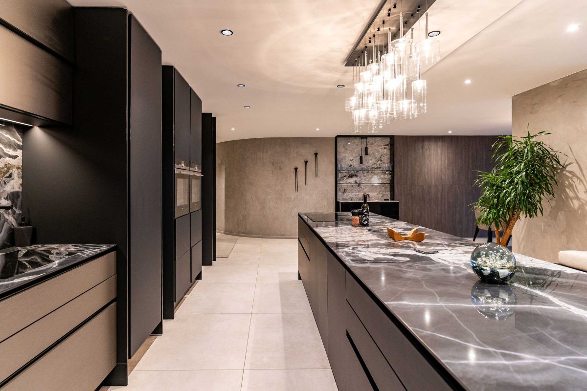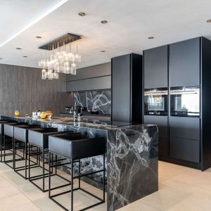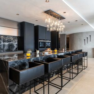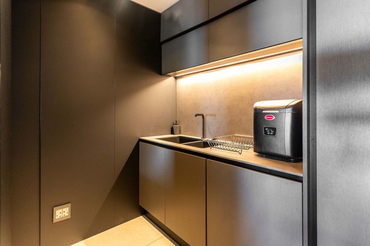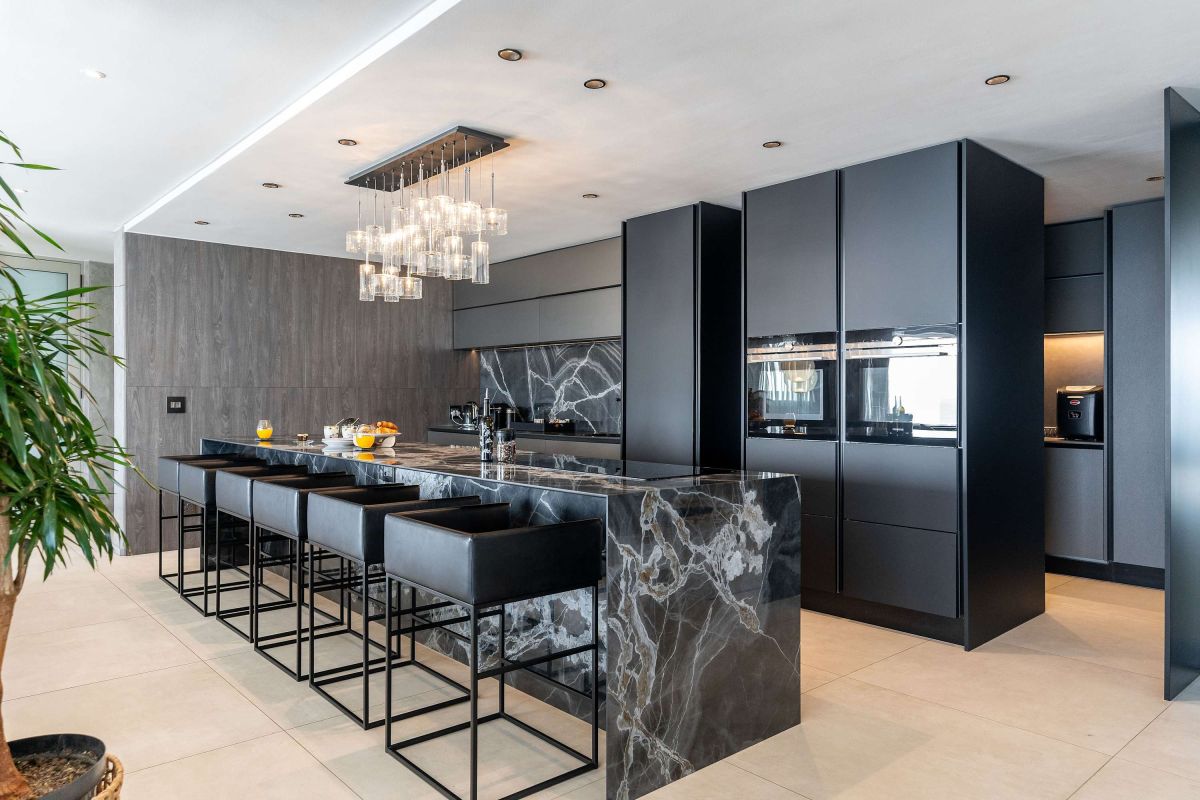 The sleek kitchen flows seamlessly from the living area, equipped with top-tier appliances and generous storage space. A hidden scullery with an ice maker ensures that everything you need is right at hand.
