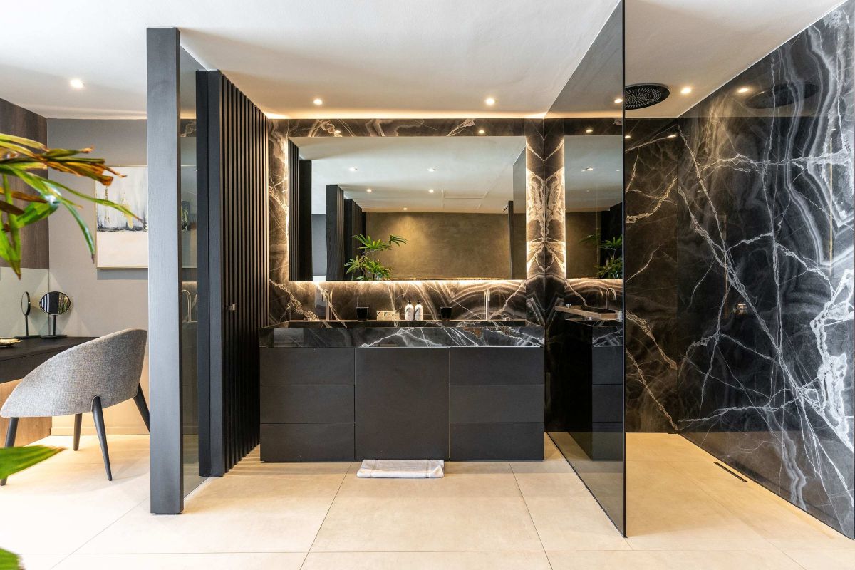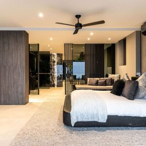 Each of the three bedrooms provides a peaceful retreat, complete with private en-suite bathrooms. The master bedroom offers a king-size bed, a walk-in closet, and a luxurious open-plan bathroom with a soaking tub, rain shower, and double vanities. The master suite opens onto the balcony, delivering awe-inspiring views of both the ocean and surrounding mountains. The room also includes air conditioning and a flat-screen smart TV for ultimate relaxation.