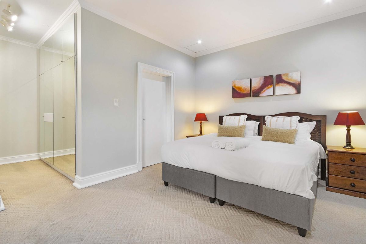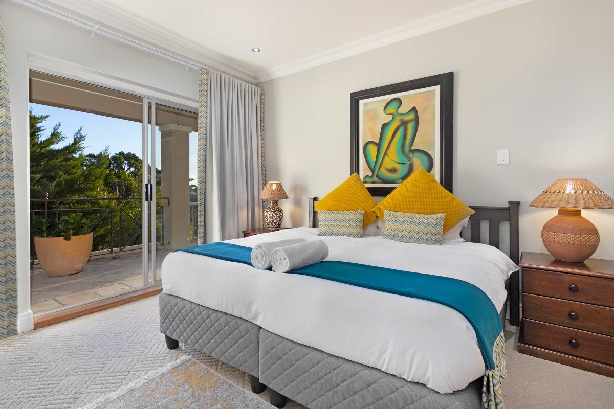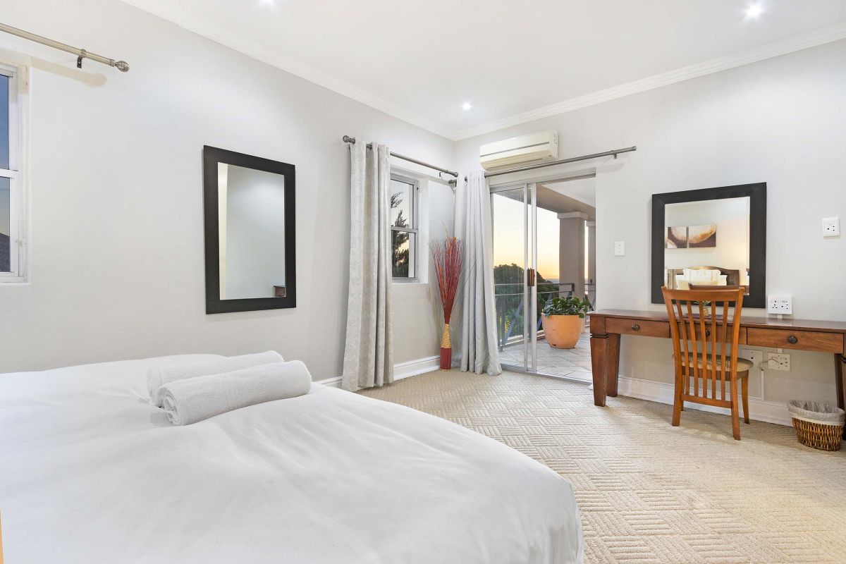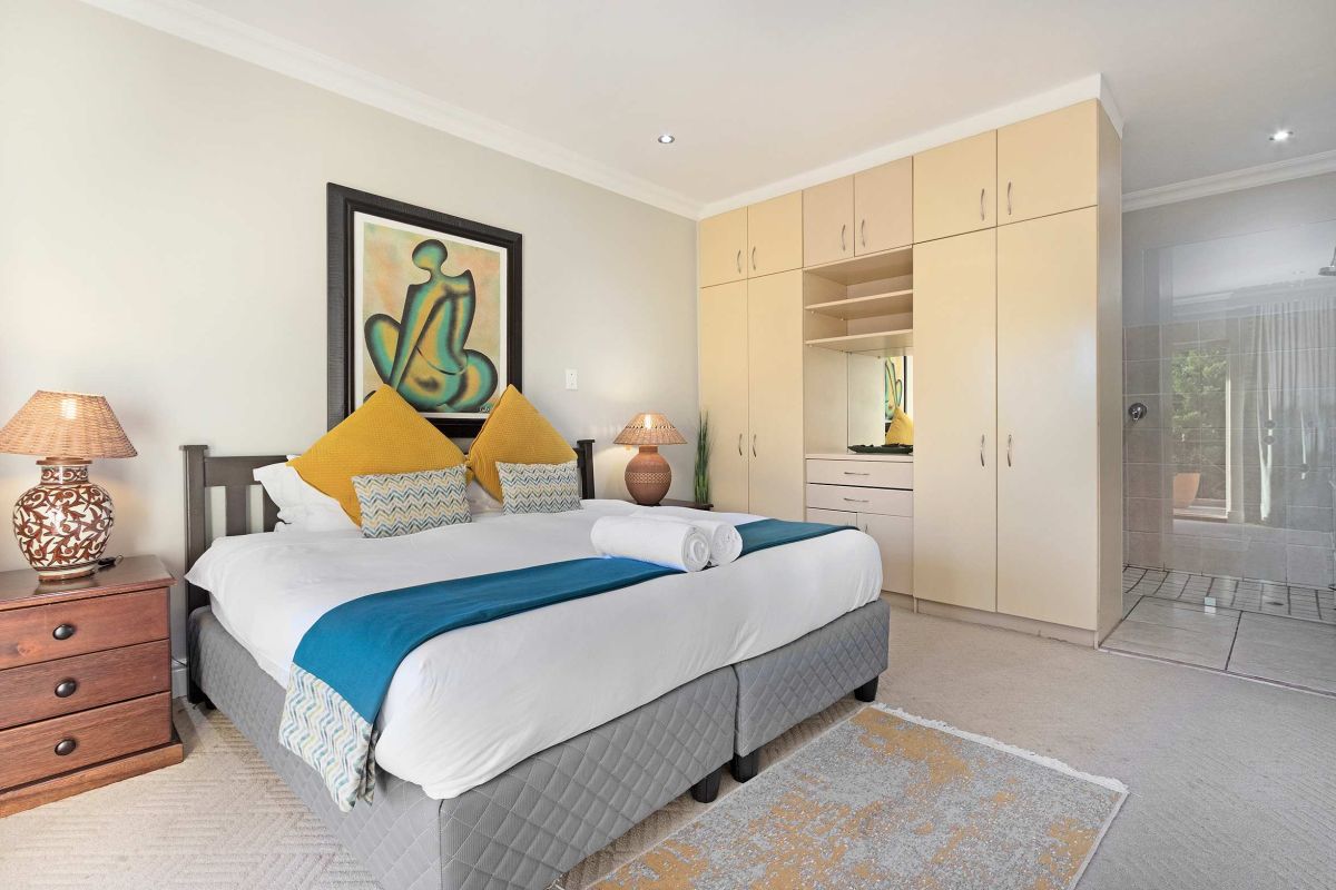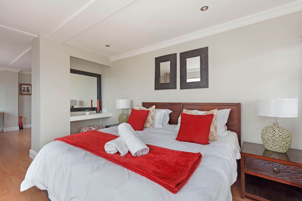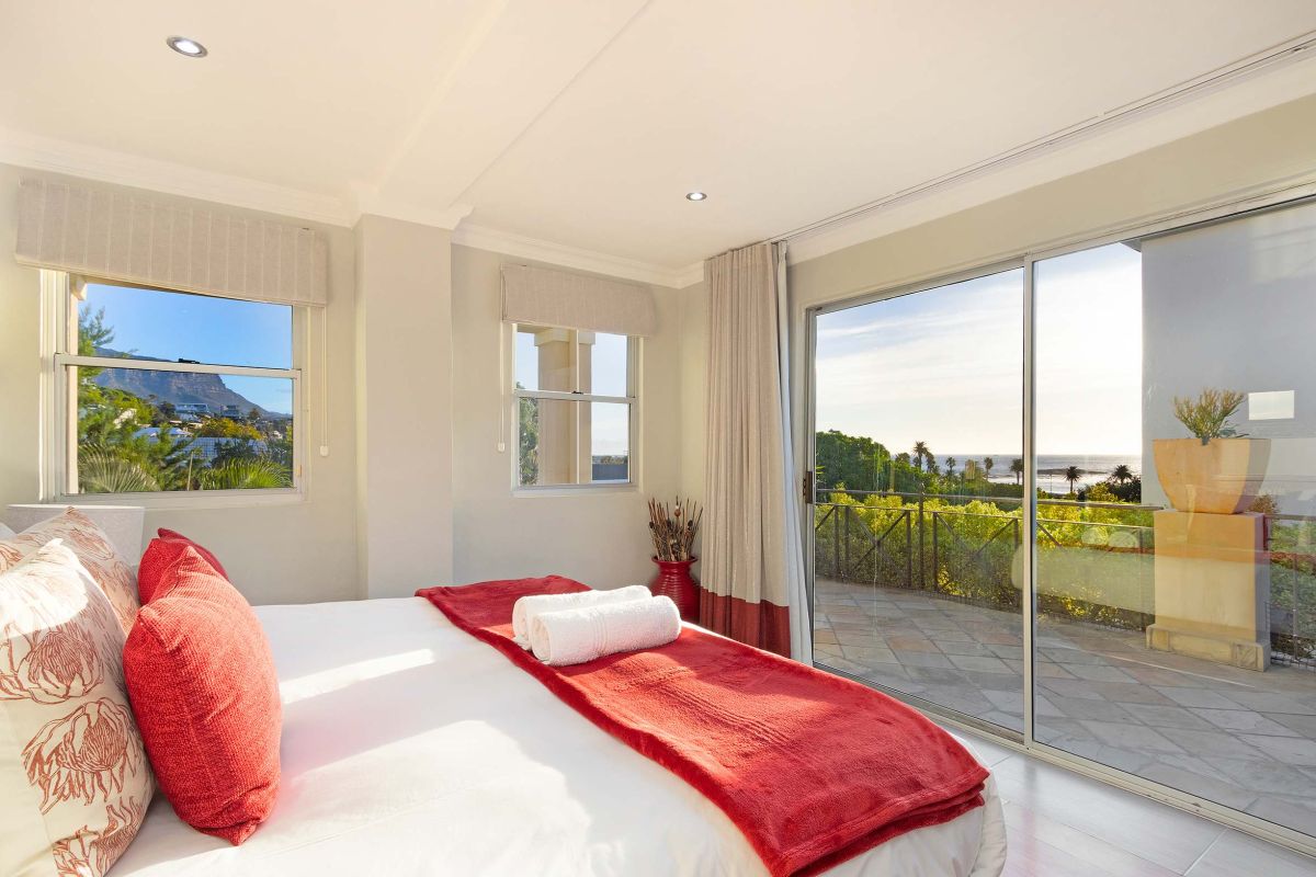 The master bedroom is spacious and light with a king-size bed (which can be converted to twin beds), an en-suite bathroom with a walk-in double shower, bathtub, double vanities, and a private sitting area with a plush couch. The master bedroom has air-conditioning and access to a shared balcony with views over Camps Bay.