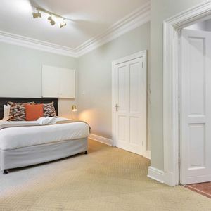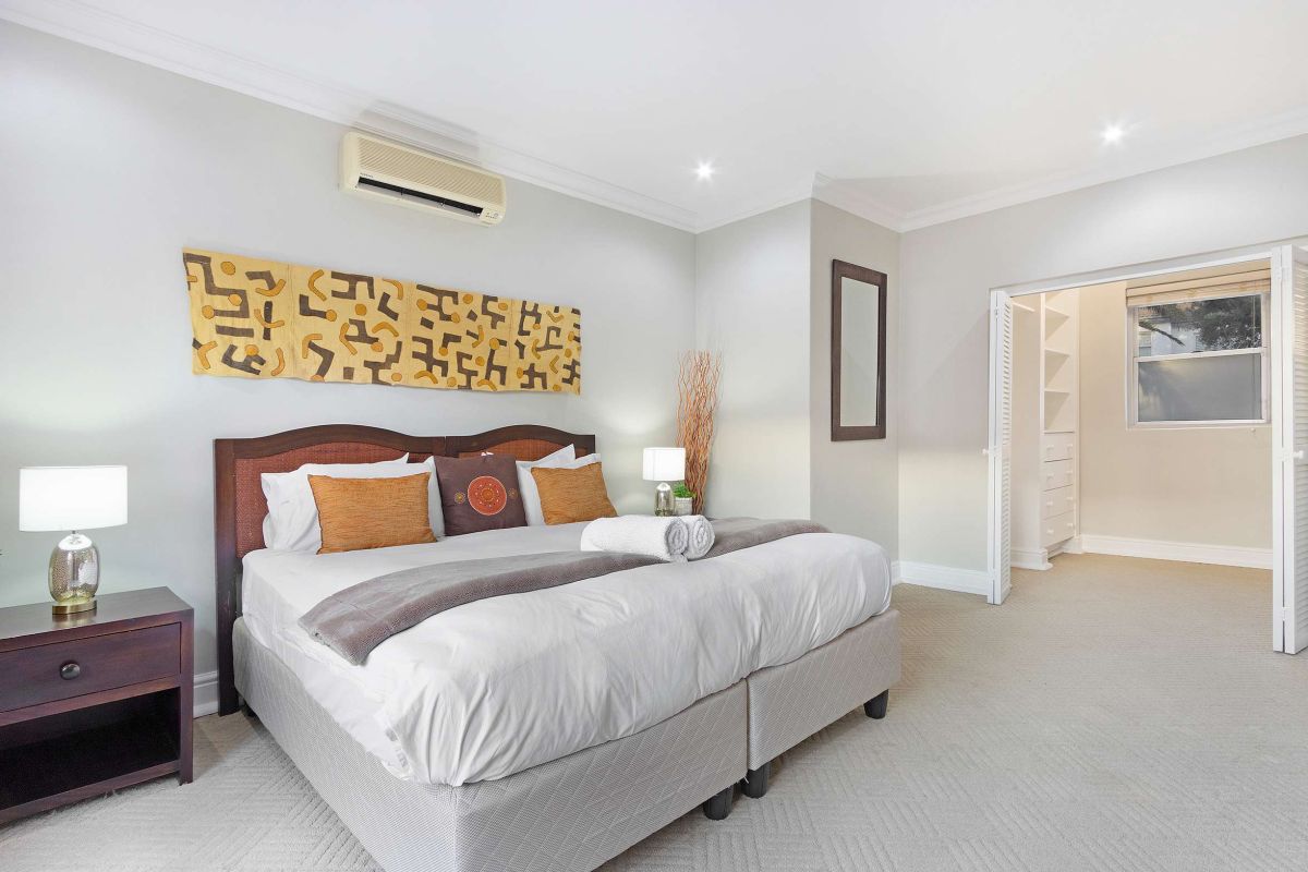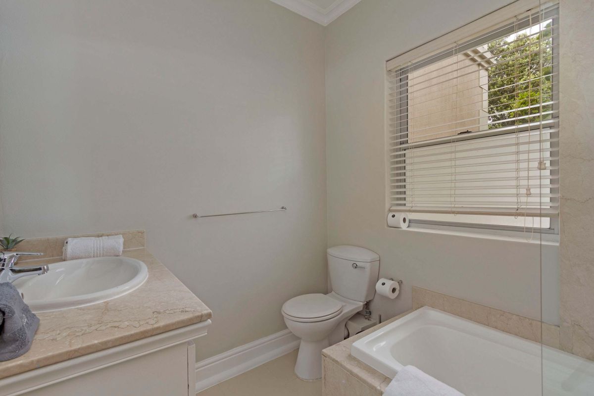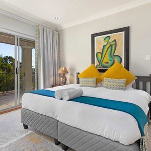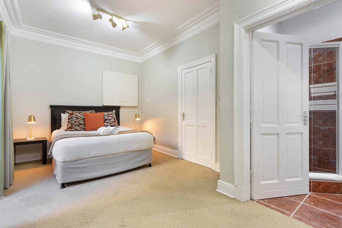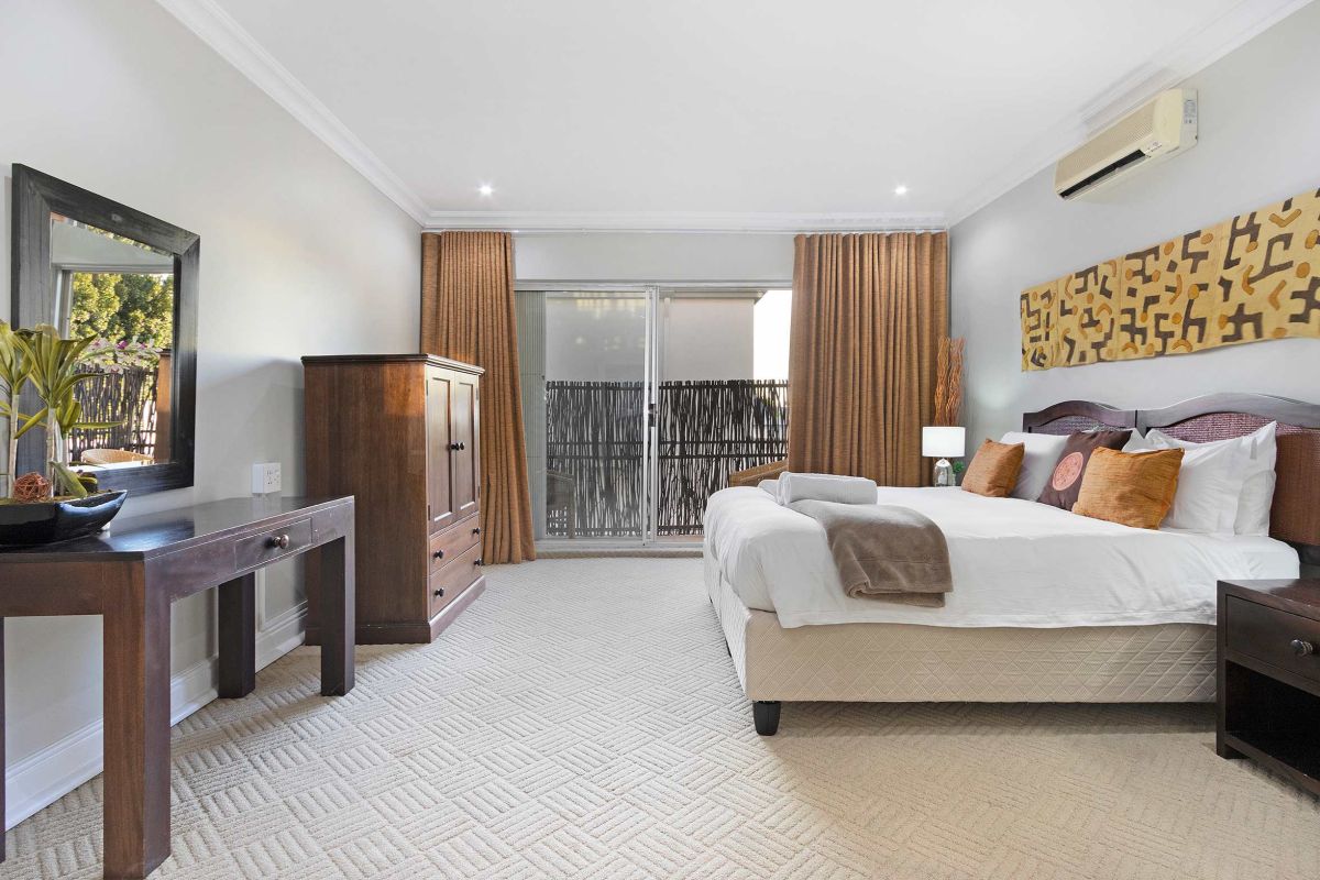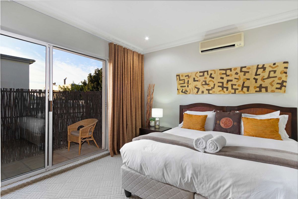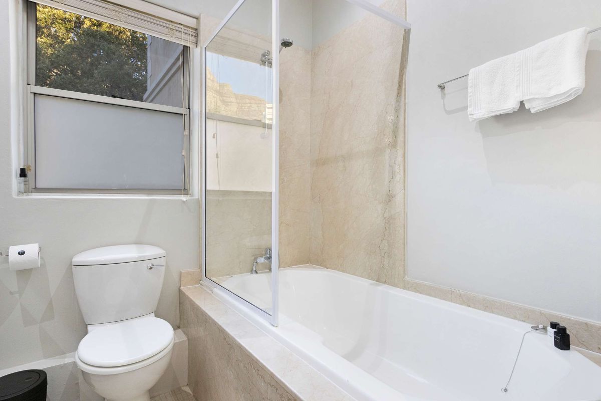 The master bedroom is spacious and light with a king-size bed (which can be converted to twin beds), an en-suite bathroom with a walk-in double shower, bathtub, double vanities, and a private sitting area with a plush couch. The master bedroom has air-conditioning and access to a shared balcony with views over Camps Bay.