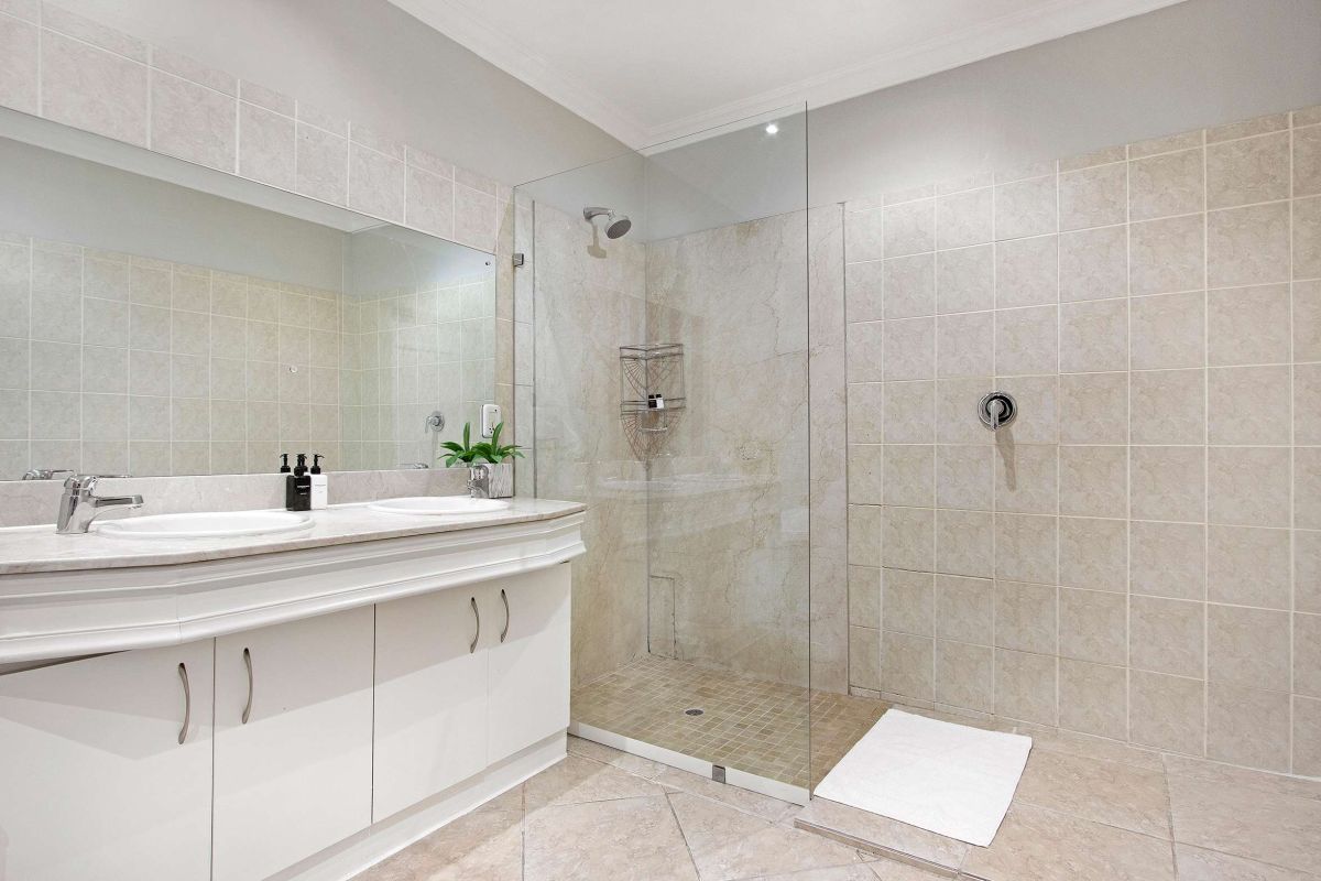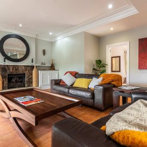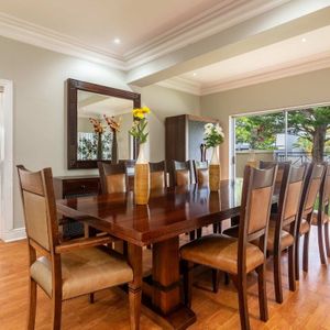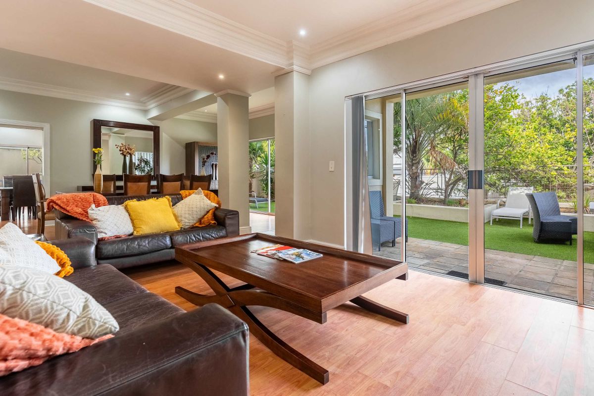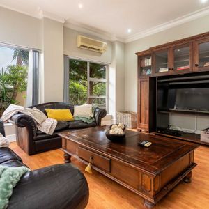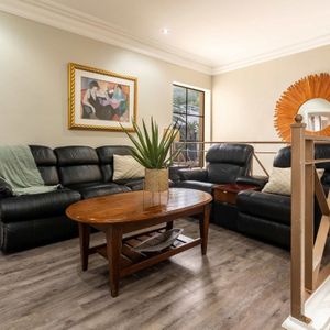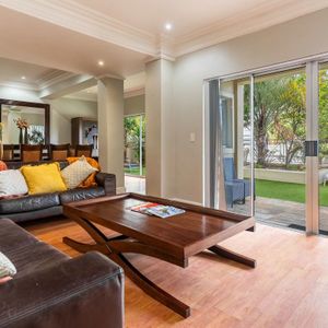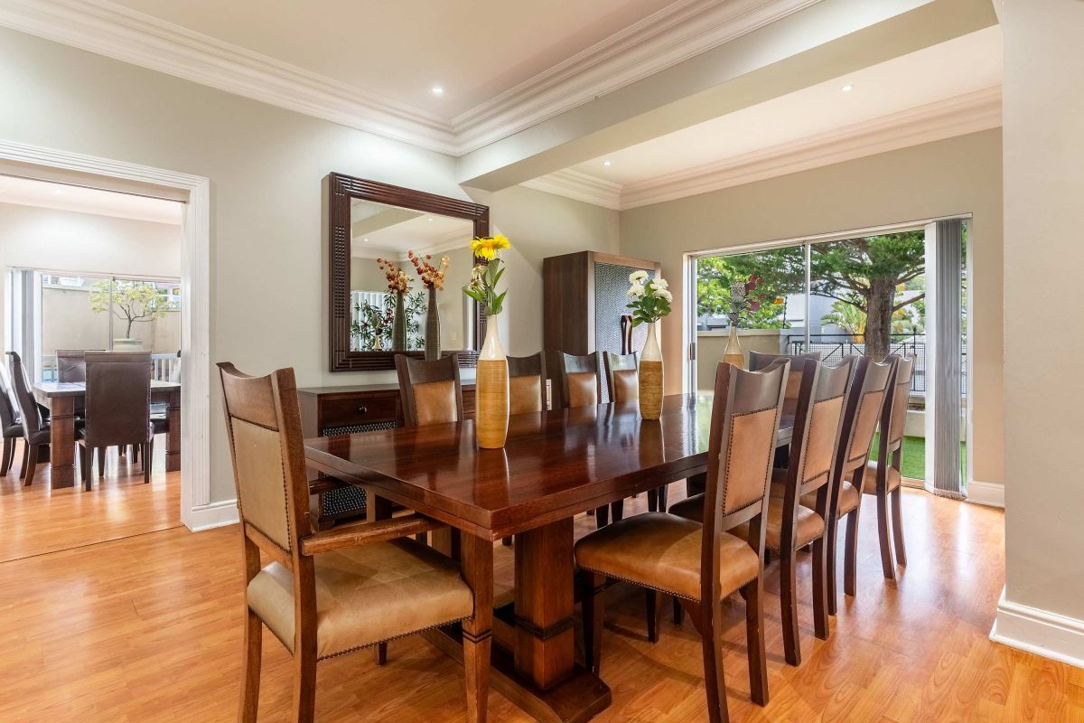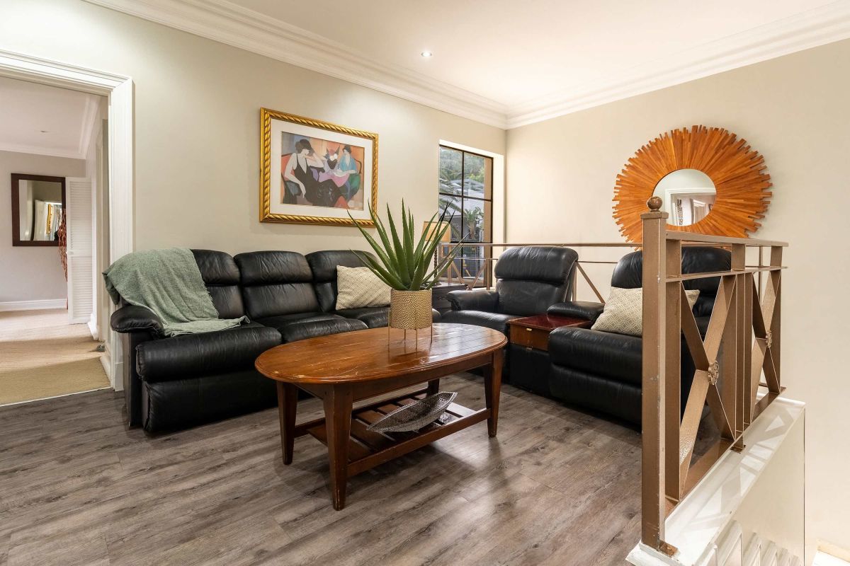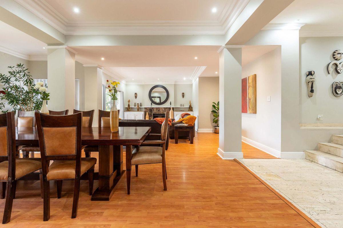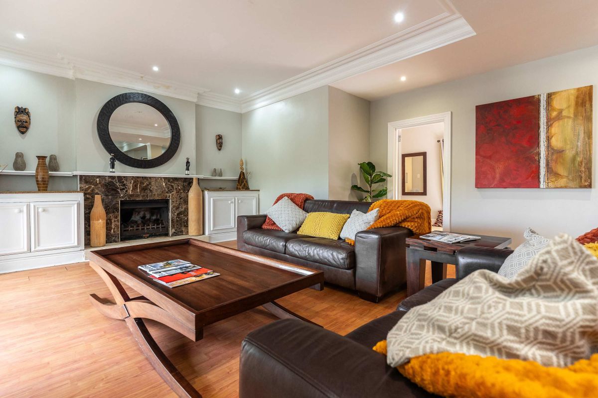 Split over two levels, this grand property exudes an ambiance that is immediately felt on arrival. The lower level of the villa has beautiful wooden floors and houses the living and dining areas. A formal lounge and dining area has plush leather couches, a marble-clad wood-burning fireplace, and an eight-seater dining table. Sliding doors open onto the manicured garden and flood the interior with natural light.