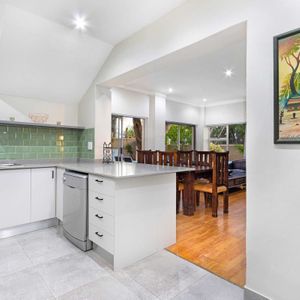 A modern kitchen features state-of-the-art amenities, including an electric oven and gas stove, a double fridge/freezer, a microwave, and a washing machine. Next to the kitchen is a casual TV lounge with leather couches and a flat-screen television. A six-seater dining table is ideal for laid-back meals with easy access to the kitchen.