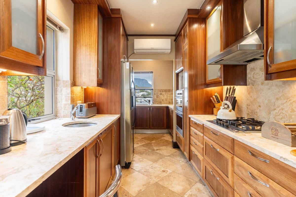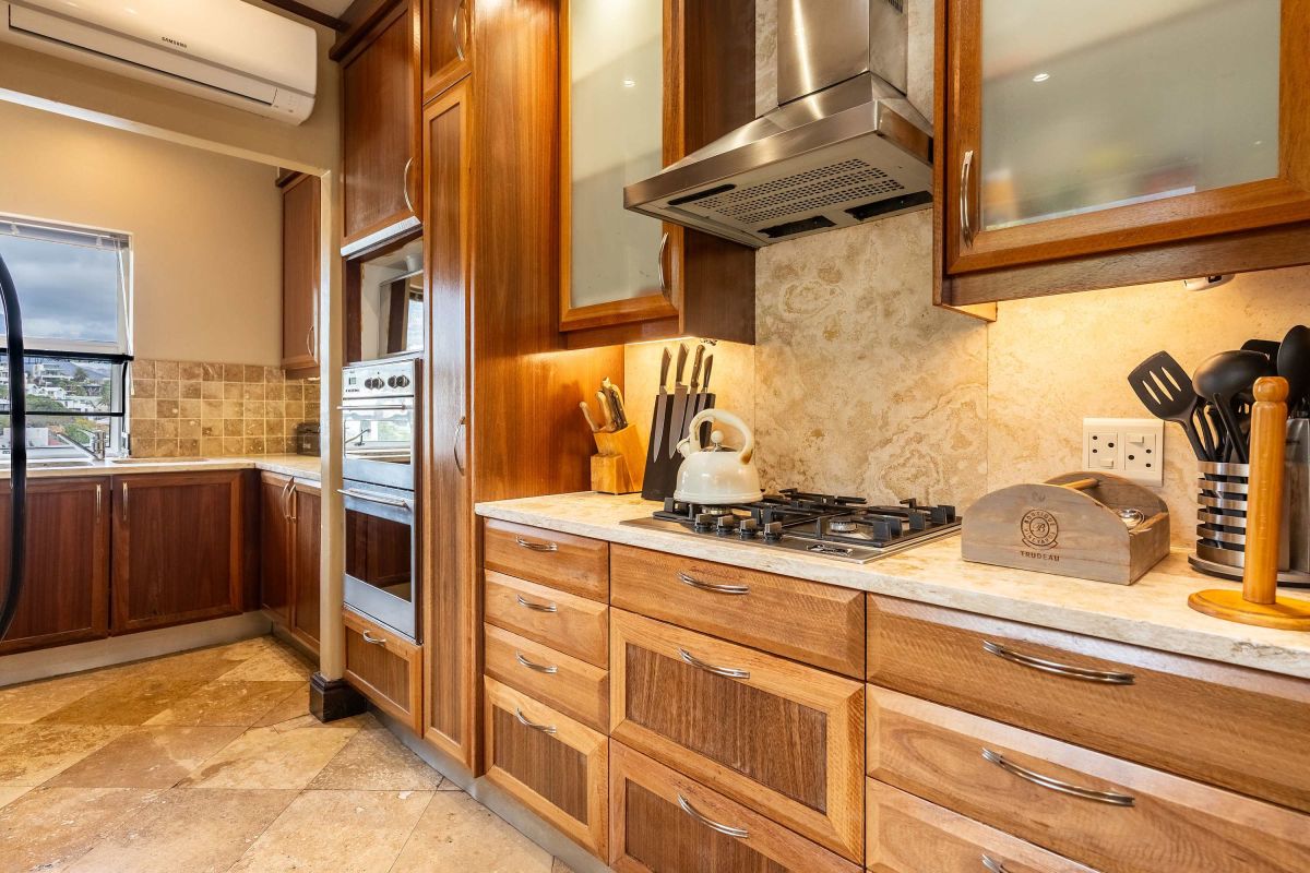The Manor boasts eight bedrooms, each decorated and equipped with modern amenities. The top floor unit offers three bedrooms, including a master suite with views of the Twelve Apostles, Lion’s Head, and the Atlantic Ocean. The lower villa includes five more bedrooms, each with en-suite bathrooms, and access to balconies with stunning mountain and sea views.