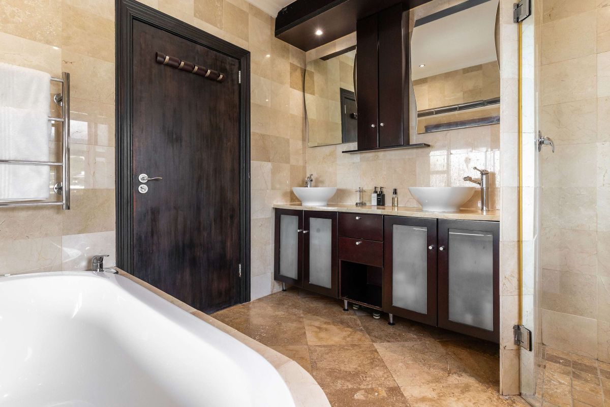 • En-suite bathroom with walk-in double shower, bathtub, and double vanities