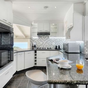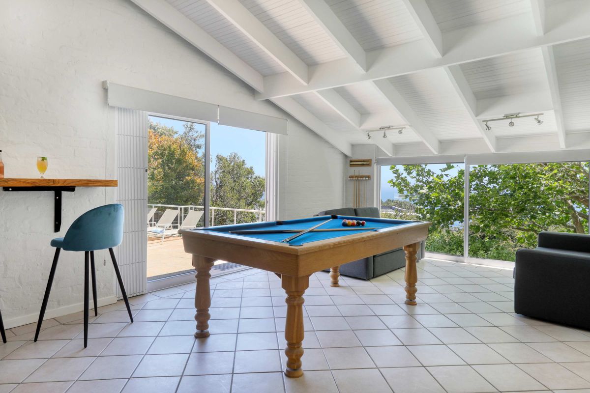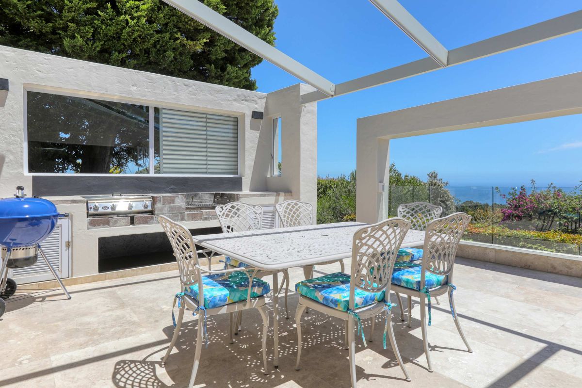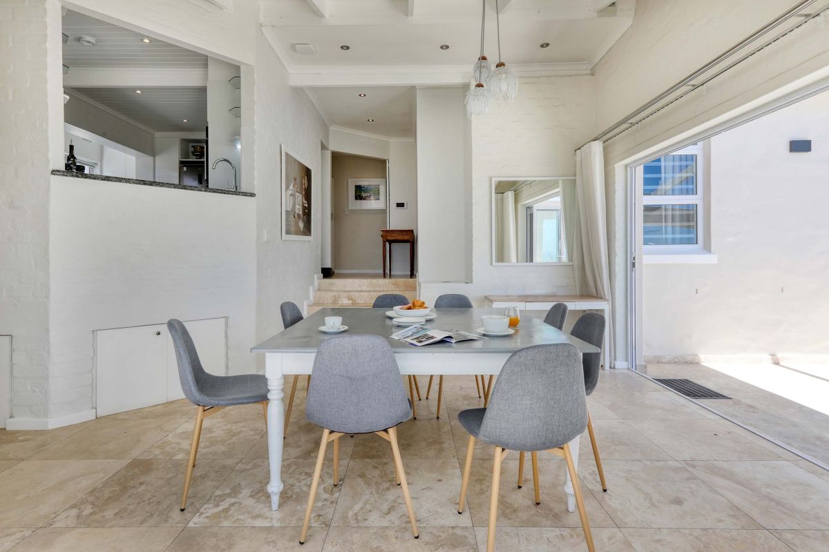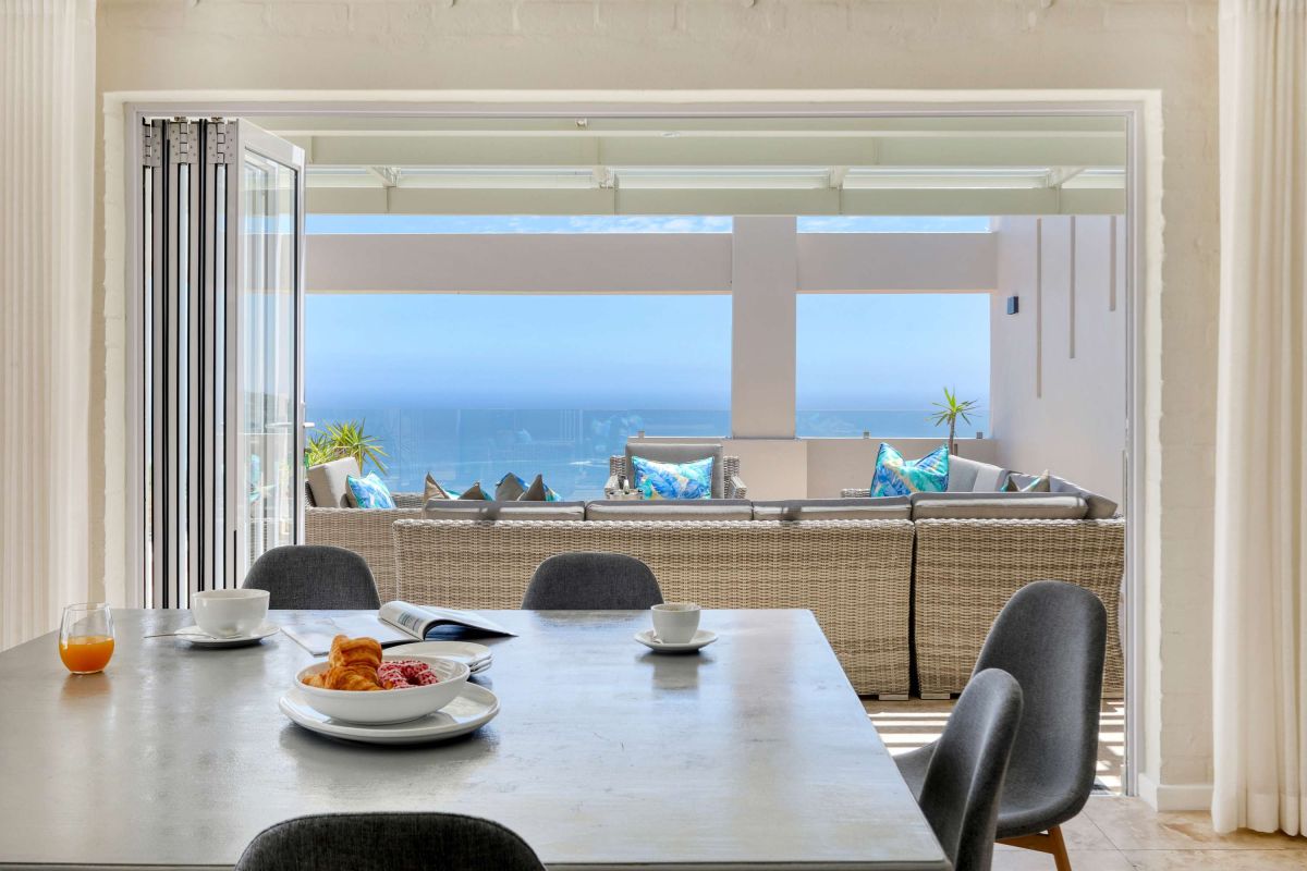The upstairs area offers guests a fully equipped, newly renovated kitchen and comfortable dining area with glass stacking doors that open out on to the upper patio area. Here guests can enjoy an alfresco meal or sundowner while marvelling at the spectacular sea views.
