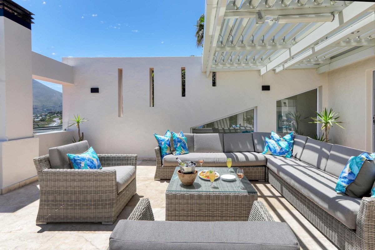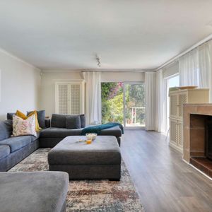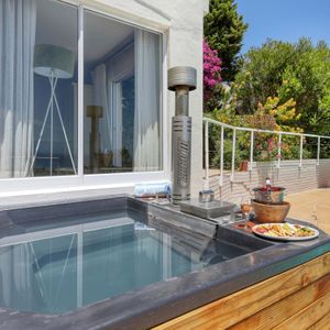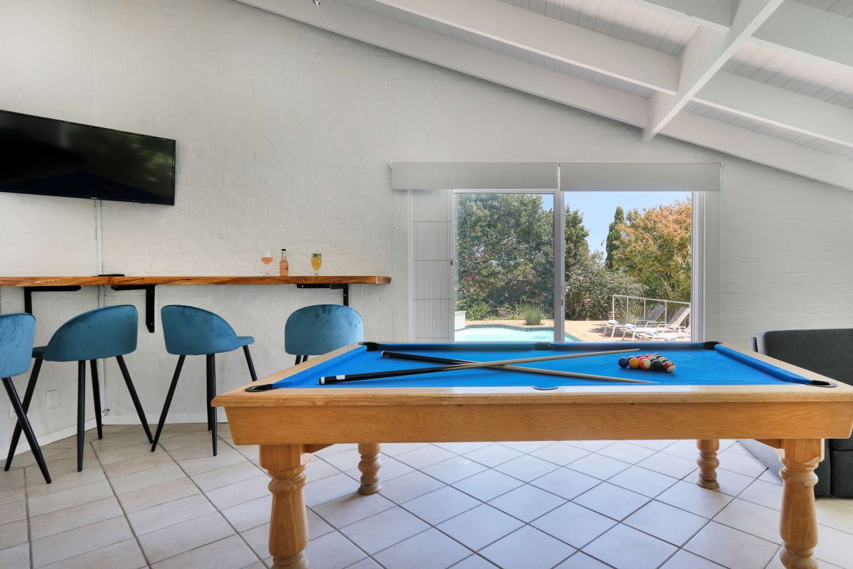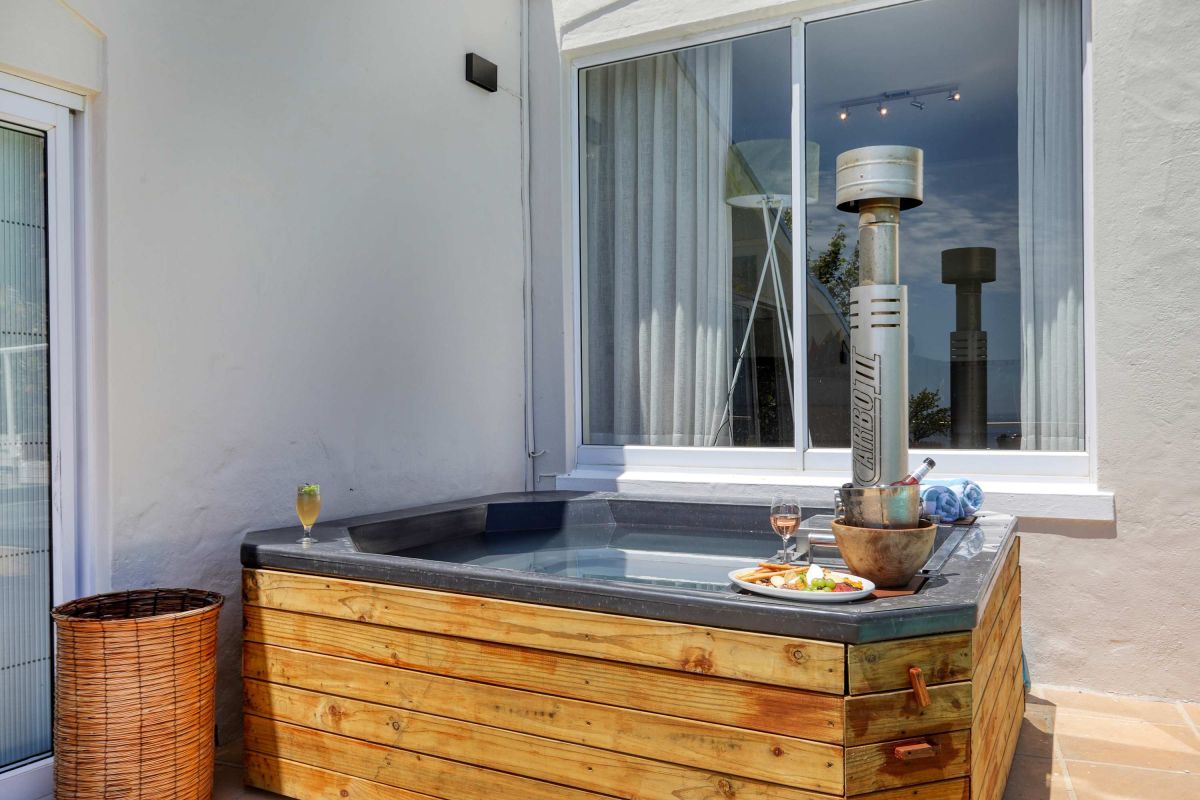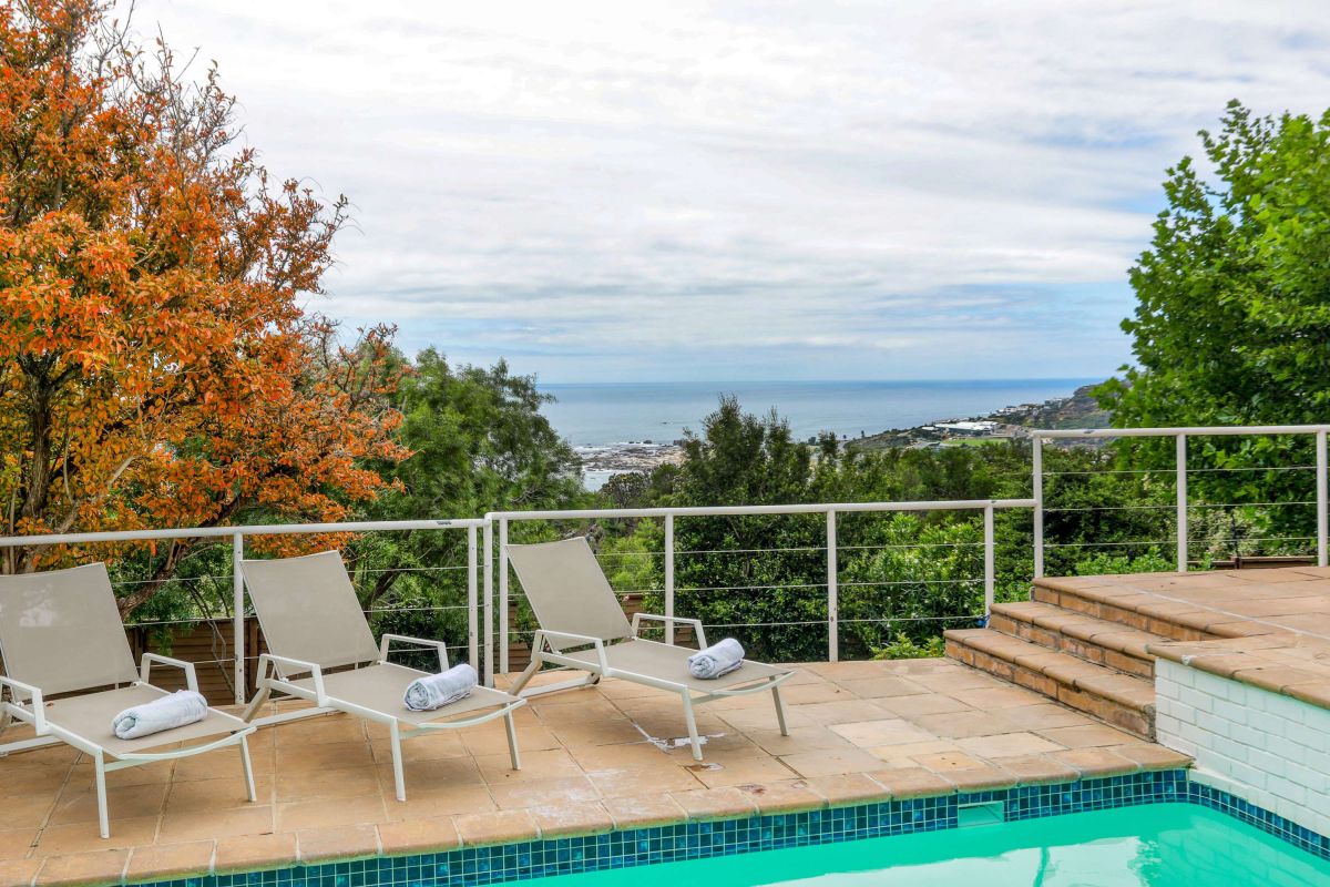 There is ample entertainment space on the upstairs and downstairs terraces, with a private garden at the bottom of the property, large swimming pool and wood-fired hot tub - perfect for a summer stay in Camps Bay.