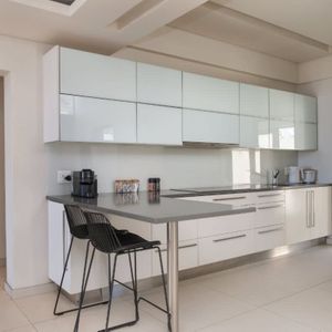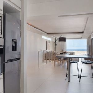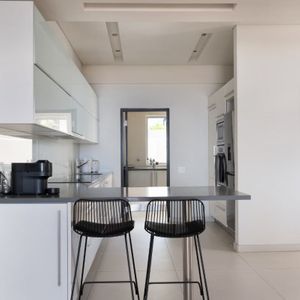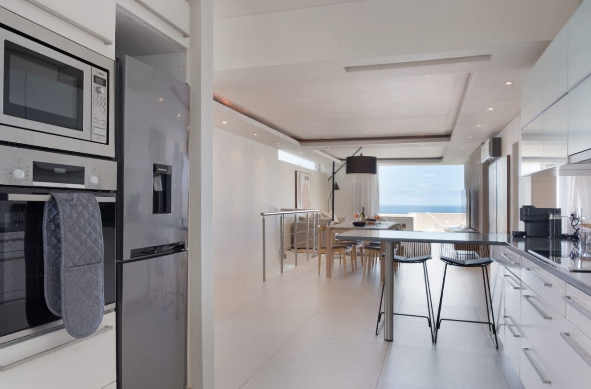 On the top level, the spacious open-plan living area beckons, seamlessly transitioning to a sun-drenched patio that plays host to a glistening splash pool. Immerse yourself in the Camps Bay sunshine while enjoying the serenity of this exquisite outdoor space. The fully equipped open-plan kitchen, an integral part of the living area, adds a touch of convenience and functionality to the space, creating a seamless flow for culinary endeavors and social gatherings.