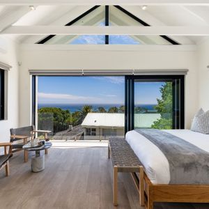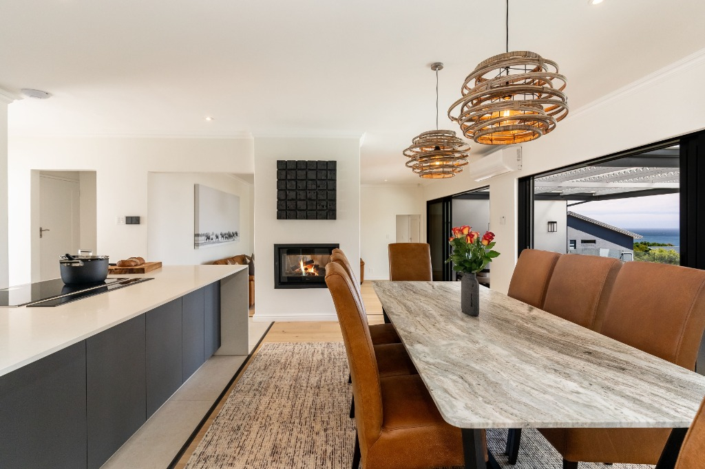 Indoors, you’ll find a fully equipped kitchen with modern appliances, a cozy lounge with a wood-burning fireplace, and a SMART TV for your entertainment. Each of the four bedrooms boasts its own en-suite bathroom and air-conditioning, with the master suite offering ocean views, a private balcony, and a luxurious open-plan bathroom.