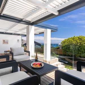 Step inside and experience a seamless blend of elegance and comfort. The open-plan living area flows effortlessly onto a spacious terrace, where a private swimming pool, outdoor dining space, and built-in BBQ await for alfresco entertaining. Indoors, you’ll find a fully equipped kitchen with modern appliances, a cozy lounge with a wood-burning fireplace, and a SMART TV for your entertainment. Each of the four bedrooms boasts its own en-suite bathroom and air-conditioning, with the master suite offering ocean views, a private balcony, and a luxurious open-plan bathroom.