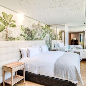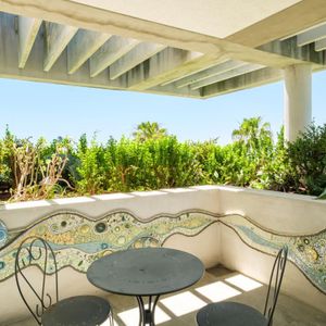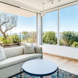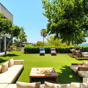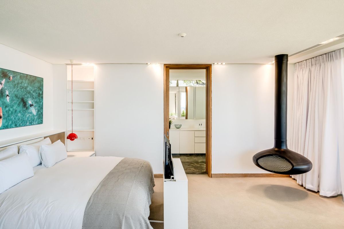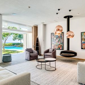 Five king‑bed suites are arranged with comfort in mind. The master suite enjoys a private balcony, dressing room, and biofuel fireplace, while the remaining bedrooms offer a mix of sea views, garden access, or dedicated bathrooms. The well‑equipped kitchen includes a gas hob, breakfast bar, and separate laundry for added convenience.