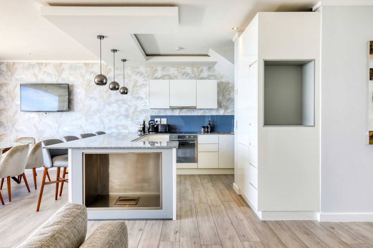As you enter each section of the property, you walk up a few steps into the open plan living room, dining and kitchen area. This level also offers a guest loo. Each kitchen has been fully equipped with all you could possibly need for your holiday including dishwasher, washing machine, tumble dryer etc. Each dining table seats 6 guests. There is also L-shaped couches and flat screen TV's. Each living room has access to a small balcony l with views towards the sea.