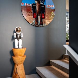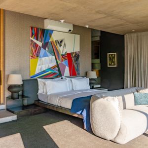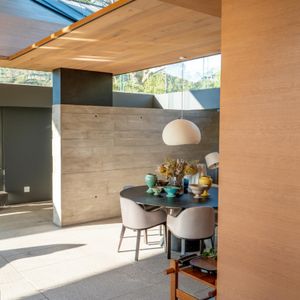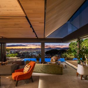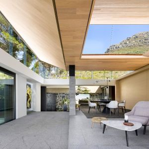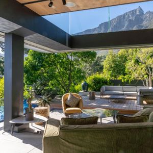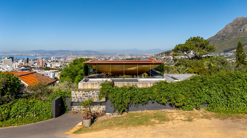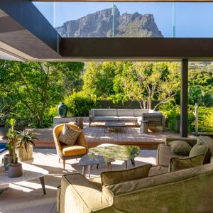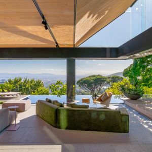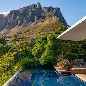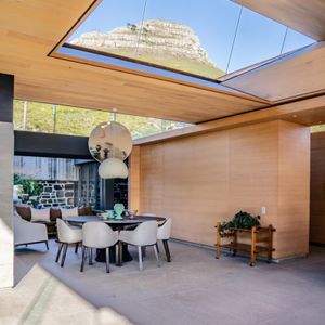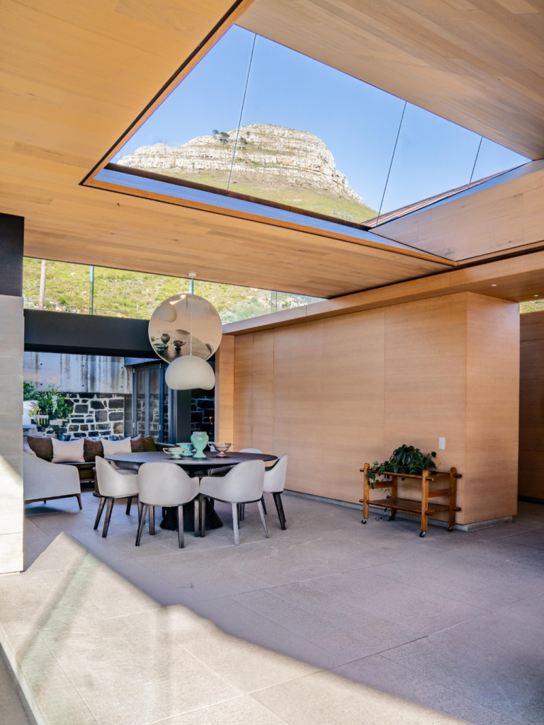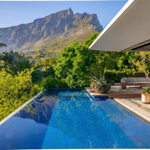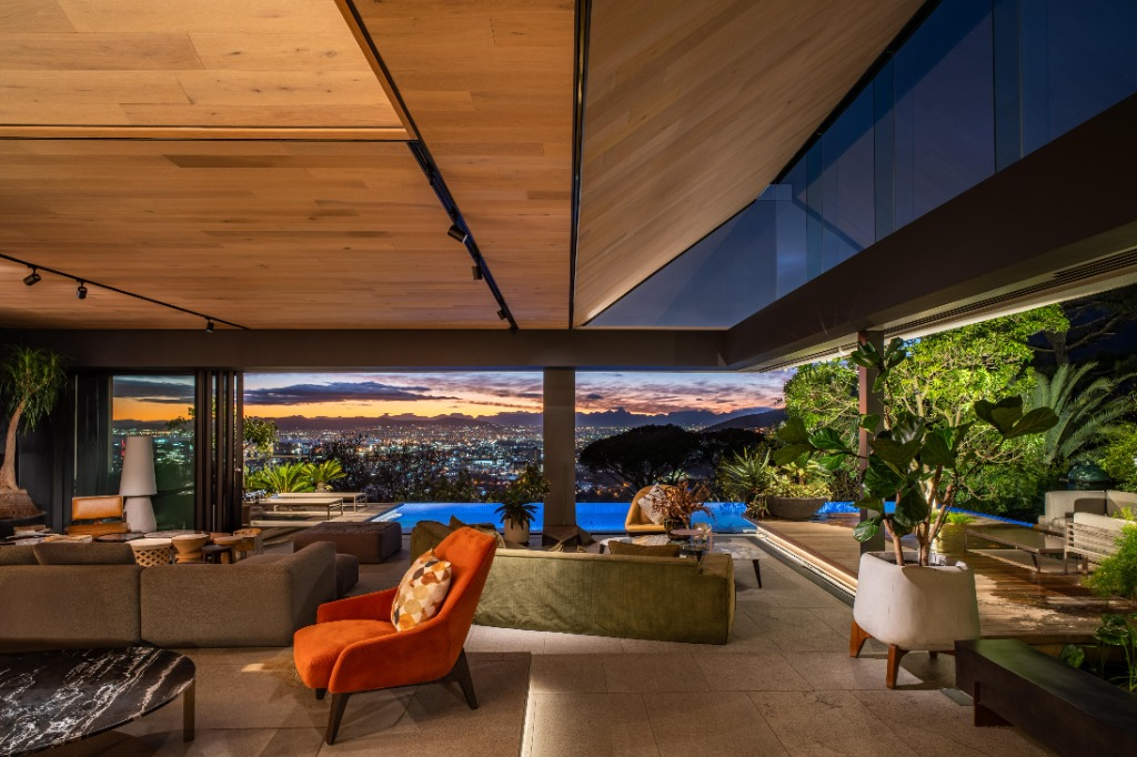 Layered with courtyards and planters, the villa draws light, greenery, and sweeping views deep into its interiors. The upper-level houses expansive living spaces that open entirely to the pool, creating the remarkable illusion of floating above the city below. From here, guests are treated to ever‑changing panoramas of Lion’s Head, Table Mountain, and Devil’s Peak, a dramatic skyline that shifts with the light of day and the glow of night.