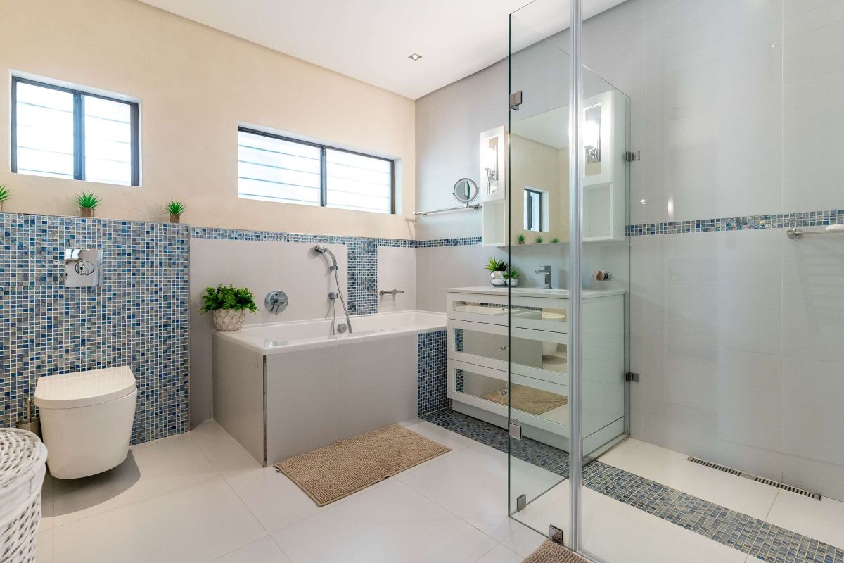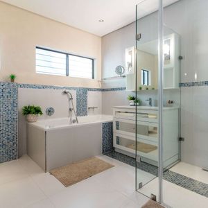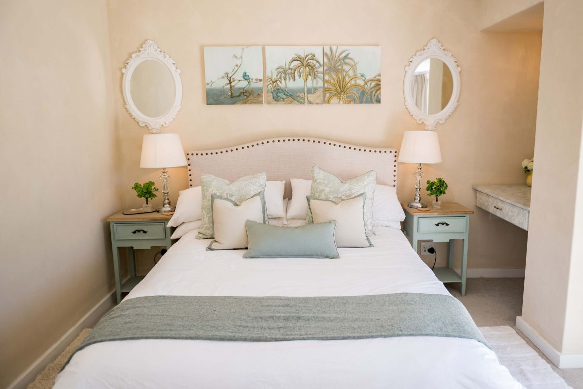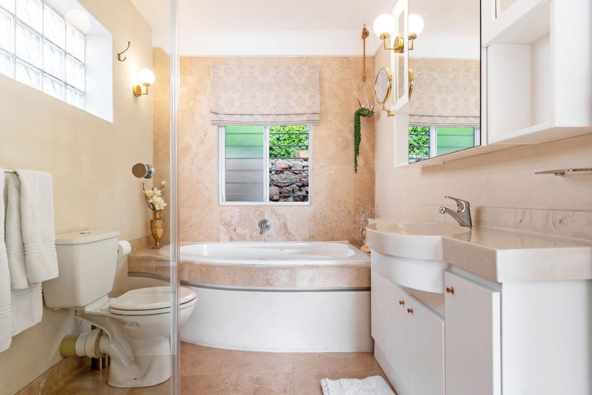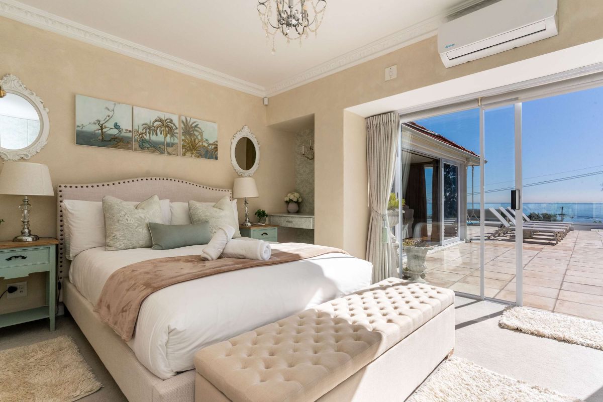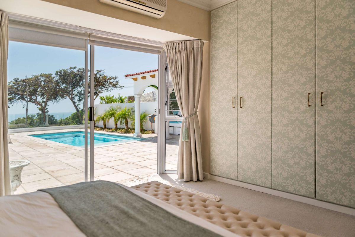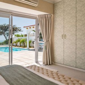 The villa has four bedrooms, three of which can be found on the ground level with a loft-style bedroom on the upper level. The master bedroom is elegantly decorated in tones of cream and white and has built-in cupboards with ample storage space and an en-suite bathroom with a lovely corner bath and a glass-enclosed shower. This bedroom has direct access to the main sun deck and swimming pool and offers stunning views of the Atlantic Ocean.