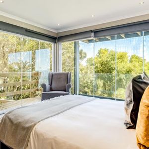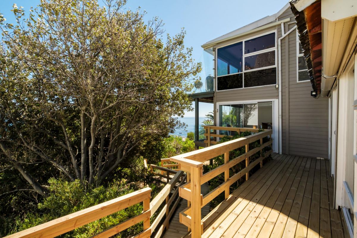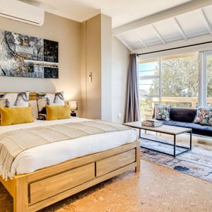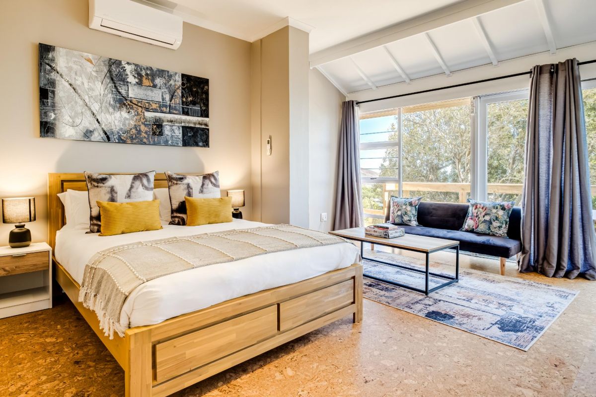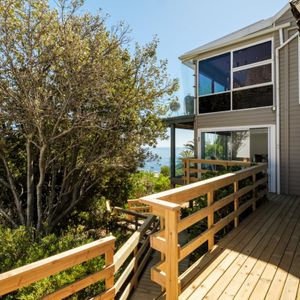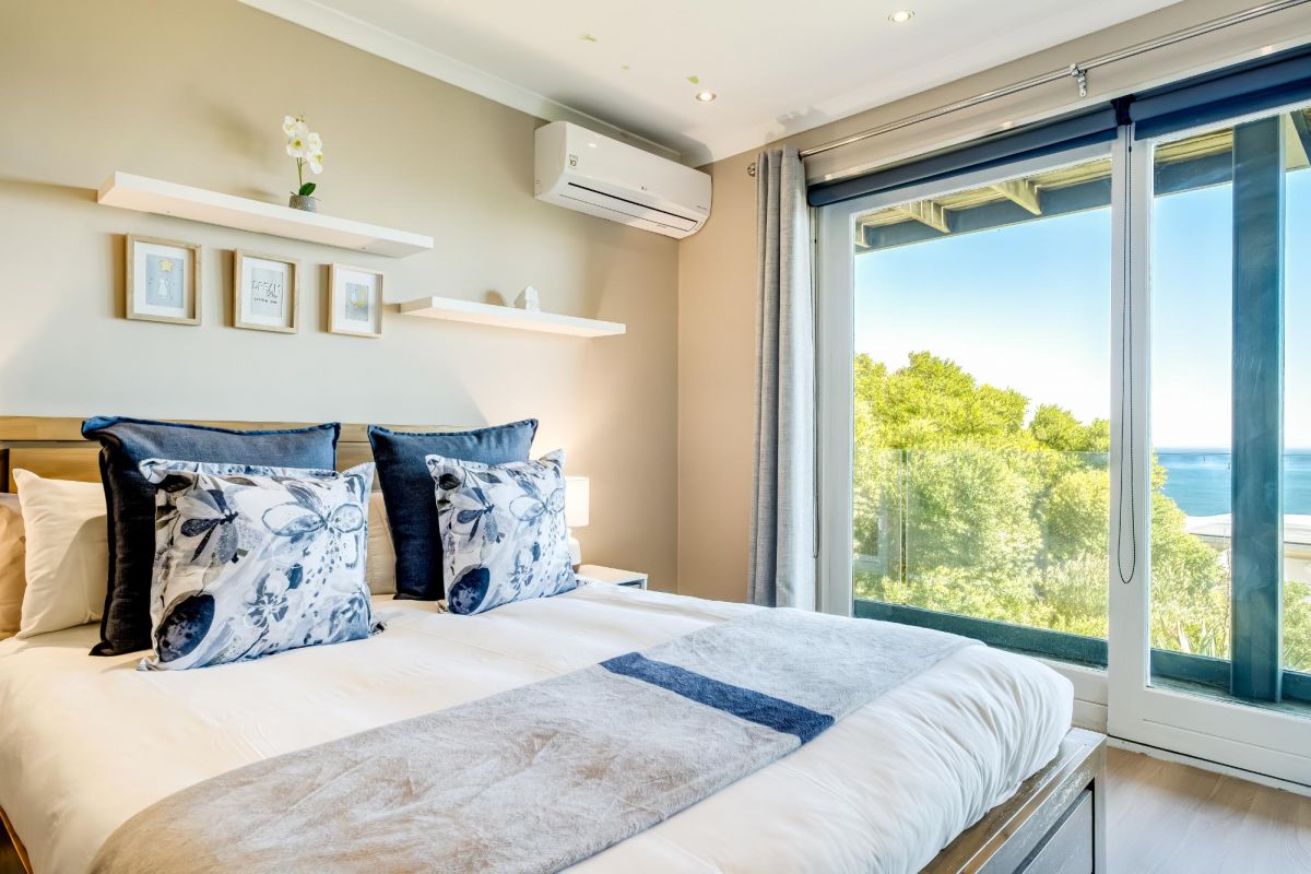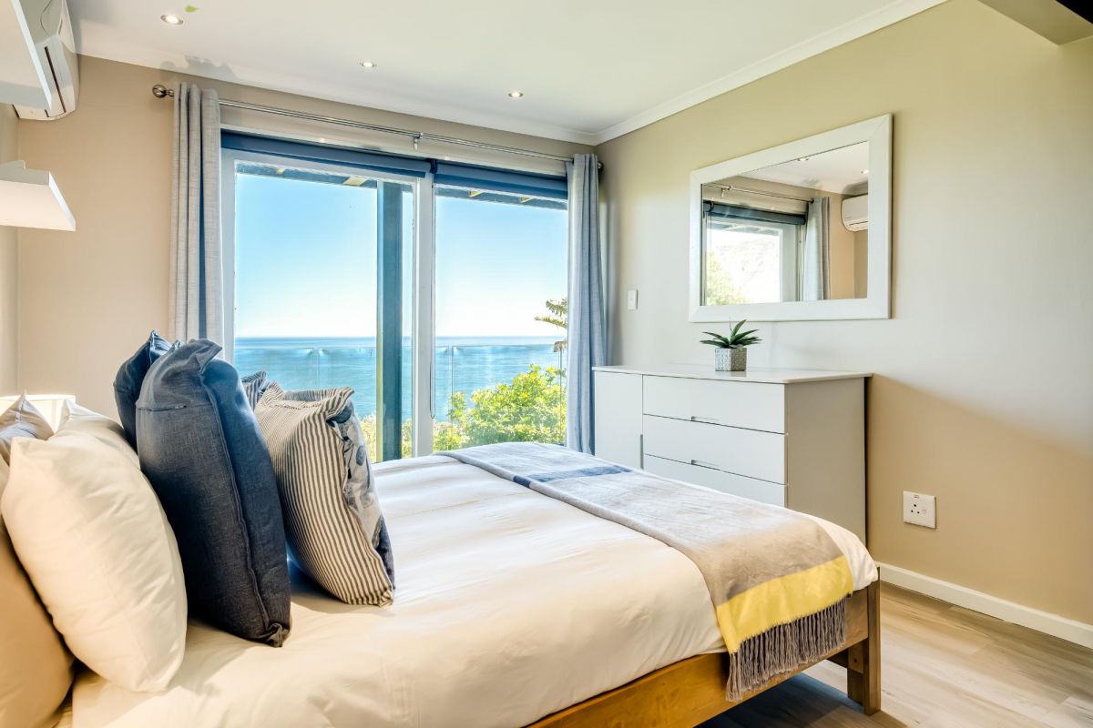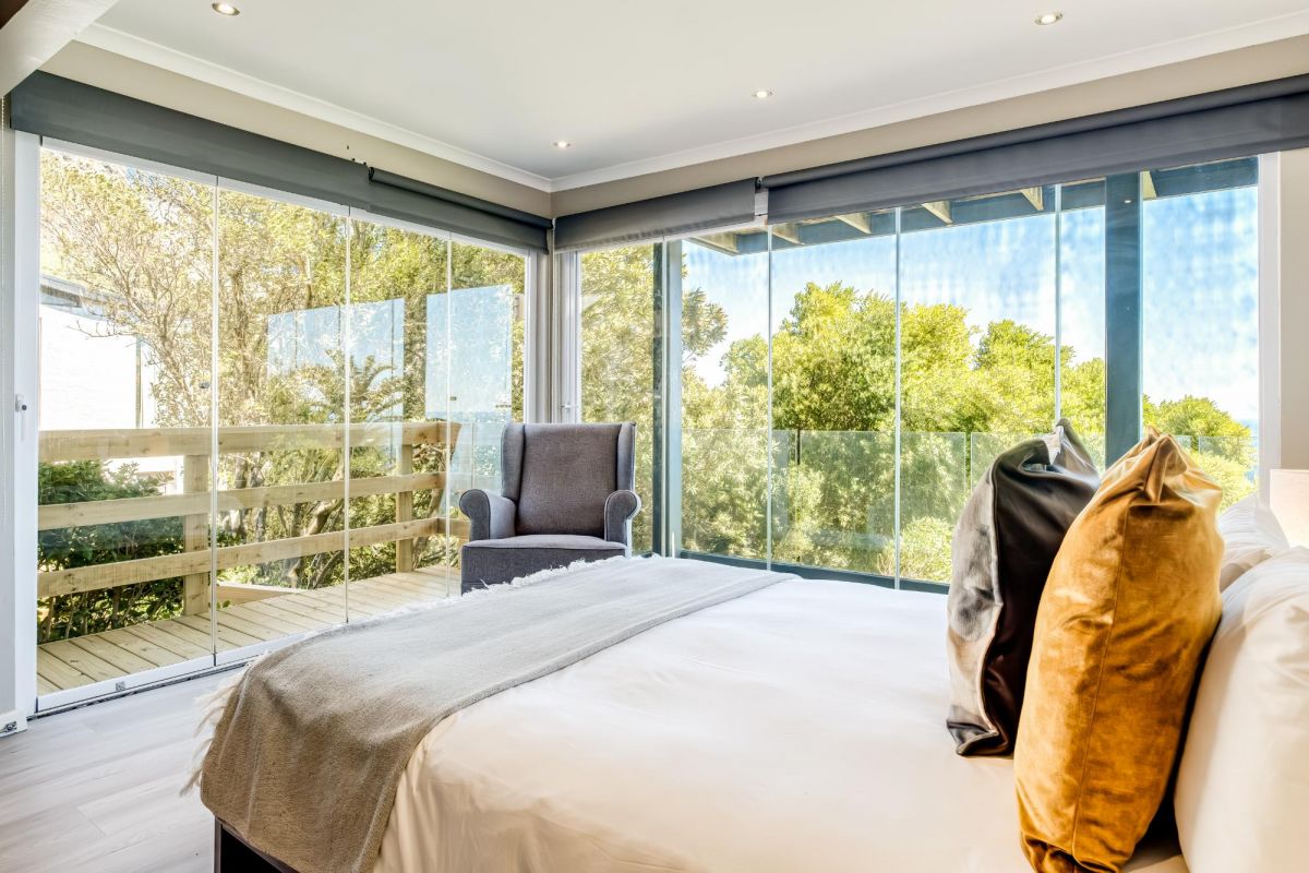 The expansive main bedroom features a king-sized bed, air conditioning, and access to a private deck where you can enjoy the breathtaking surroundings. The ensuite bathroom includes both a bath and a shower, complete with a double vanity for added convenience. The second and third bedrooms also boast sea views and easy access to the deck, with the third bedroom offering additional mountain views. A fourth bedroom, situated on the lower level and accessible via an exterior staircase, offers a queen-sized bed, an ensuite bathroom, and a private deck that leads to a tranquil fynbos garden.