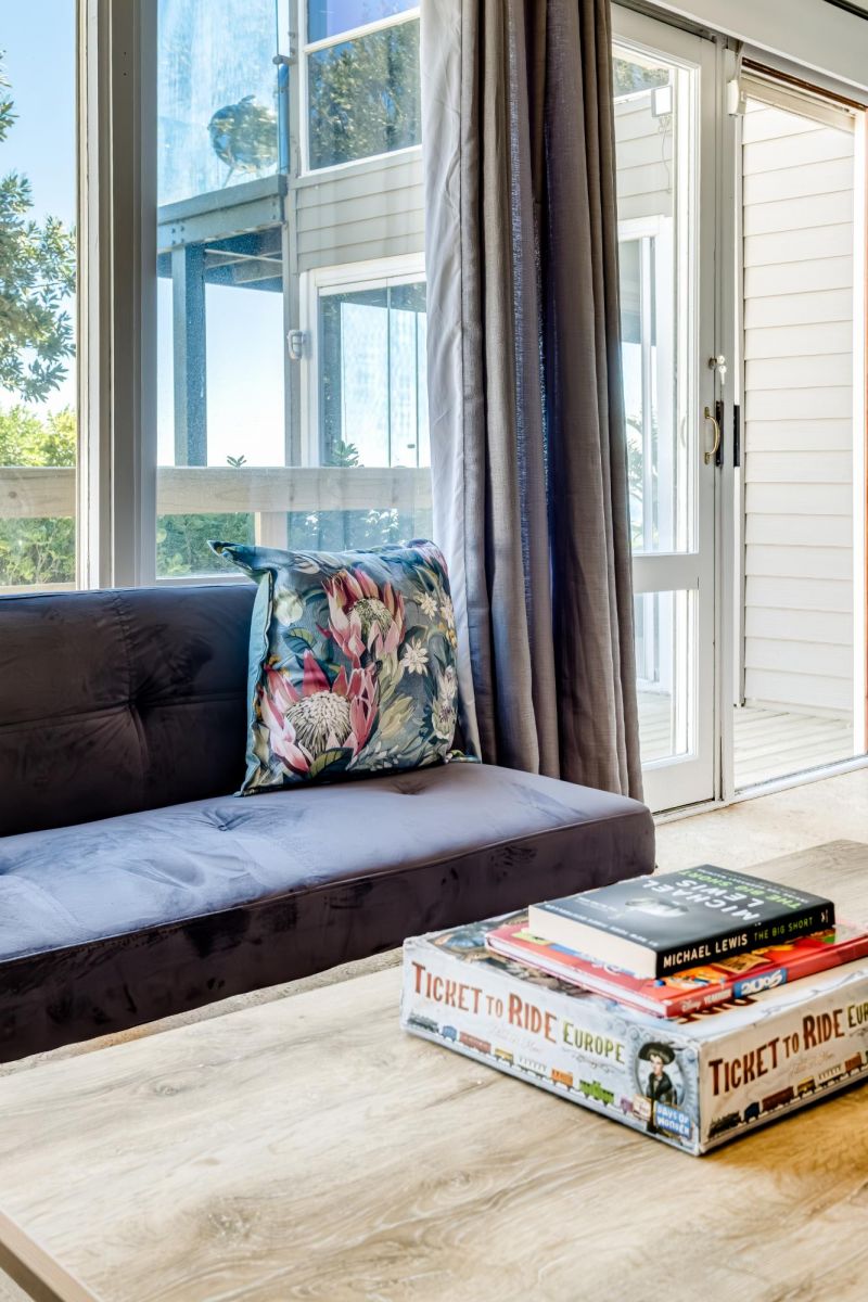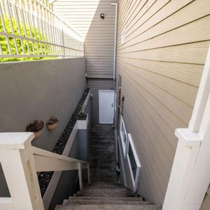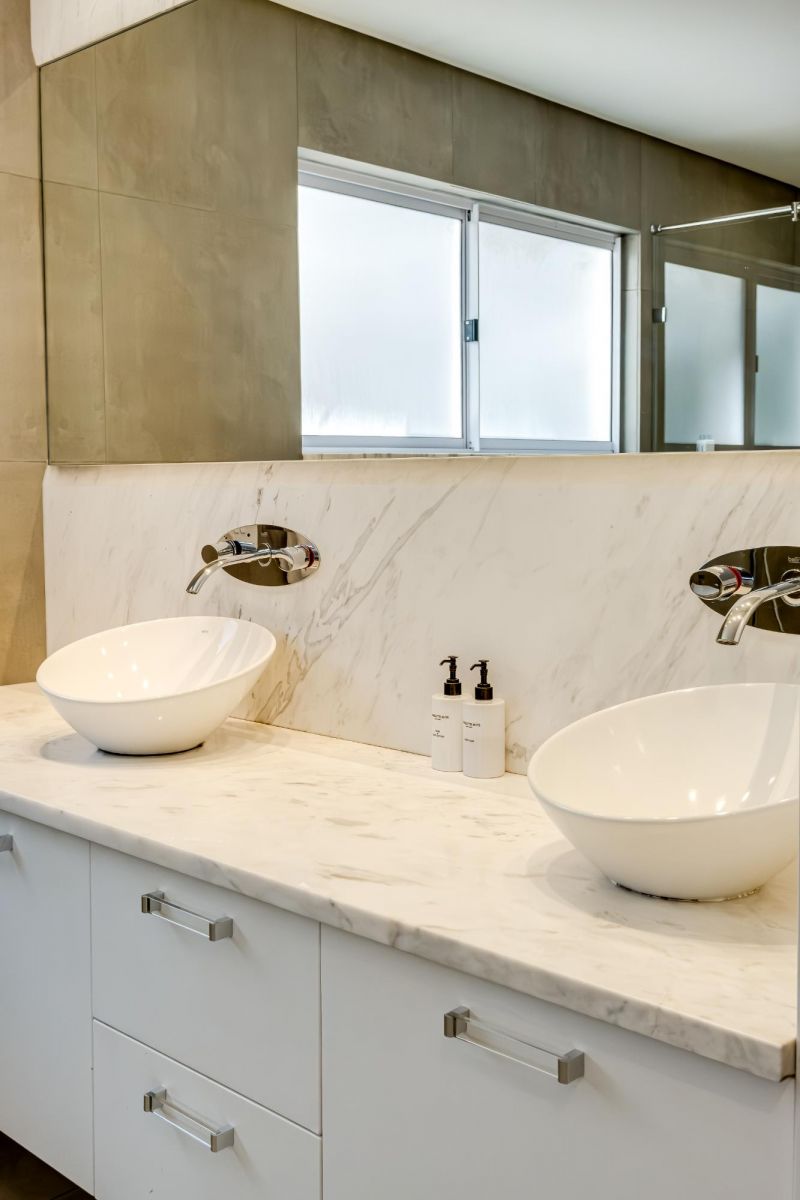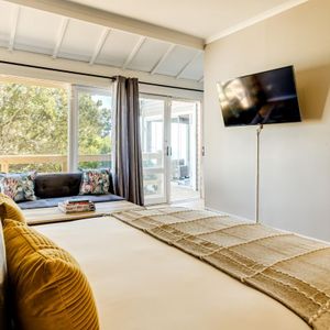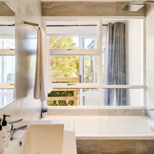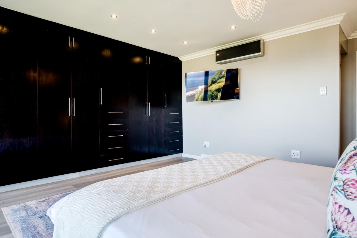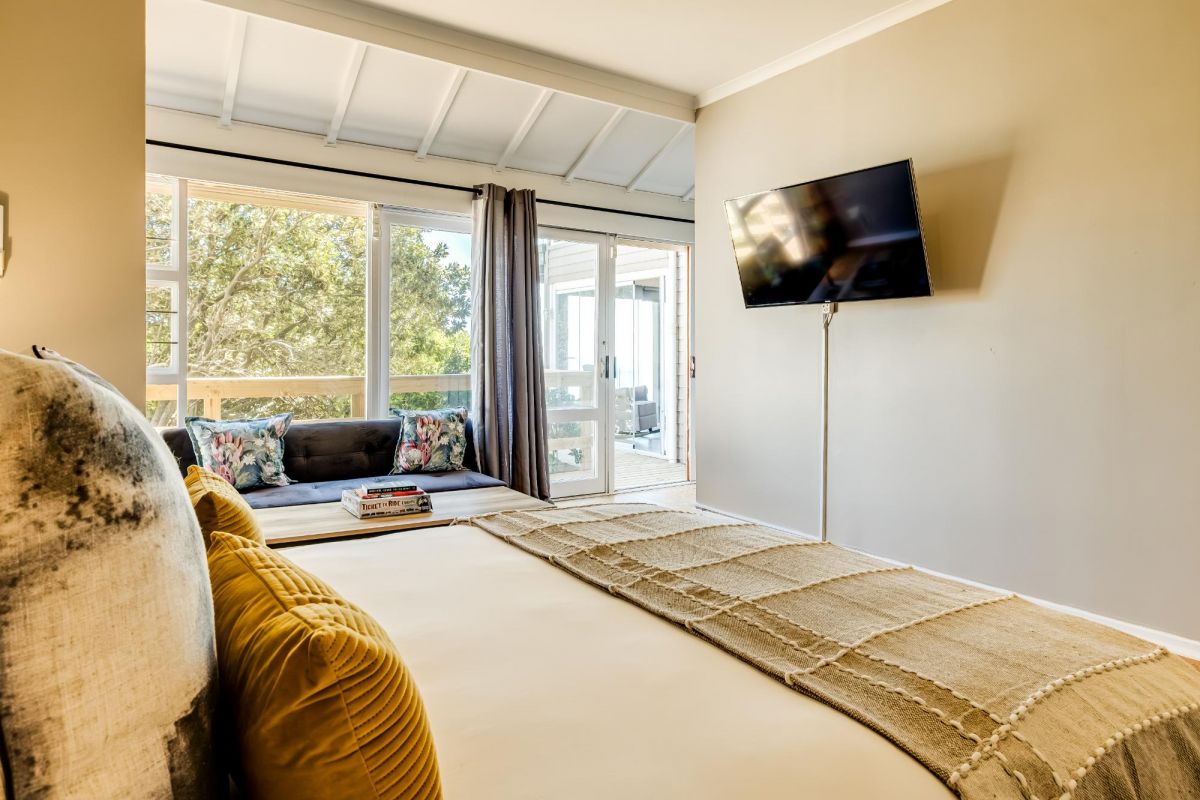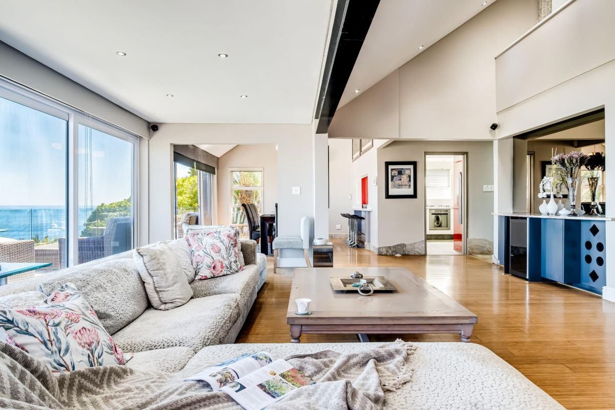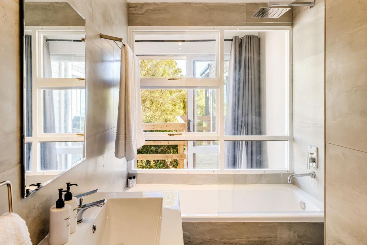The expansive main bedroom features a king-sized bed, air conditioning, and access to a private deck where you can enjoy the breathtaking surroundings. The ensuite bathroom includes both a bath and a shower, complete with a double vanity for added convenience. The second and third bedrooms also boast sea views and easy access to the deck, with the third bedroom offering additional mountain views. A fourth bedroom, situated on the lower level and accessible via an exterior staircase, offers a queen-sized bed, an ensuite bathroom, and a private deck that leads to a tranquil fynbos garden.