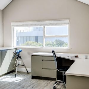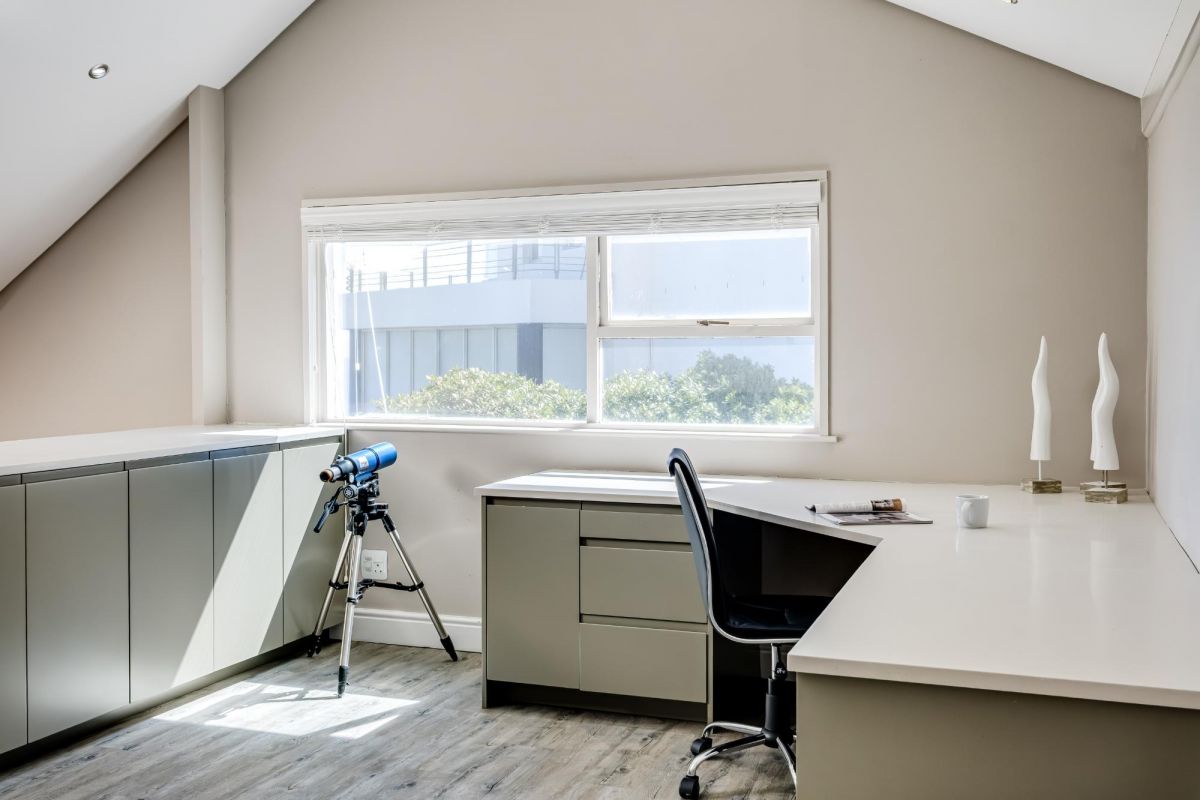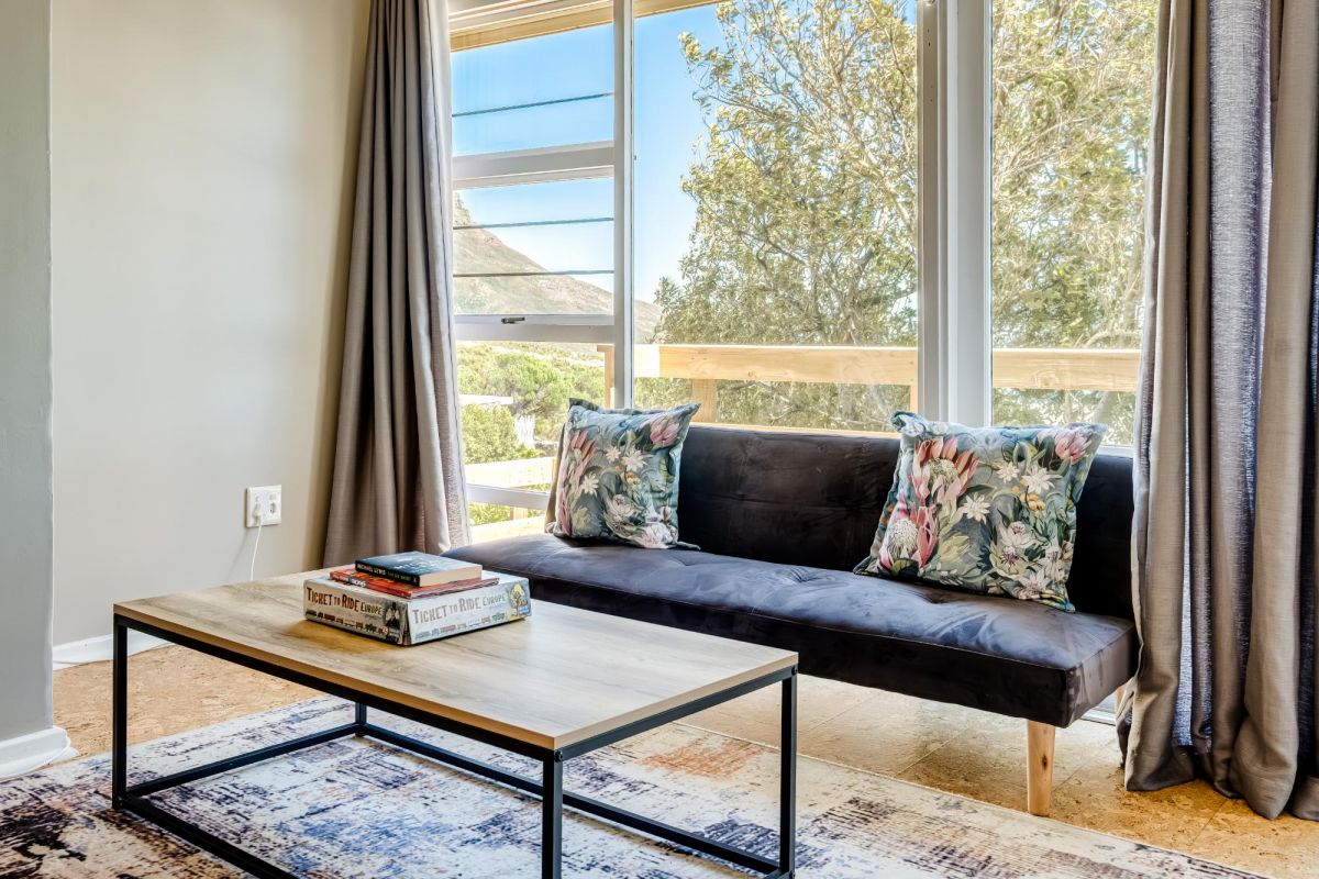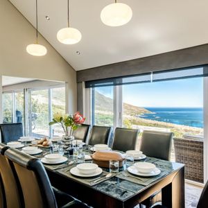 The fully-equipped kitchen is a chef's delight, featuring a gas hob, coffee machine, and stunning views of the Camps Bay coastline. The open-plan living and dining areas are perfect for both relaxation and entertaining, with seating for eight, a cozy gas fireplace, and a bar fridge for your convenience. A dedicated study offers a quiet space for work or reflection.