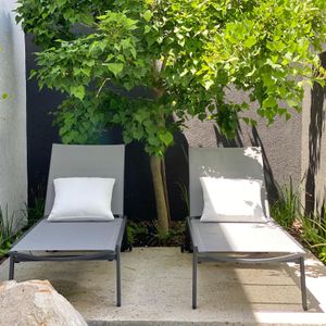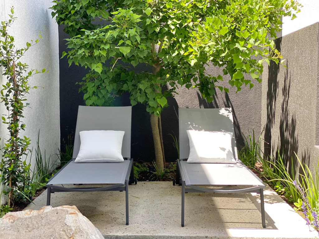 - Northeast courtyard garden with loungers and water feature