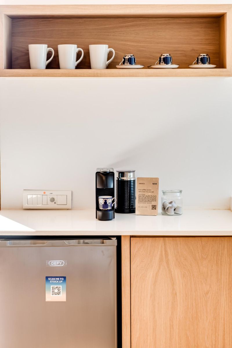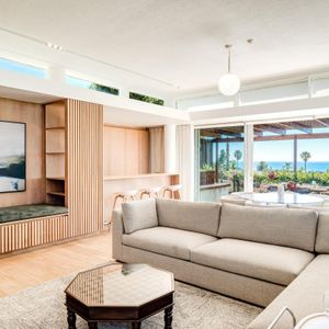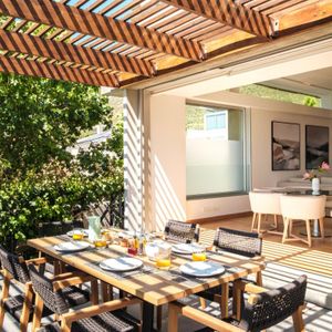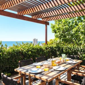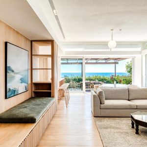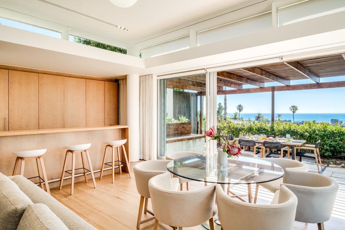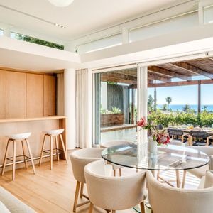 The open‑plan living and dining area flows seamlessly onto a landscaped terrace, where outdoor dining and ocean views create an inviting setting for relaxed gatherings. A fully equipped kitchen with a breakfast bar ensures effortless meal preparation, while a convenient mini coffee station on the top floor adds a thoughtful touch.