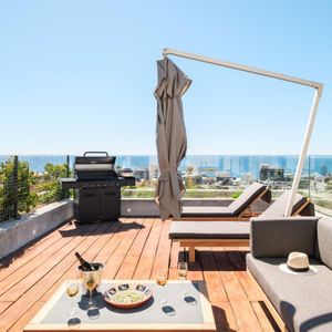 The top‑floor terrace is designed for leisure, featuring sun loungers, a gas barbecue, and comfortable lounge seating—perfect for sundowners or elegant al fresco dinners.
