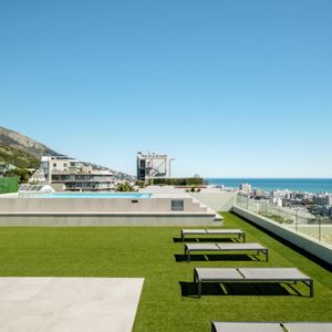 The open-plan living and dining space features air conditioning, a TV, a work desk, and comfortable lounge seating for four, complemented by partial sea views. A fully equipped kitchen with an electric hob, Nespresso machine, and washer/dryer combo ensures convenience for both short and extended stays.