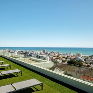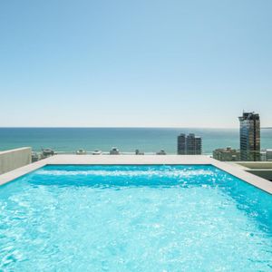 The bedroom includes a queen bed, balcony access, and a private bathroom with a shower and single vanity. Step onto the balcony to unwind with seating for four and sweeping views of the Atlantic. Guests also enjoy access to the rooftop communal pool, perfect for cooling off while taking in panoramic city and ocean vistas.