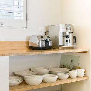 The upstairs living area offers guests a comfortable lounge, dining room and fully equipped, kitchen. These areas flow onto the large outdoor terrace. Here guests can enjoy alfresco meals overlooking the garden, an evening dip in the swimming pool and sea views.