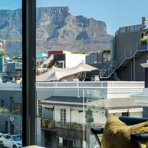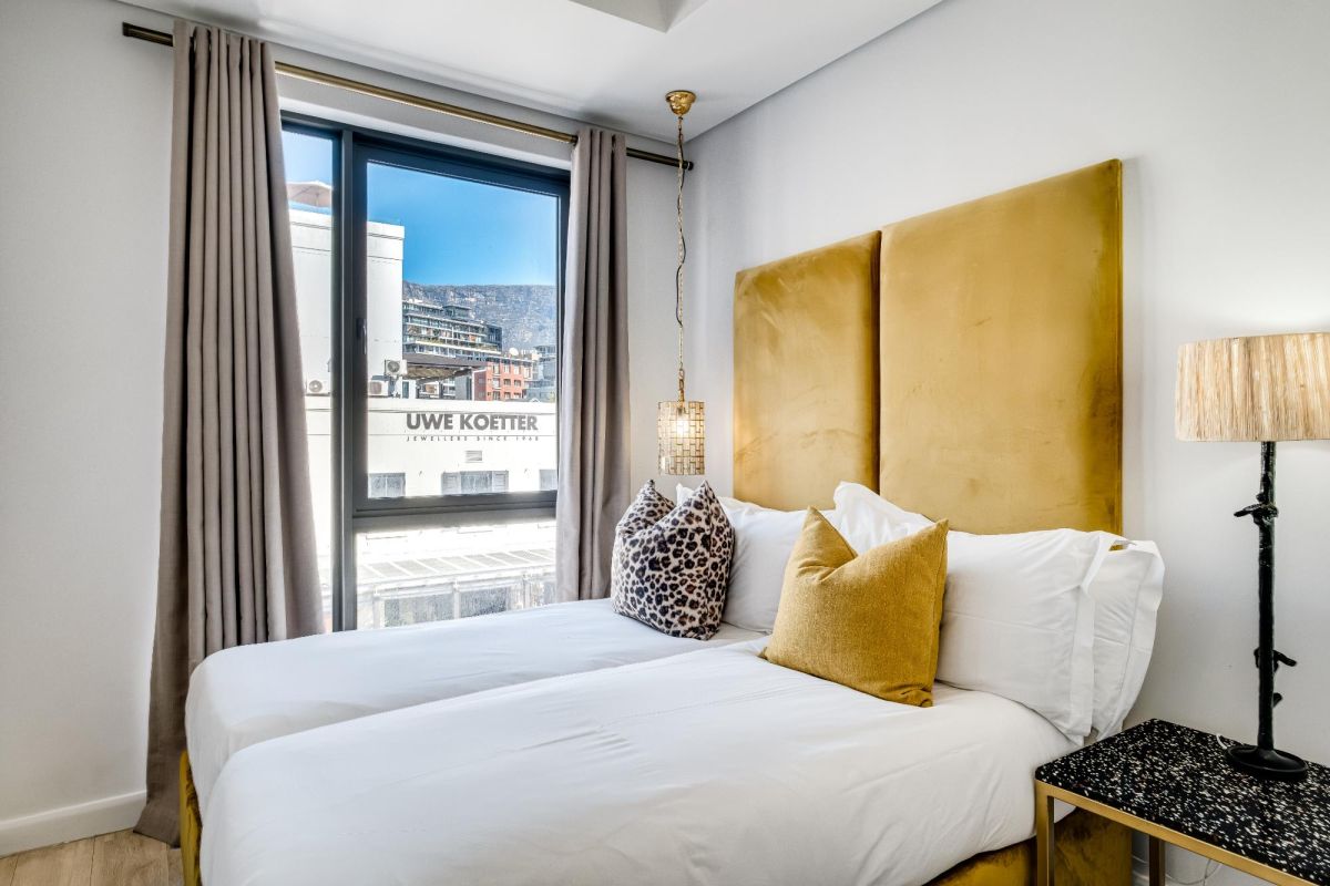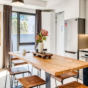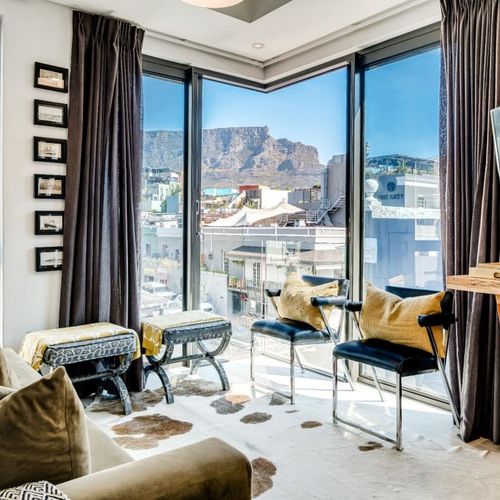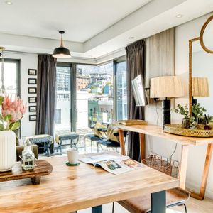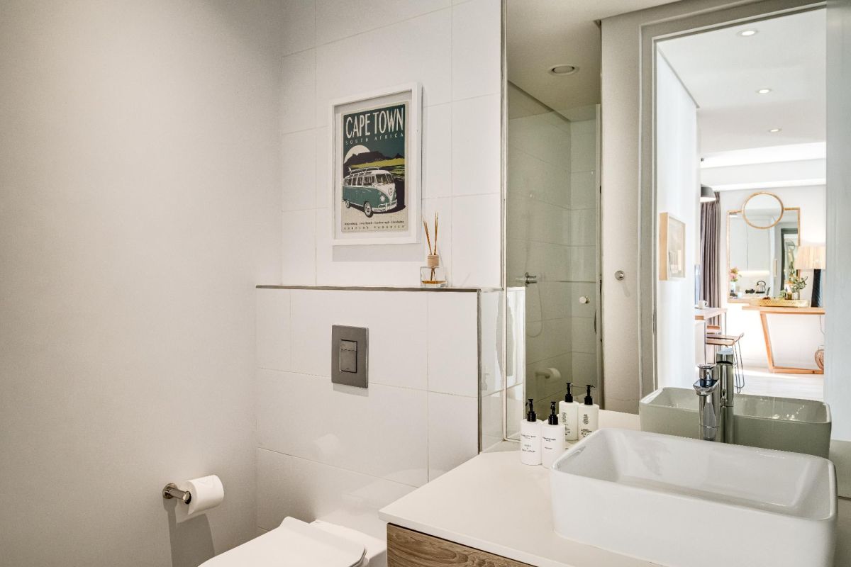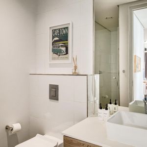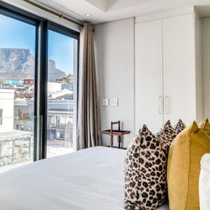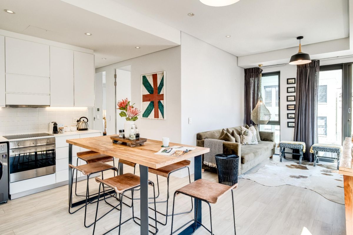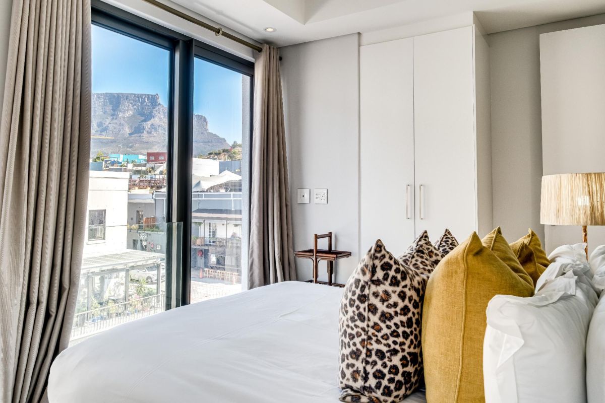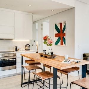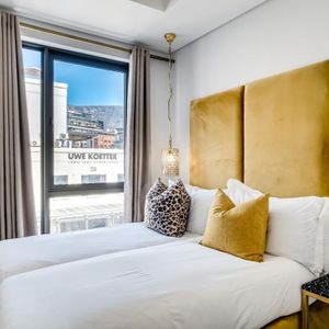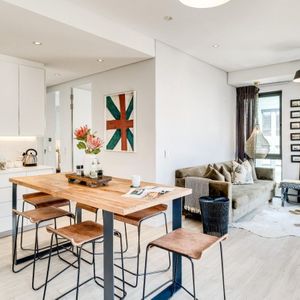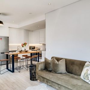 Situated in the vibrant heart of De Waterkant, this modern two-bedroom apartment offers stylish city living in a secure building. The open-plan living area is thoughtfully designed with a sleek kitchen, dining bar, and a comfortable lounge featuring a large TV — perfect for relaxing after a day out. Floor-to-ceiling glass doors flood the space with natural light and open onto captivating views of the city skyline and Table Mountain.