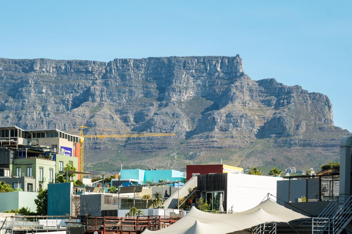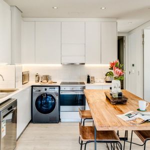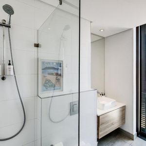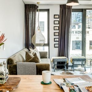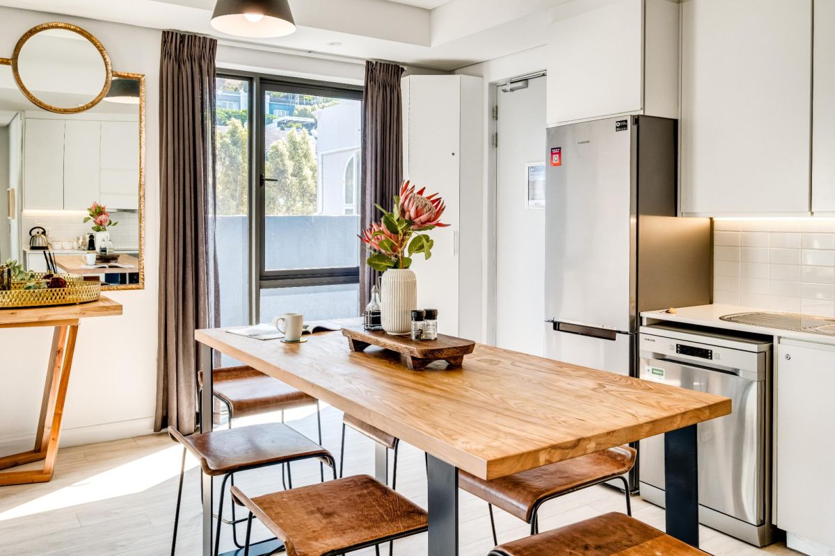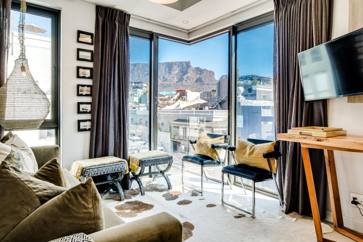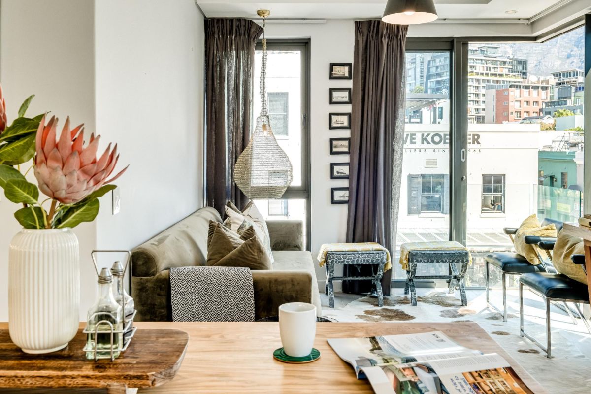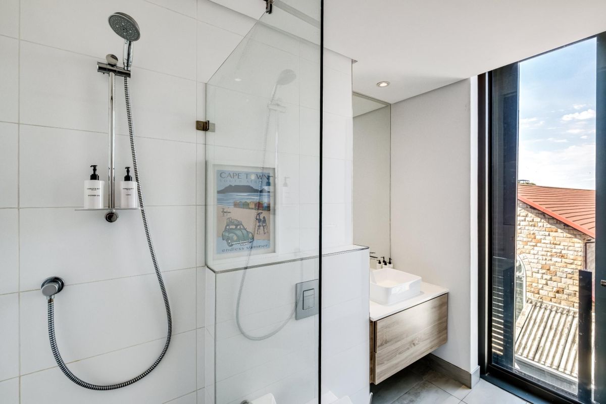Situated in the vibrant heart of De Waterkant, this modern two-bedroom apartment offers stylish city living in a secure building. The open-plan living area is thoughtfully designed with a sleek kitchen, dining bar, and a comfortable lounge featuring a large TV — perfect for relaxing after a day out. Floor-to-ceiling glass doors flood the space with natural light and open onto captivating views of the city skyline and Table Mountain.