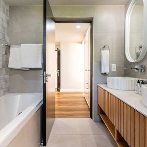 En-suite bathroom with bath, shower, double vanity
