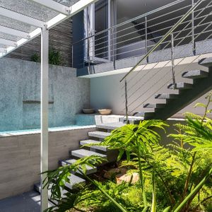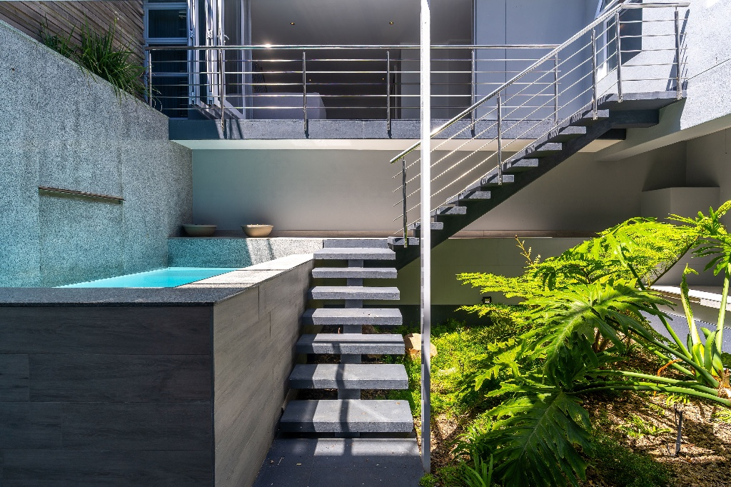 Outside the lounge, stairs lead down to a gorgeously manicured Feng Shui courtyard and a small plunge pool. Cool granite and leafy trees make this peaceful enclave the perfect spot for unwinding.