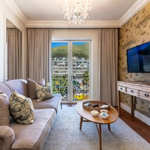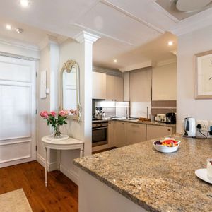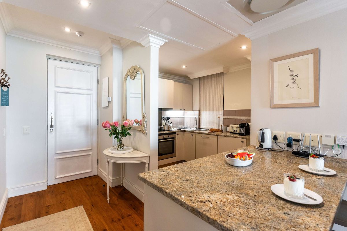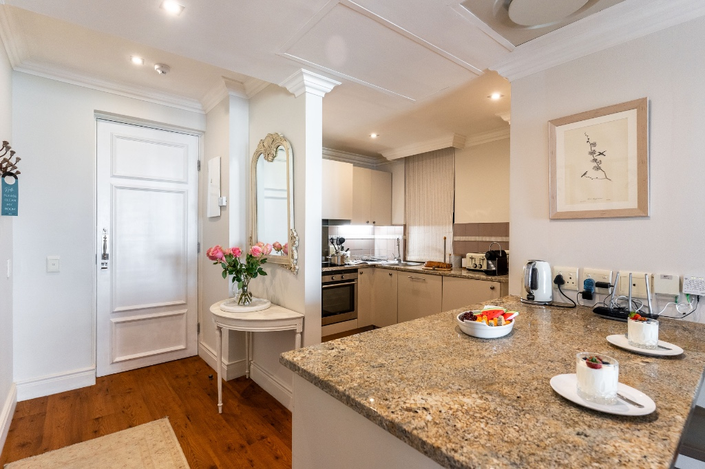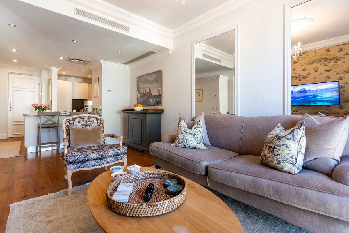 Set within the iconic Cape Royale, a building known for its grand French-inspired façade, this apartment is a serene escape from the city’s pace. Inside, you’ll find a beautifully furnished living area with plush seating and large windows that fill the space with natural light. The fully equipped kitchen is ideal for preparing meals at home, while the bedroom area offers a peaceful retreat after a day of exploring. Every detail has been thoughtfully curated to create a space that feels both luxurious and welcoming.