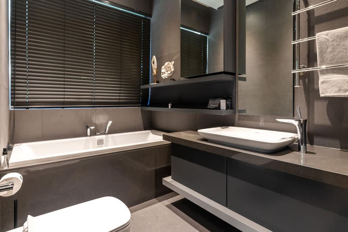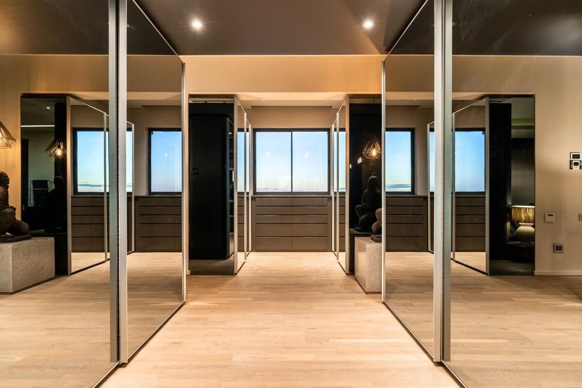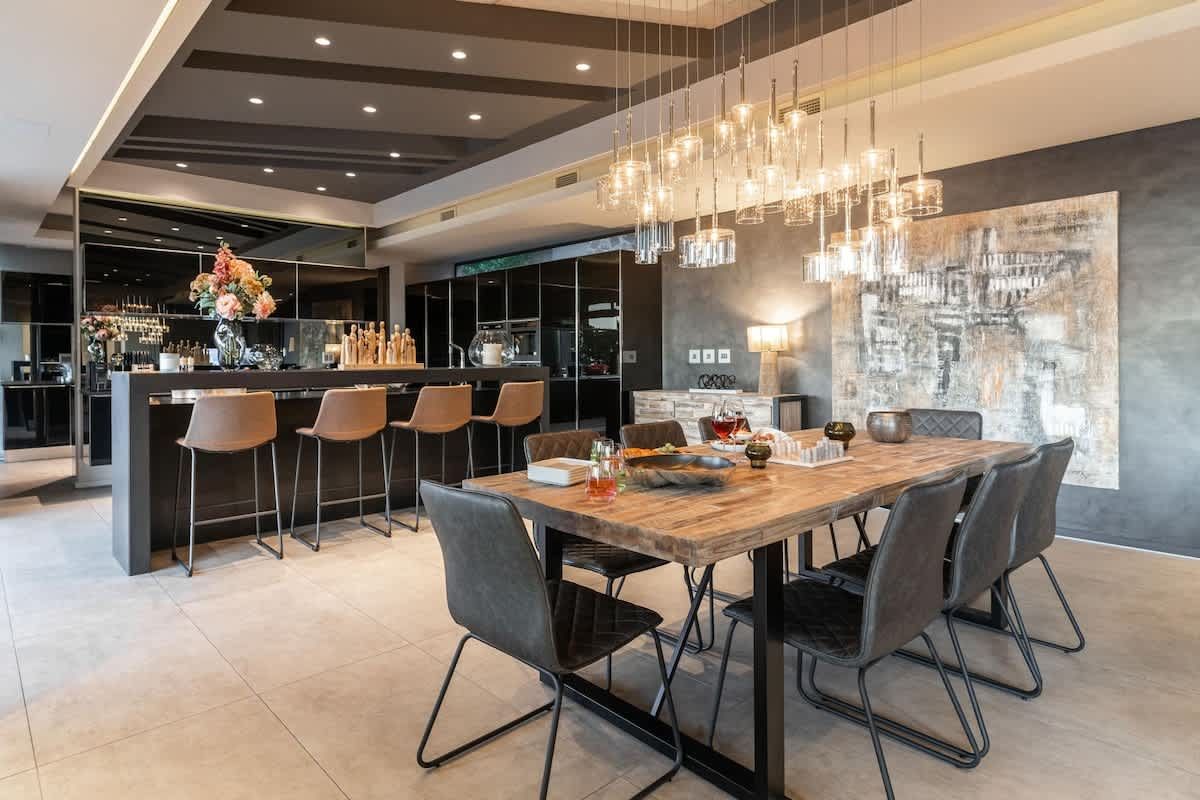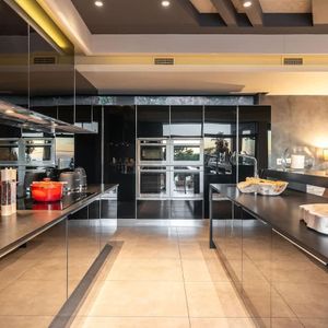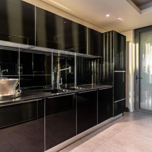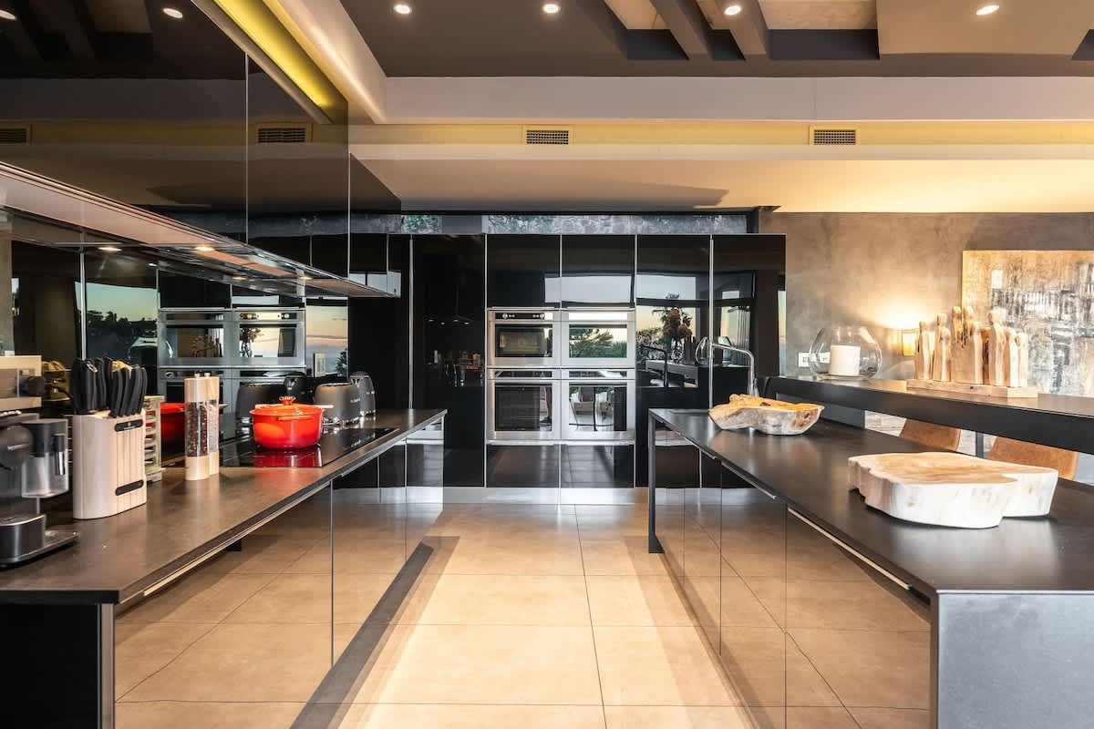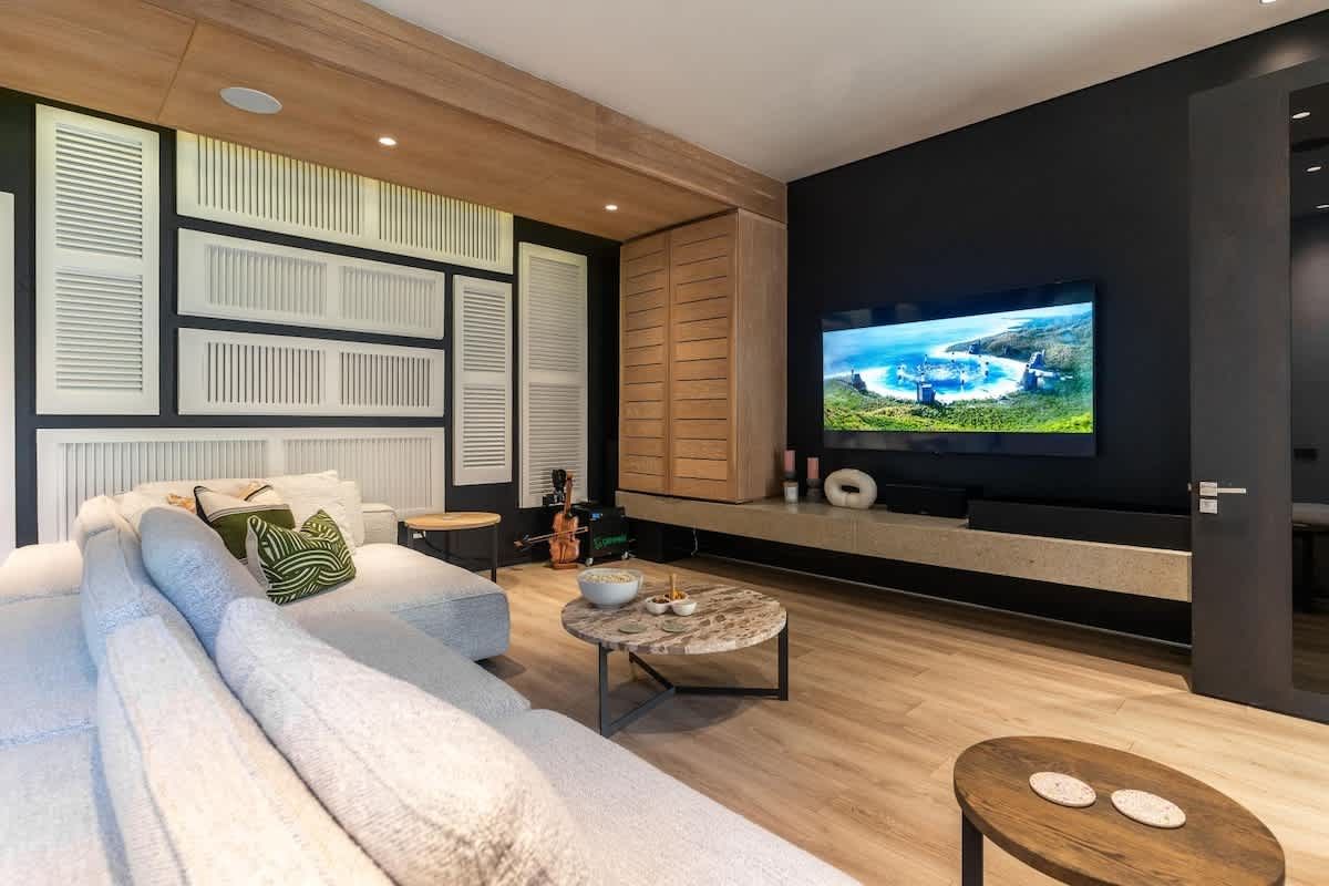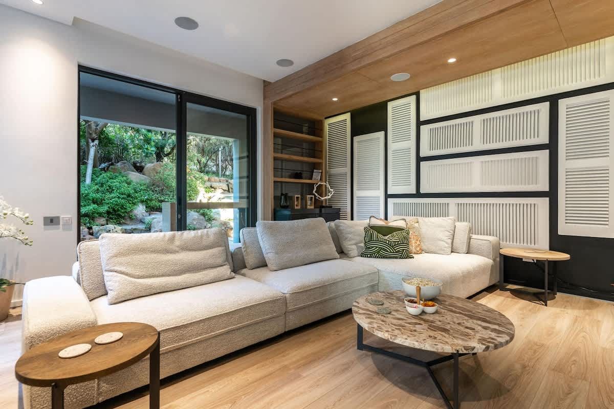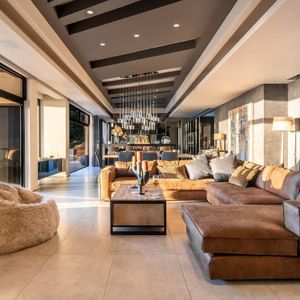 Inside, the expansive lounge and dining area beckon with contemporary décor, plush seating arrangements, and striking artwork. Entertain in style at the 10-12-seater dining table or unwind in the private cinema room. A fully-equipped, state-of-the-art kitchen awaits culinary enthusiasts, complete with a scullery area and separate laundry room.