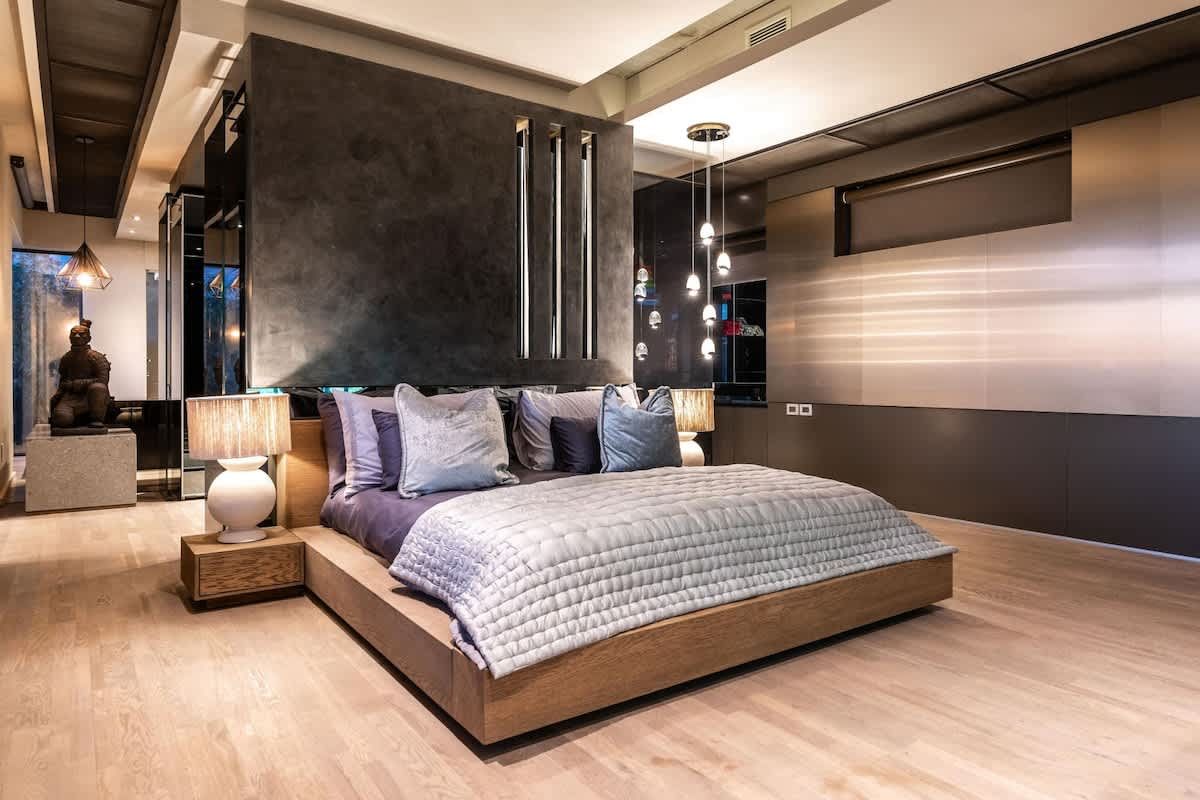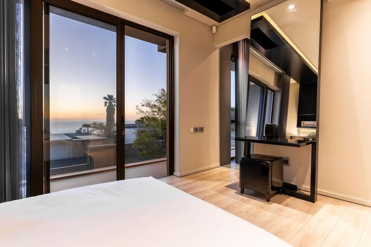A fifth bedroom on the middle level provides privacy and comfort, featuring a queen-size bed, en-suite bathroom, and a private balcony overlooking the azure waters below.