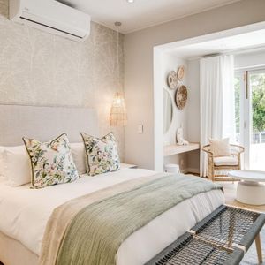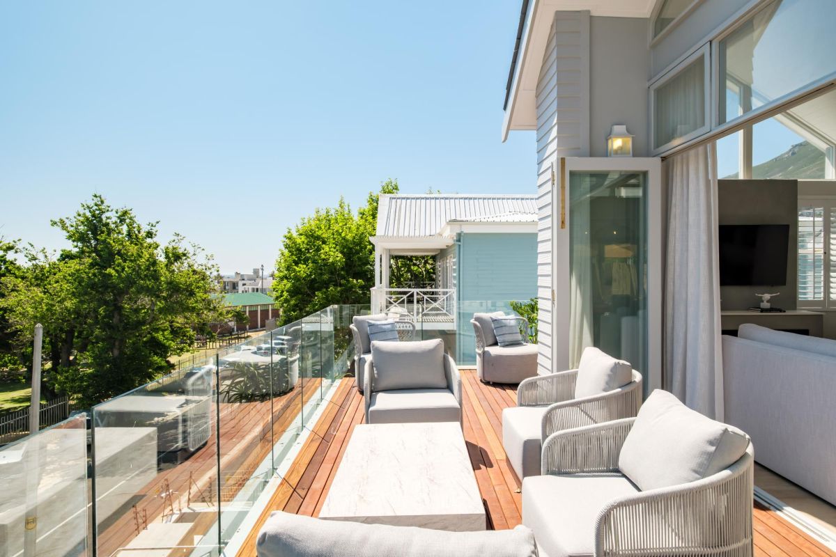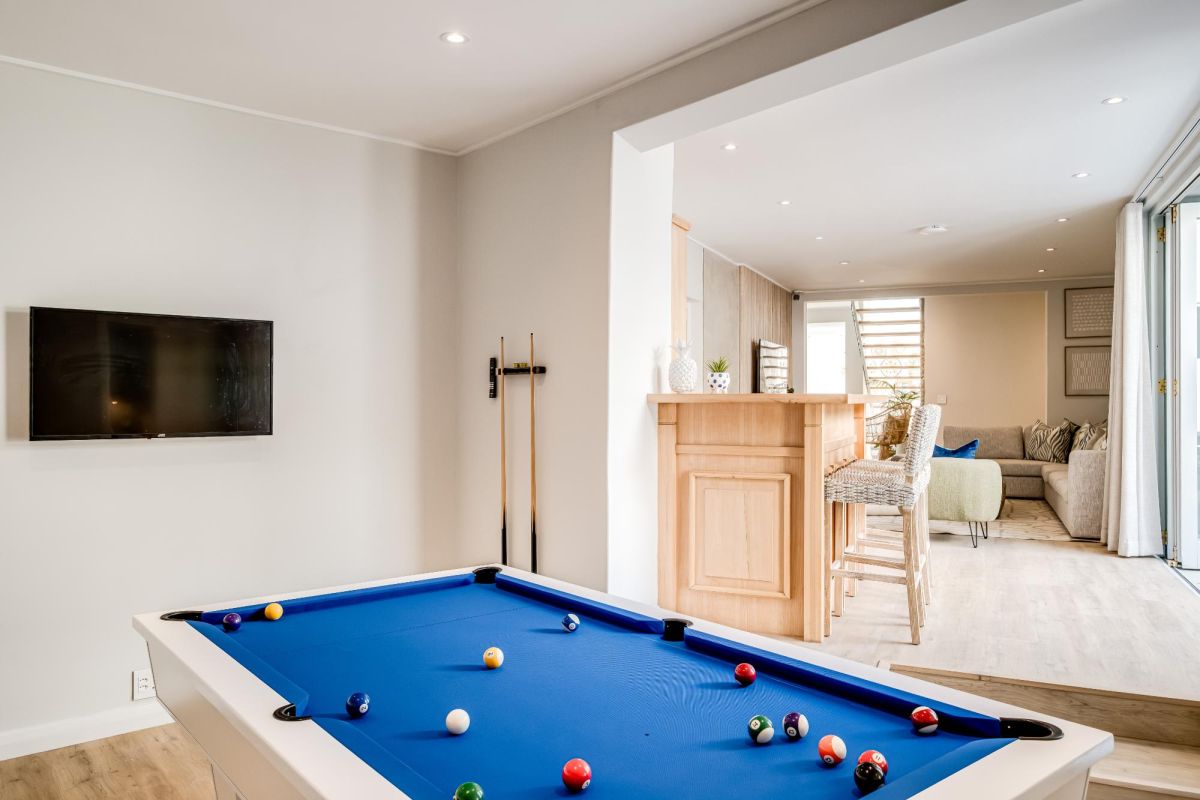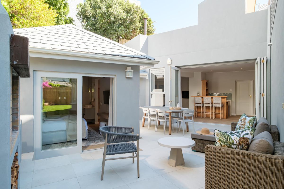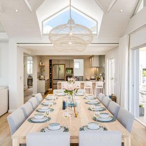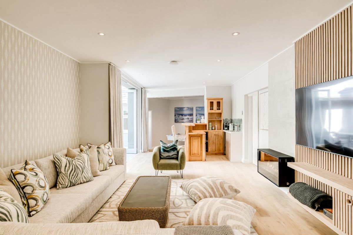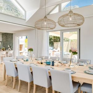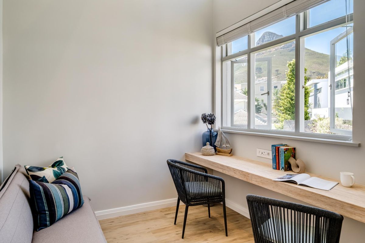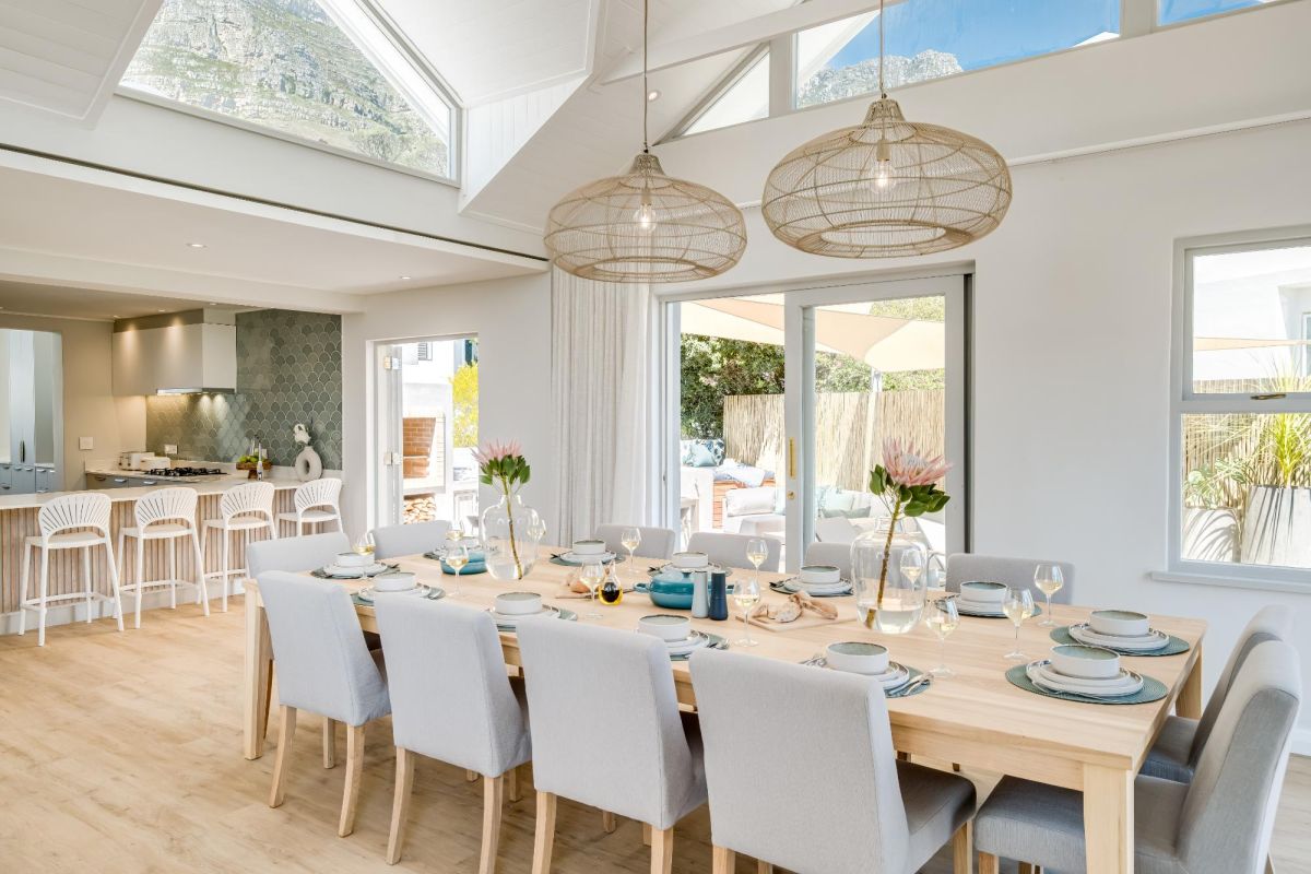 Thoughtfully designed for effortless living, the villa features six ensuite bedrooms—each equipped with air-conditioning, dedicated workspaces, and calming views of the ocean, garden, or Table Mountain. The sleek kitchen, fitted with a gas hob, Nespresso machine, and breakfast bar, flows into a welcoming dining area ideal for leisurely breakfasts or relaxed evening meals.
