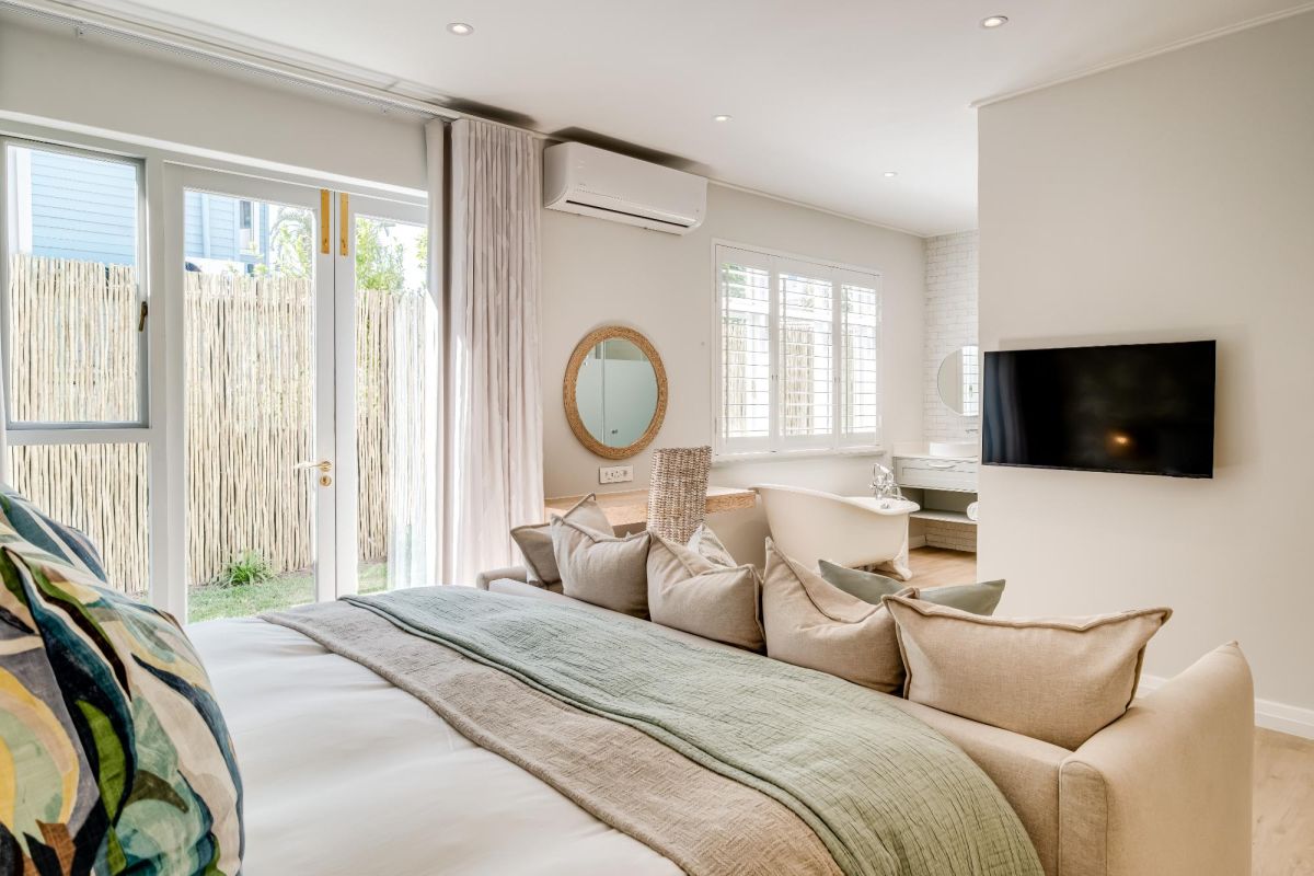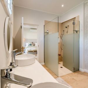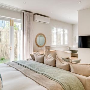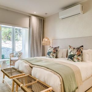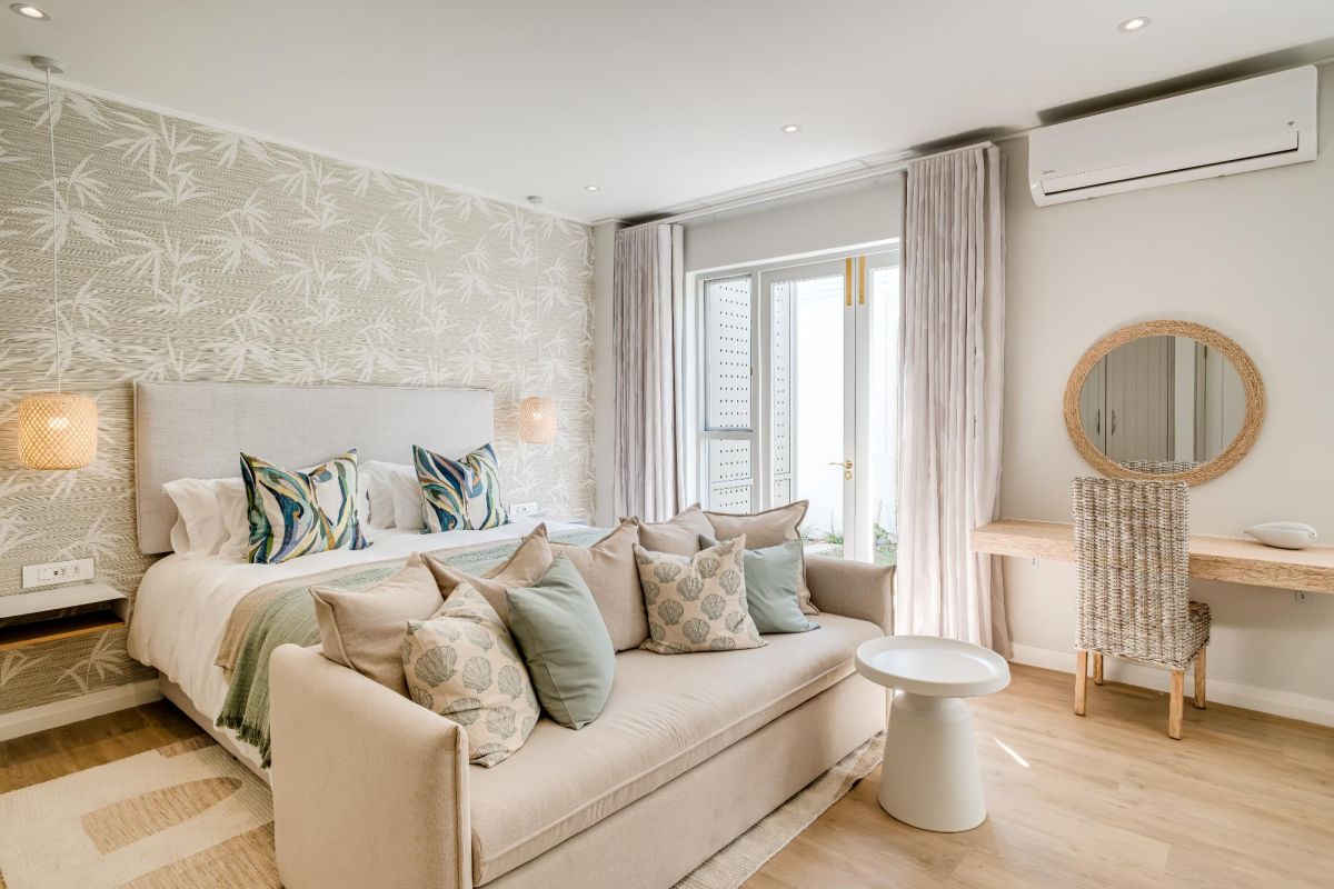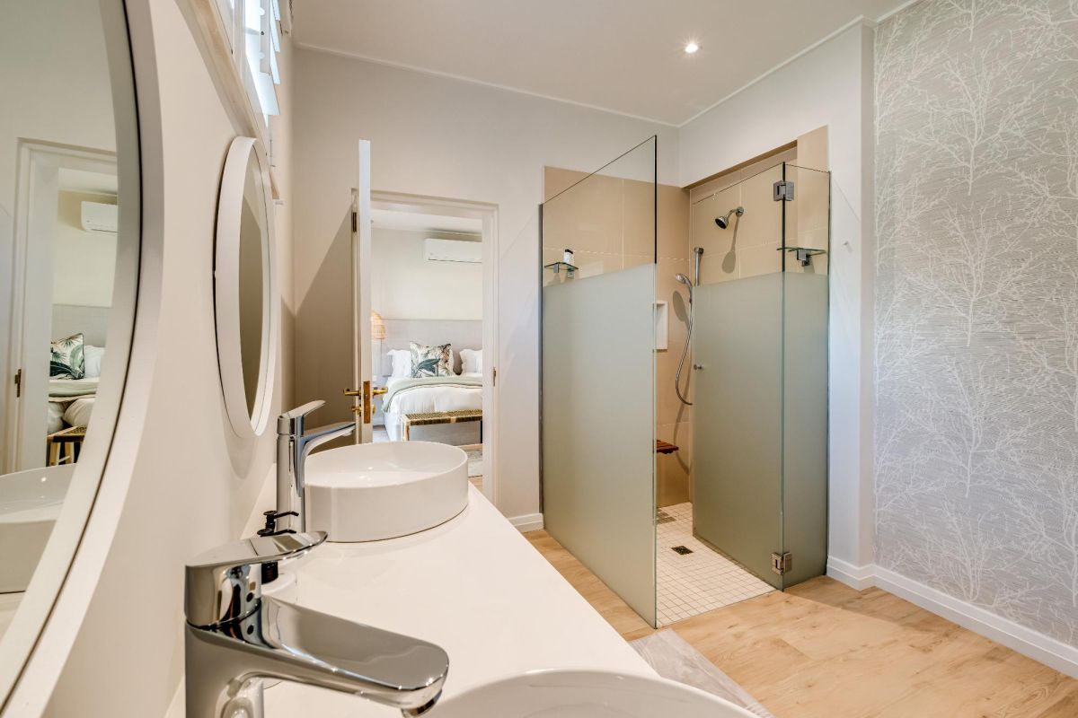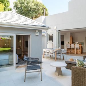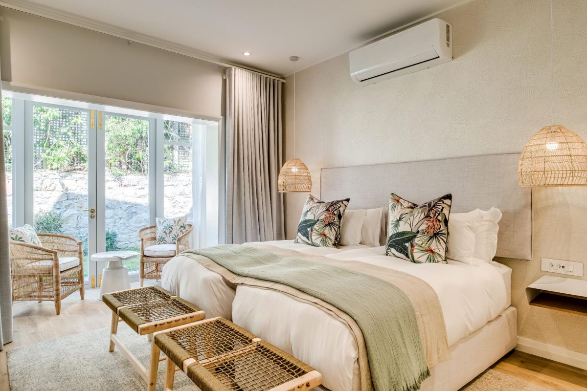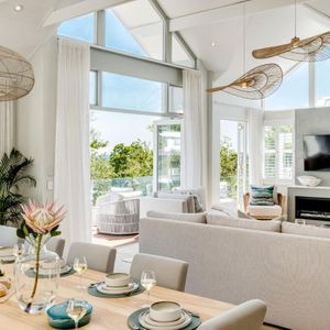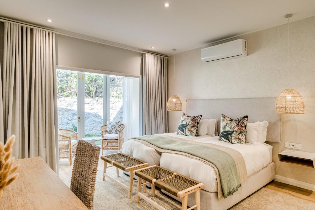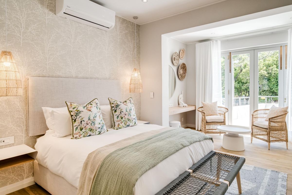 Thoughtfully designed for effortless living, the villa features six ensuite bedrooms—each equipped with air-conditioning, dedicated workspaces, and calming views of the ocean, garden, or Table Mountain. The sleek kitchen, fitted with a gas hob, Nespresso machine, and breakfast bar, flows into a welcoming dining area ideal for leisurely breakfasts or relaxed evening meals.