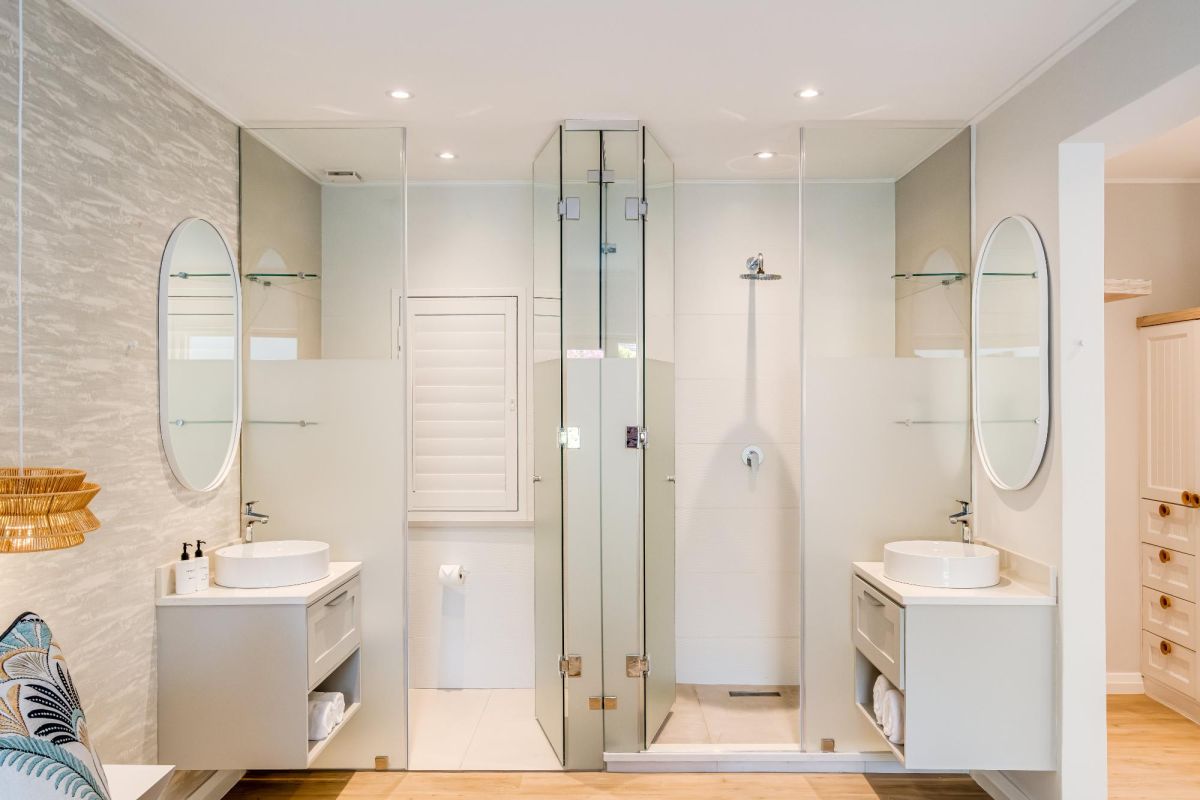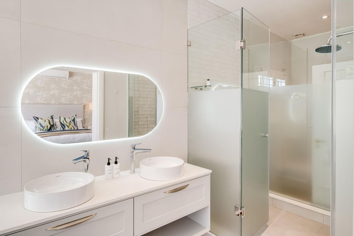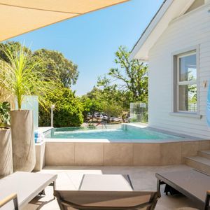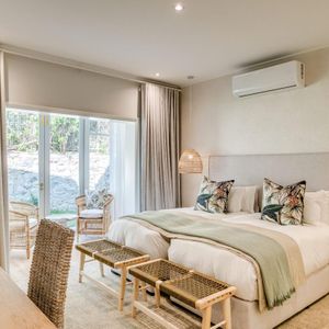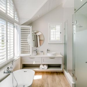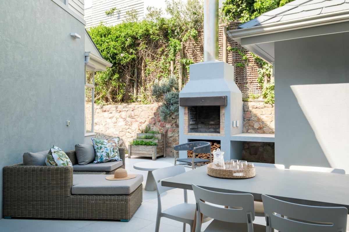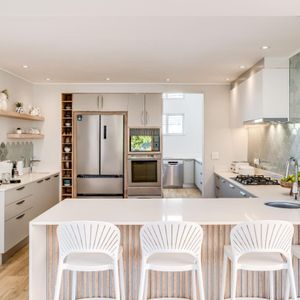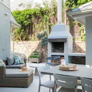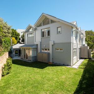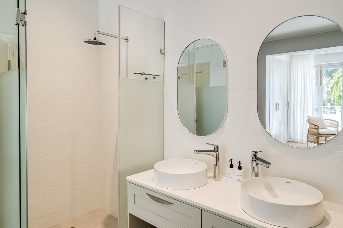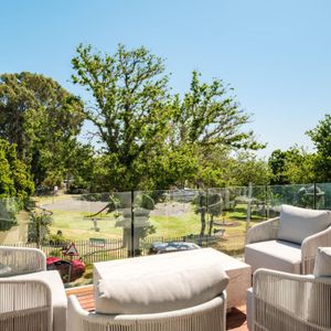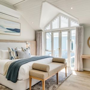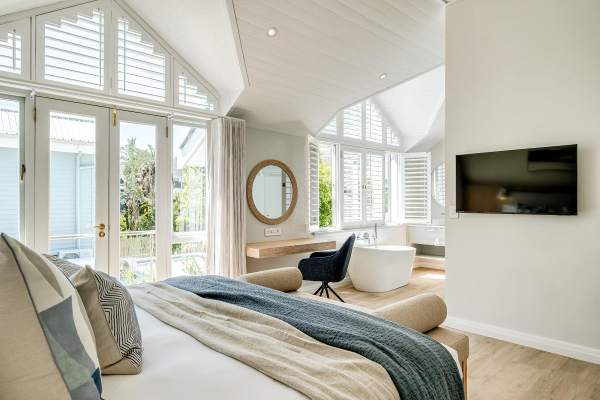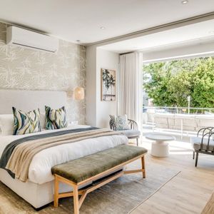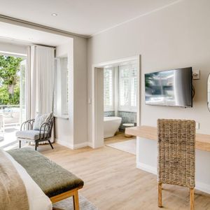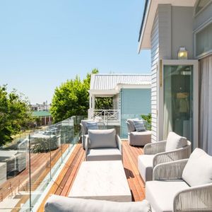 Thoughtfully designed for effortless living, the villa features six ensuite bedrooms—each equipped with air-conditioning, dedicated workspaces, and calming views of the ocean, garden, or Table Mountain. The sleek kitchen, fitted with a gas hob, Nespresso machine, and breakfast bar, flows into a welcoming dining area ideal for leisurely breakfasts or relaxed evening meals.