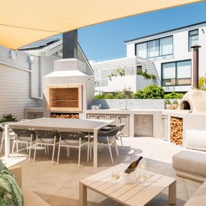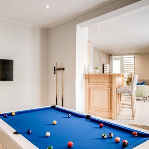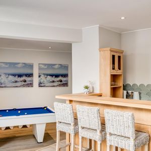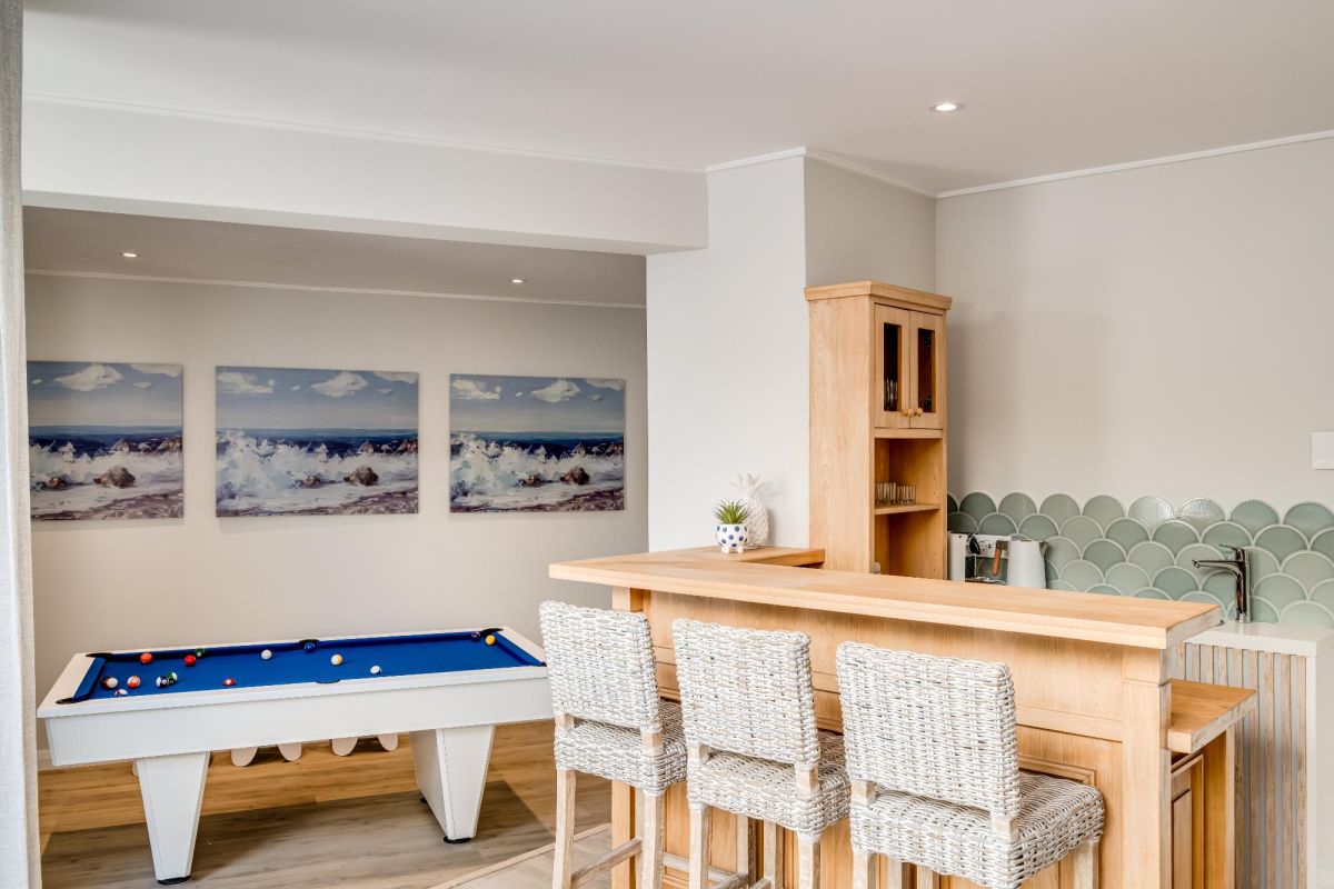 Generous open-plan living spaces extend to sun-drenched terraces, while the entertainment lounge—with its bar, pool table, and fireplace—creates a laid-back social hub. Outdoors, a sparkling pool, pizza oven, and alfresco dining areas invite long summer afternoons beneath the mountain’s gaze.
