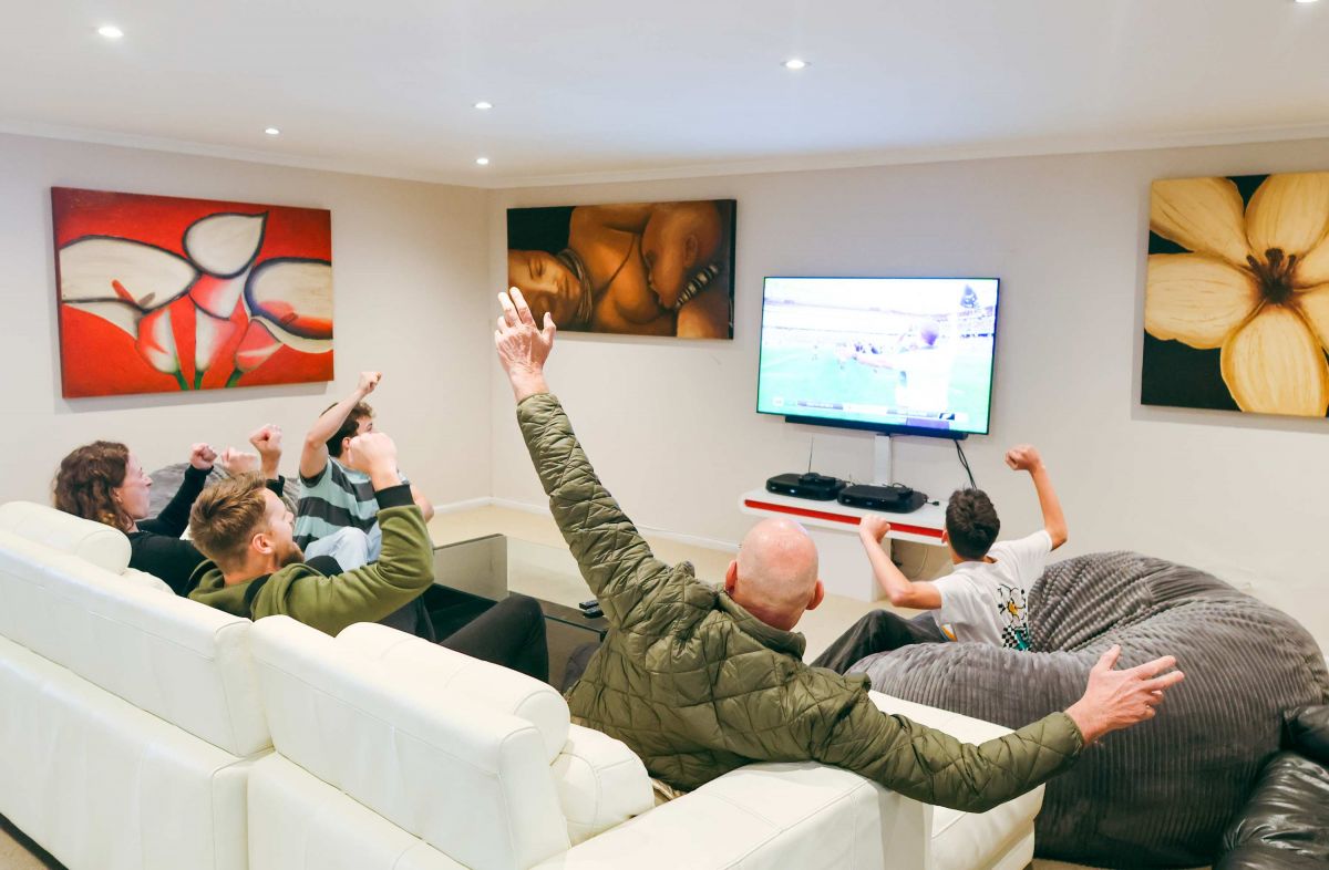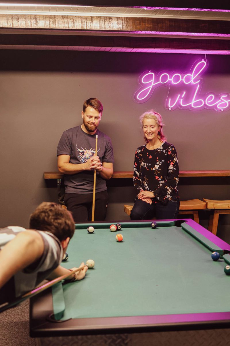 On the upper level, the double garage has been transformed into a large games room, creating a vibrant recreational hub with a pool table, foosball, table tennis, dartboard and a small bar area. The entrance hall features secure double doors that provide both safety and shelter from the Cape winds. All seven bedrooms are located on this level, positioned across split landings for added privacy.