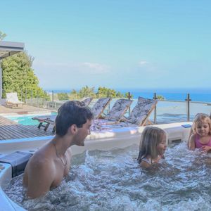 The master suite is furnished with a king-size bed and has an open-plan bathroom featuring a bath, shower, bidet and double vanity, as well as access to a balcony shared with the second bedroom. The second bedroom is en-suite with a shower and single vanity. The third bedroom also has an en-suite with a shower and single vanity. The fourth and fifth bedrooms each offer double beds, en-suite showers and access to a balcony with sweeping sea views. The sixth bedroom is situated on a slightly lower landing and has its own entrance, security system, kitchenette and a dedicated bathroom. The seventh bedroom is well suited to teenagers, offering a double bed, double sleeper couch and an en-suite bathroom with a bath, shower and single vanity. All bedrooms are air-conditioned.