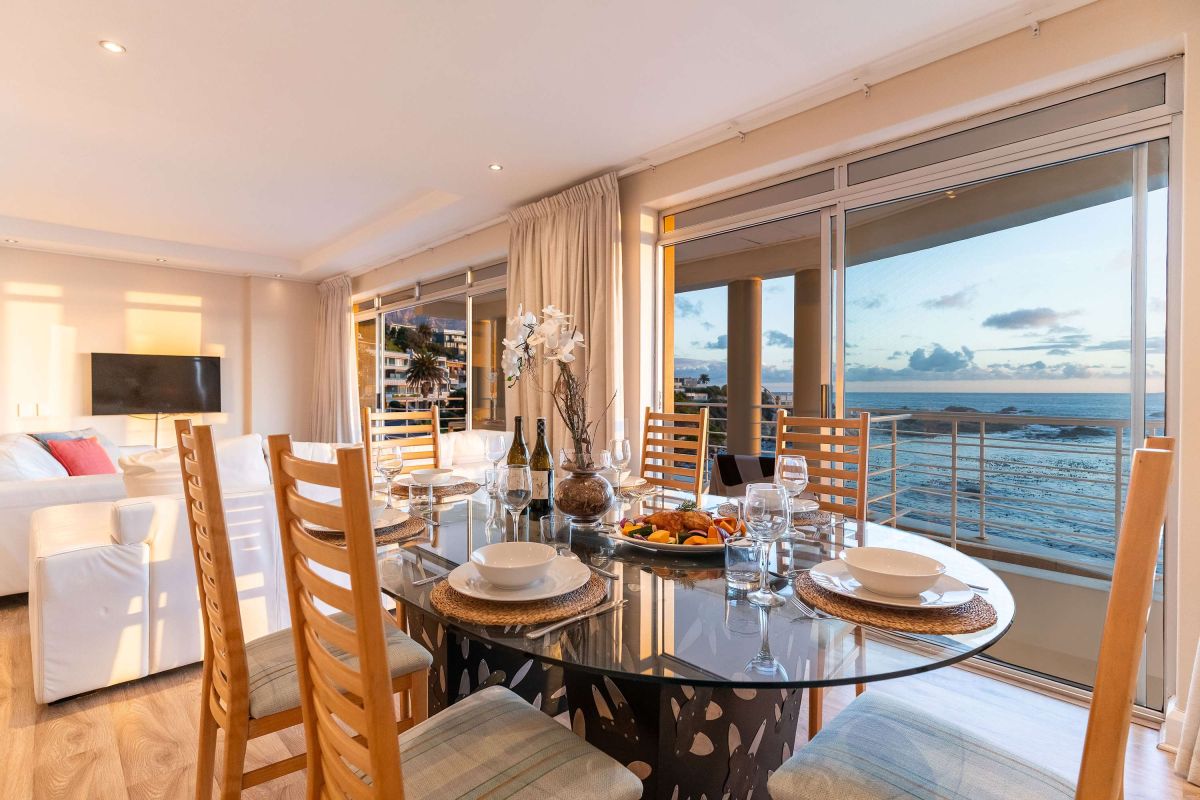 Designed for relaxation and effortless living, the apartment features a spacious open-plan layout that seamlessly connects the fully equipped kitchen, dining area, and lounge to a wide terrace overlooking the sea. Whether you're enjoying a sunset dinner at the outdoor table or unwinding in the lounge with the sliding doors open to the ocean breeze, every moment here is framed by the beauty of Camps Bay’s coastline.