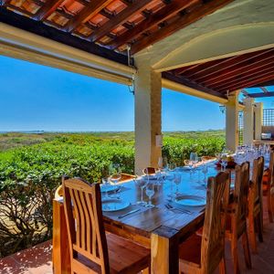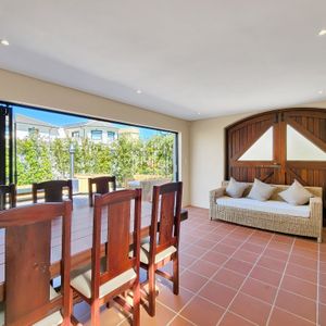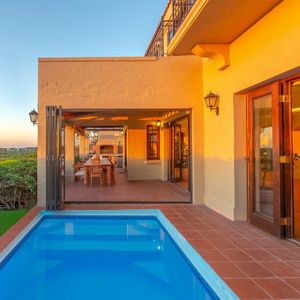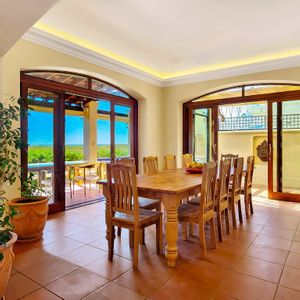 Outdoors, the villa’s al fresco dining area overlooks a sparkling heated pool, offering a sublime setting for morning breakfasts or sunset dinners. Whether you're sipping coffee at dawn or toasting under twilight skies, this elegant space blends comfort and style for memorable moments.