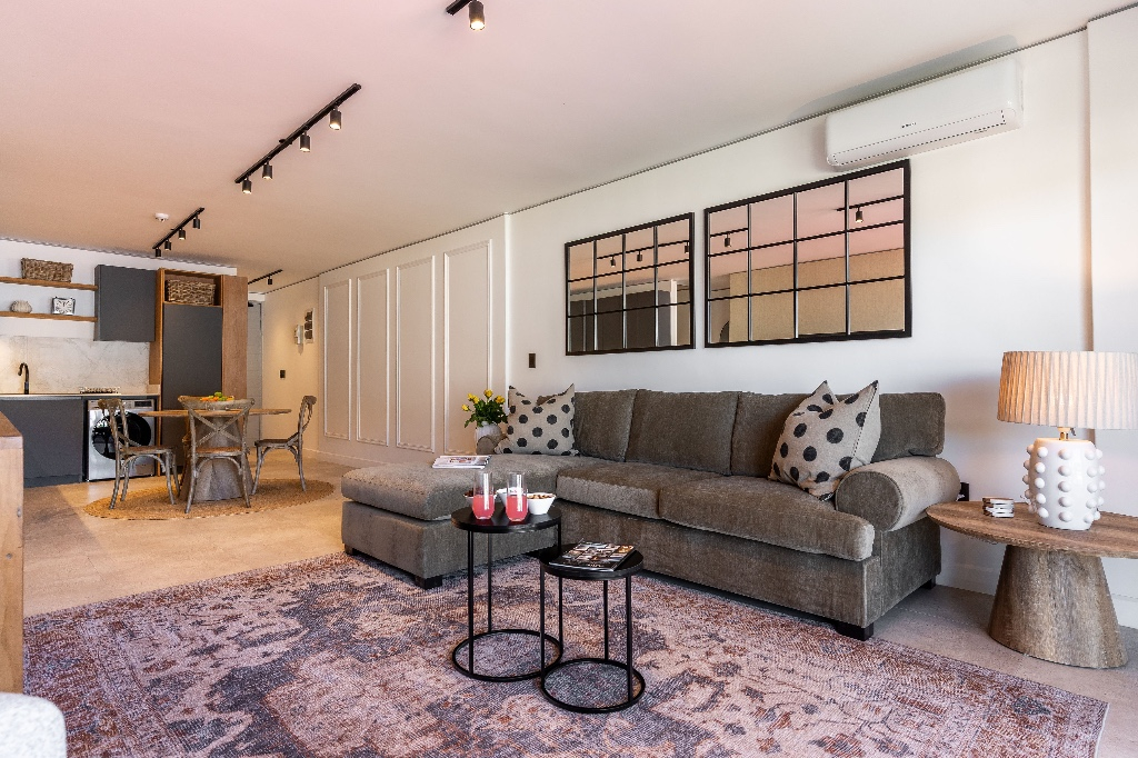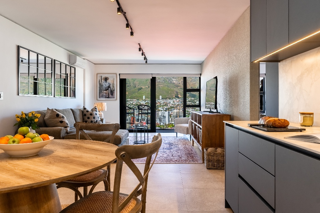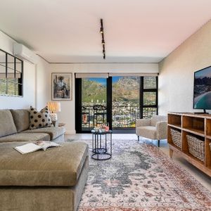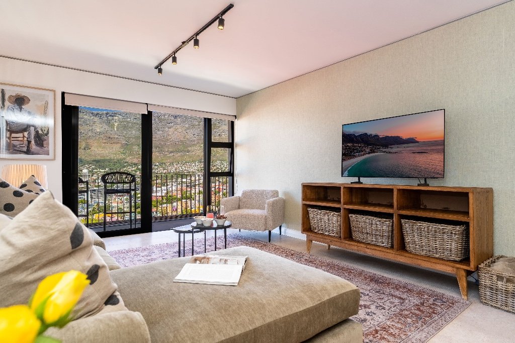 Start your day with breathtaking views from the private balcony — Table Mountain rising majestically above the skyline, a view that never gets old. The open-plan living area is flooded with natural light, creating a warm and welcoming space to relax, entertain, or simply soak in the atmosphere.