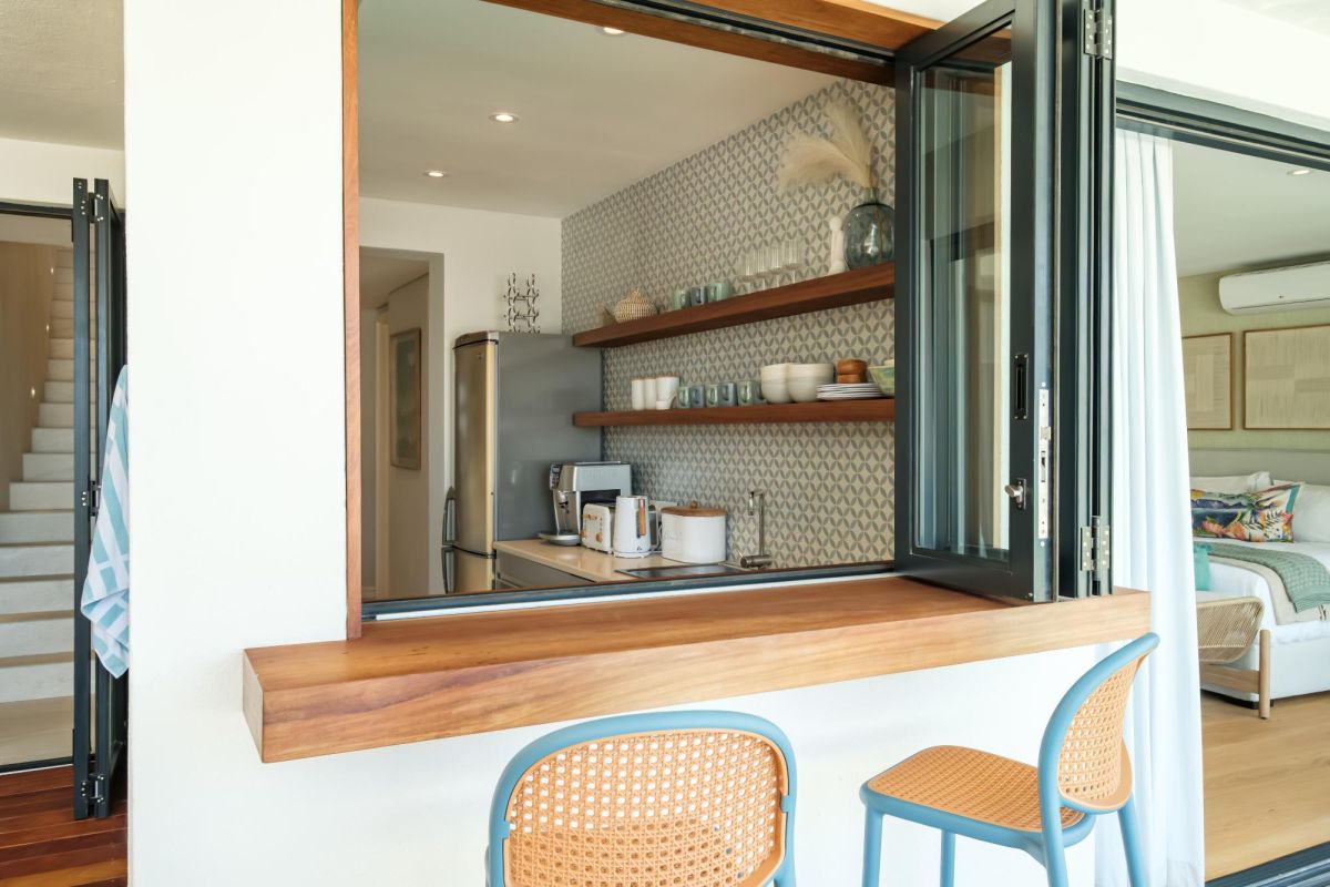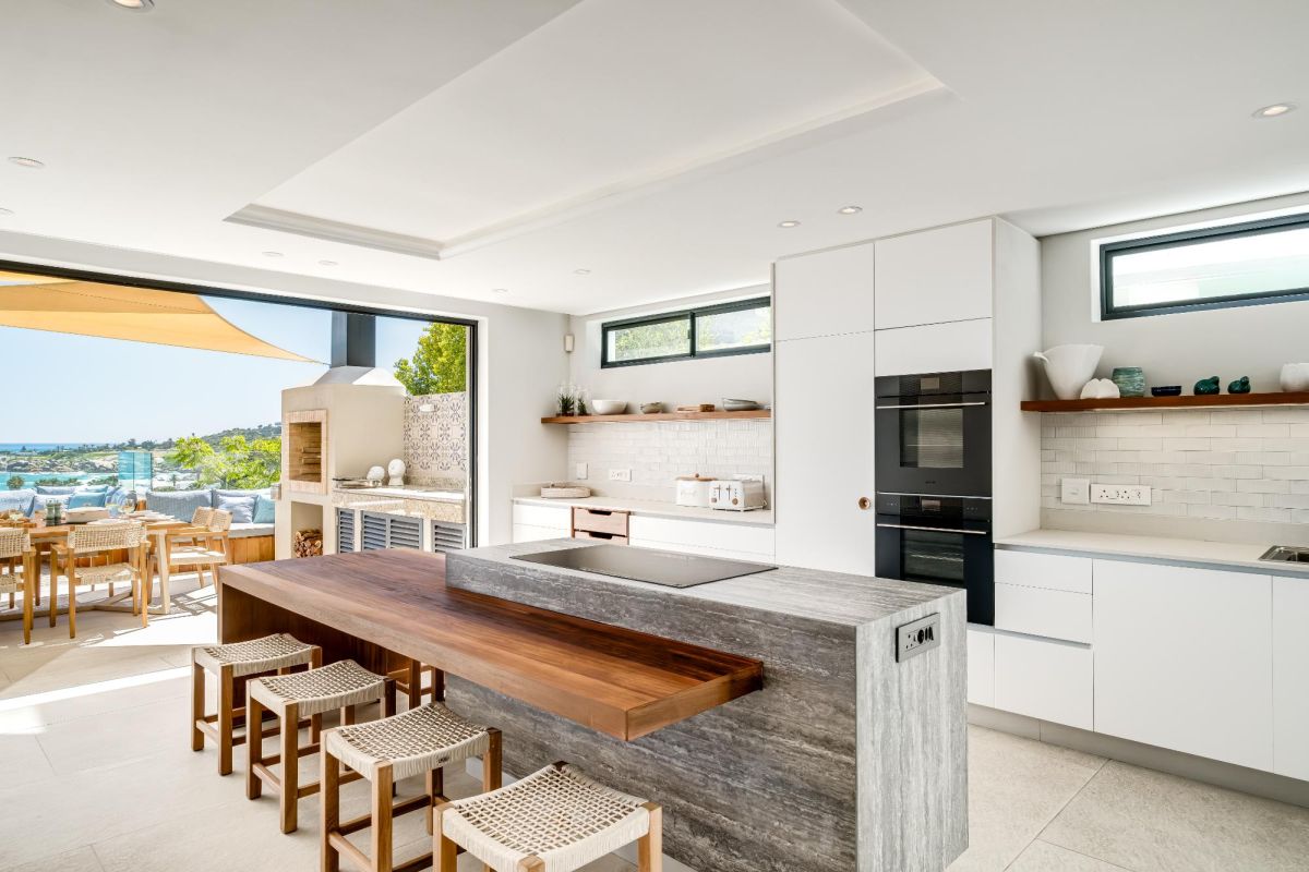 The villa’s main living and dining areas provide seating for eight, a wood fireplace, dining for twelve, and balcony access with sweeping sea and mountain views. A fully equipped kitchen with electric hob, Nespresso and bean coffee machines, blender, and bar seating for six ensures effortless entertaining.