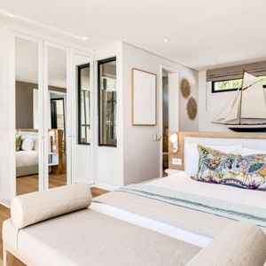 The main bedroom features a king-size bed, air conditioning, a Juliette balcony, and an open ensuite. Additional bedrooms offer queen or twin beds, air conditioning, desks, TVs, private balconies, and ensuite bathrooms. A sixth bedroom, located on the lowest floor with separate access, includes its own deck, kitchen, dining for four, and lounge seating.