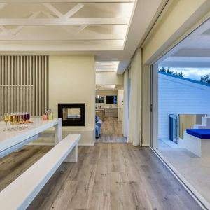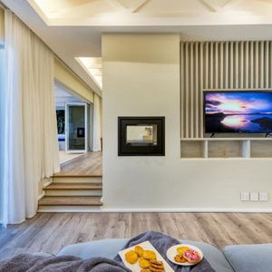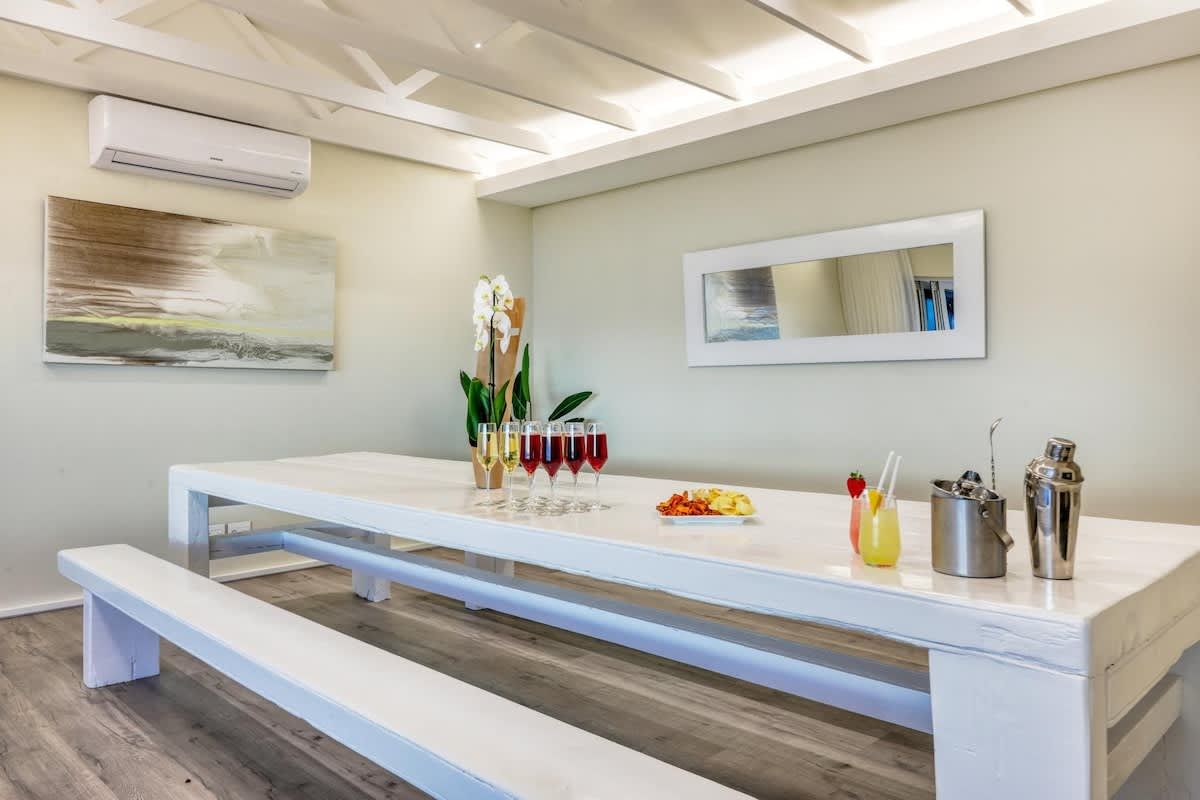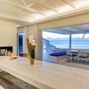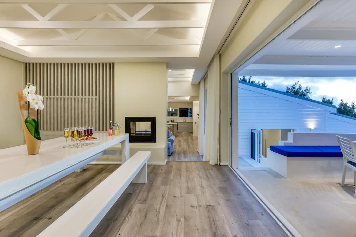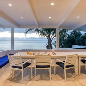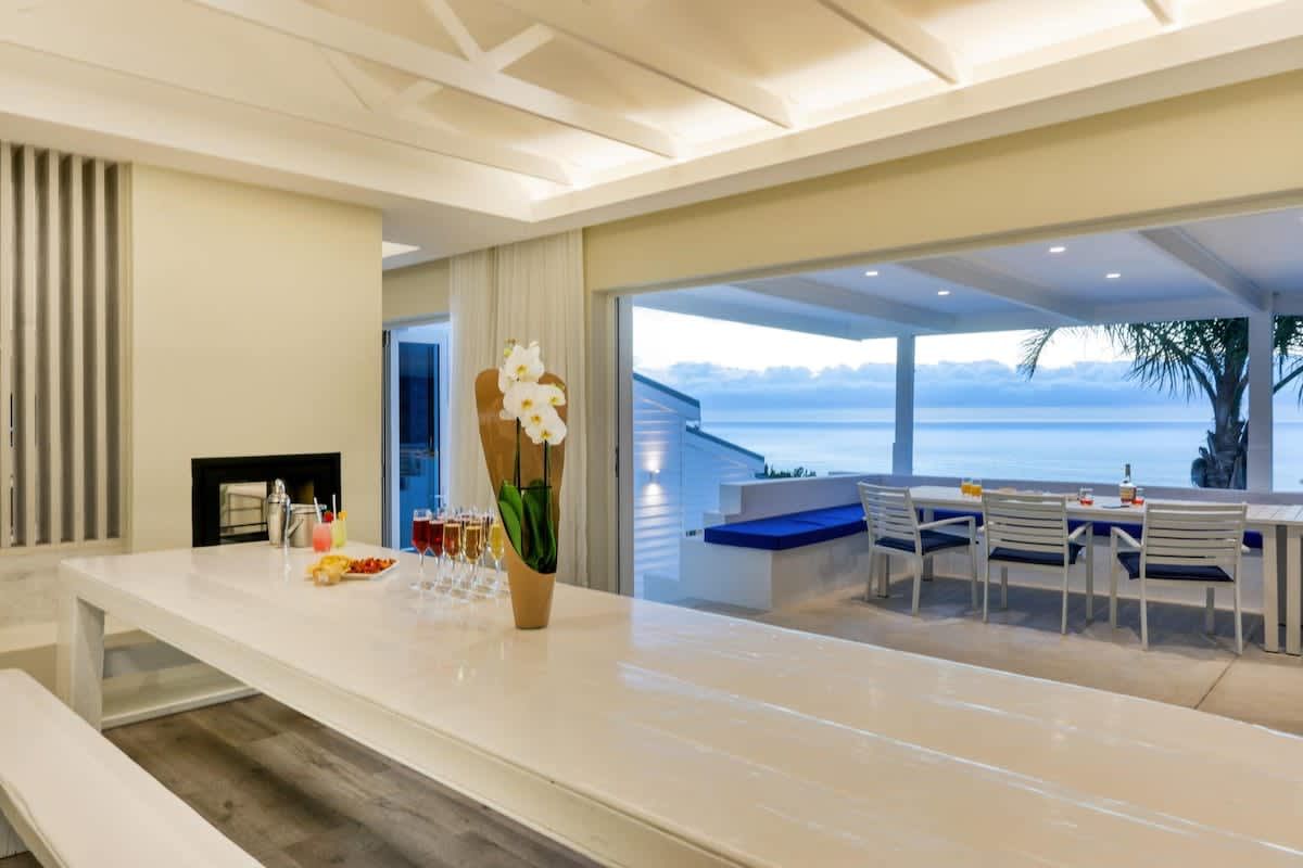 The villa has a spacious and fully equipped kitchen with state-of-the-art amenities, including a dishwasher, washing machine, tumble dryer, and Nespresso machine. The open-plan dining area seats 16 for dinner and seamlessly connects with the outdoor dining terrace through floor-to-ceiling glass sliding doors. A contemporary-chic lounge has a wood-burning fireplace and satellite television and has access to the outdoor dining terrace with stunning ocean views.