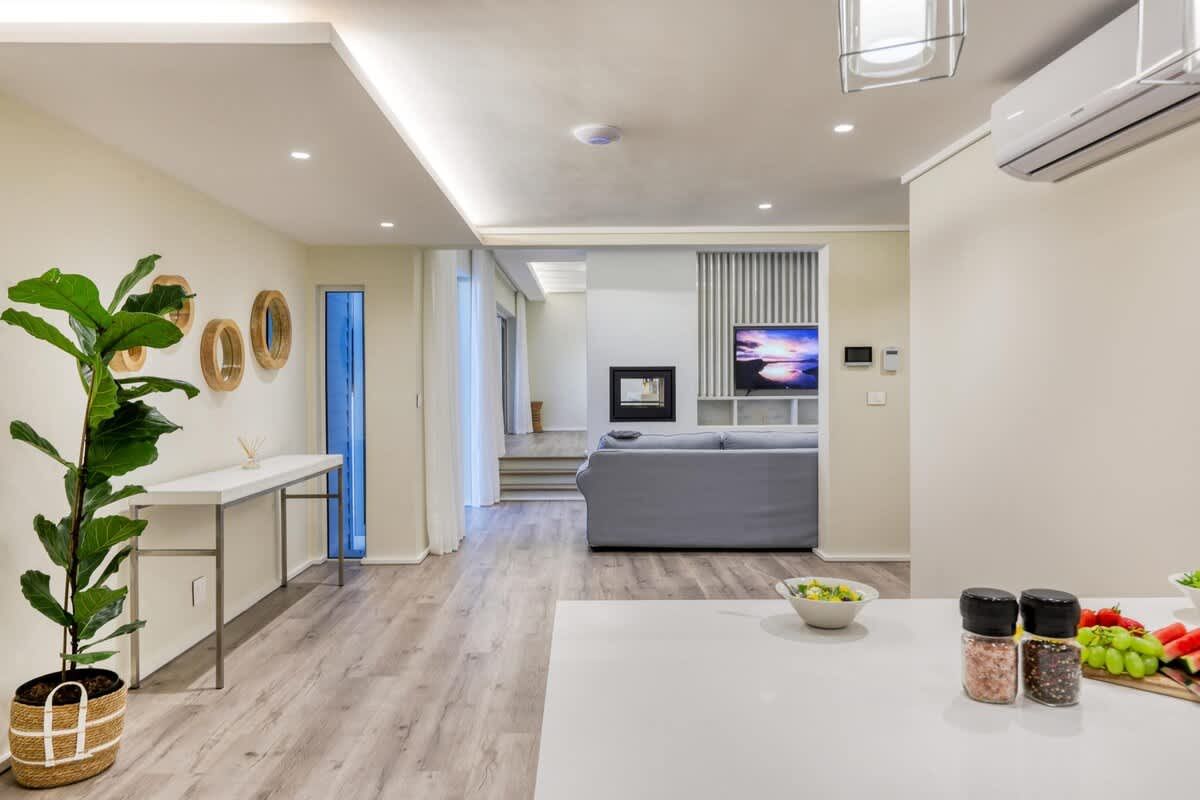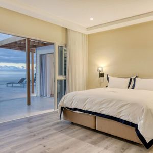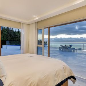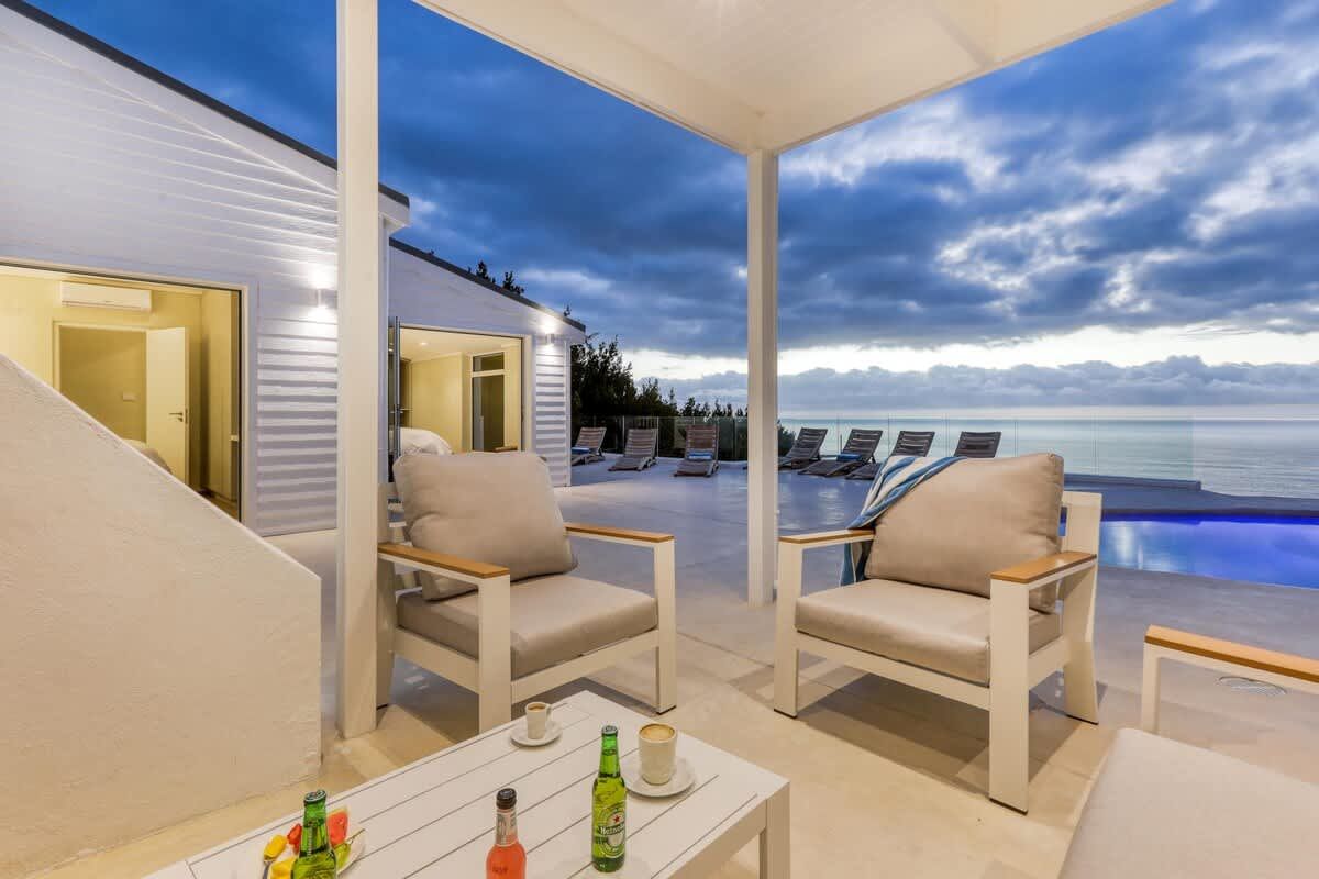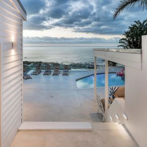 Spectacular sea views float through spacious, open-plan living spaces and out onto wide, embracing terraces that seemingly connect with the sea. Contemporary-chic décor enhances the beach-house appeal, while minimalist hues of white and cream allow the myriad of blues in the ocean views to be the central focus.