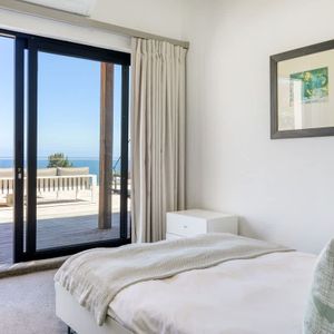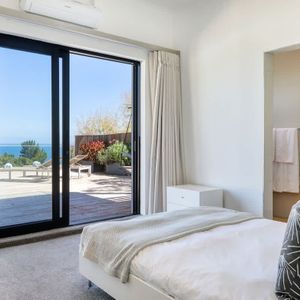 The lounge has a modern large screen TV and big comfy couches to relax in. A pebble fireplace makes it an ideal space for those cold winter nights. All three bedrooms are sea-facing, two bedrooms are located downstairs (one of which has an en-suite bathroom) and the master bedroom is located on the upper level (also with en-suite bathroom). The outdoor area has a large private deck that is ideal for those that love entertaining and is the perfect sundowner spot.